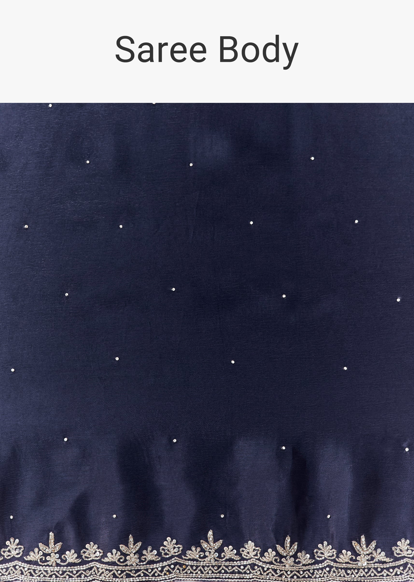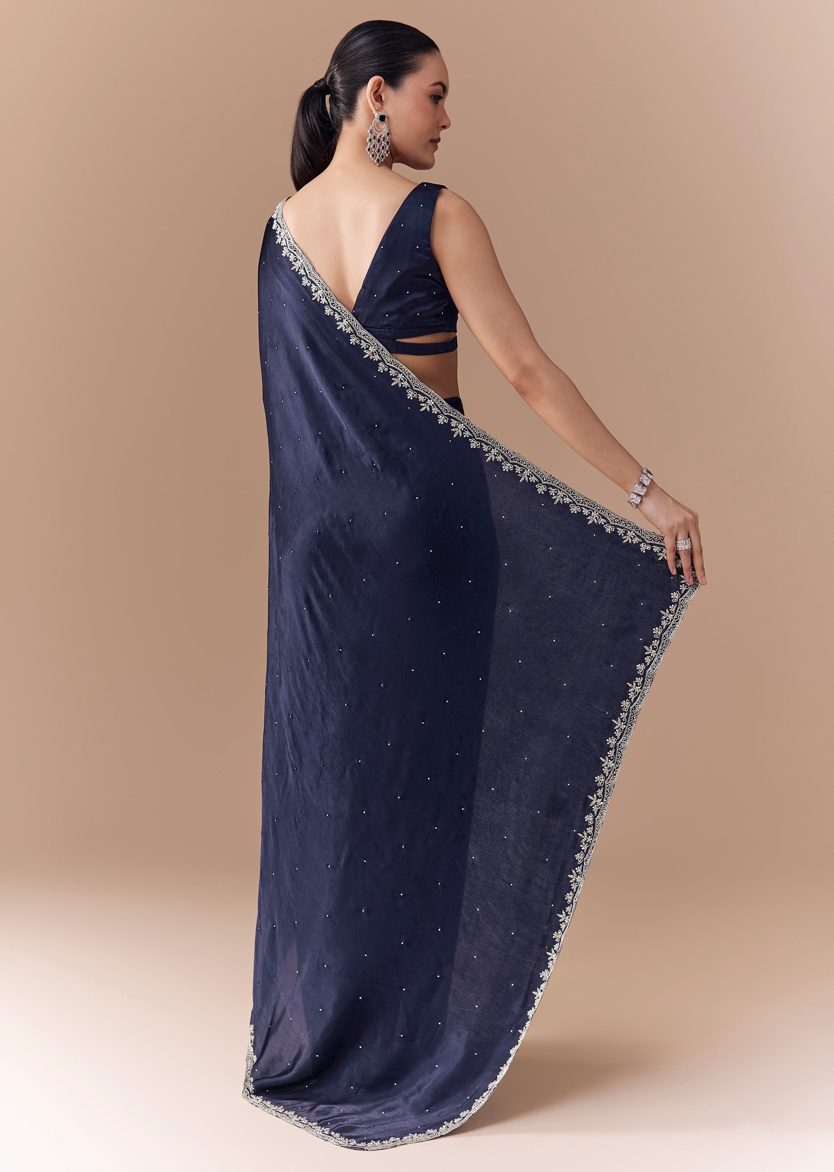 Step into refined elegance with this navy chinon saree, beautifully embellished with sparkling stones all over. The border is intricately embroidered with cutdana and sequins, adding a subtle shimmer to its rich, flowing texture. Perfect for weddings, evening parties, or festive celebrations, this saree combines luxurious craftsmanship with timeless sophistication. Awarded as the Most Trusted Brand, we're delivering styles you love, just as promised.