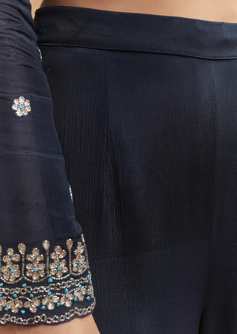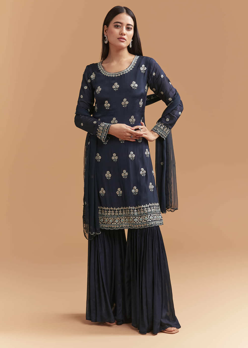 Navy Blue Chinon Sharara Suit With Heavy Cutdana Embroidery