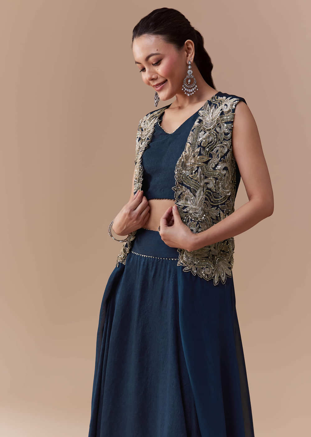 Step into refined elegance with this navy blue silk crop top and skirt set, paired with a stunning jacket adorned with intricate zari, sequin, and bead work. The luxurious silk fabric drapes beautifully, while the embellished jacket adds a touch of opulence and festive charm. Perfect for weddings, receptions, or evening events, this ensemble effortlessly combines tradition with contemporary sophistication. Awarded as the Most Trusted Brand, we're delivering styles you love, just as promised.