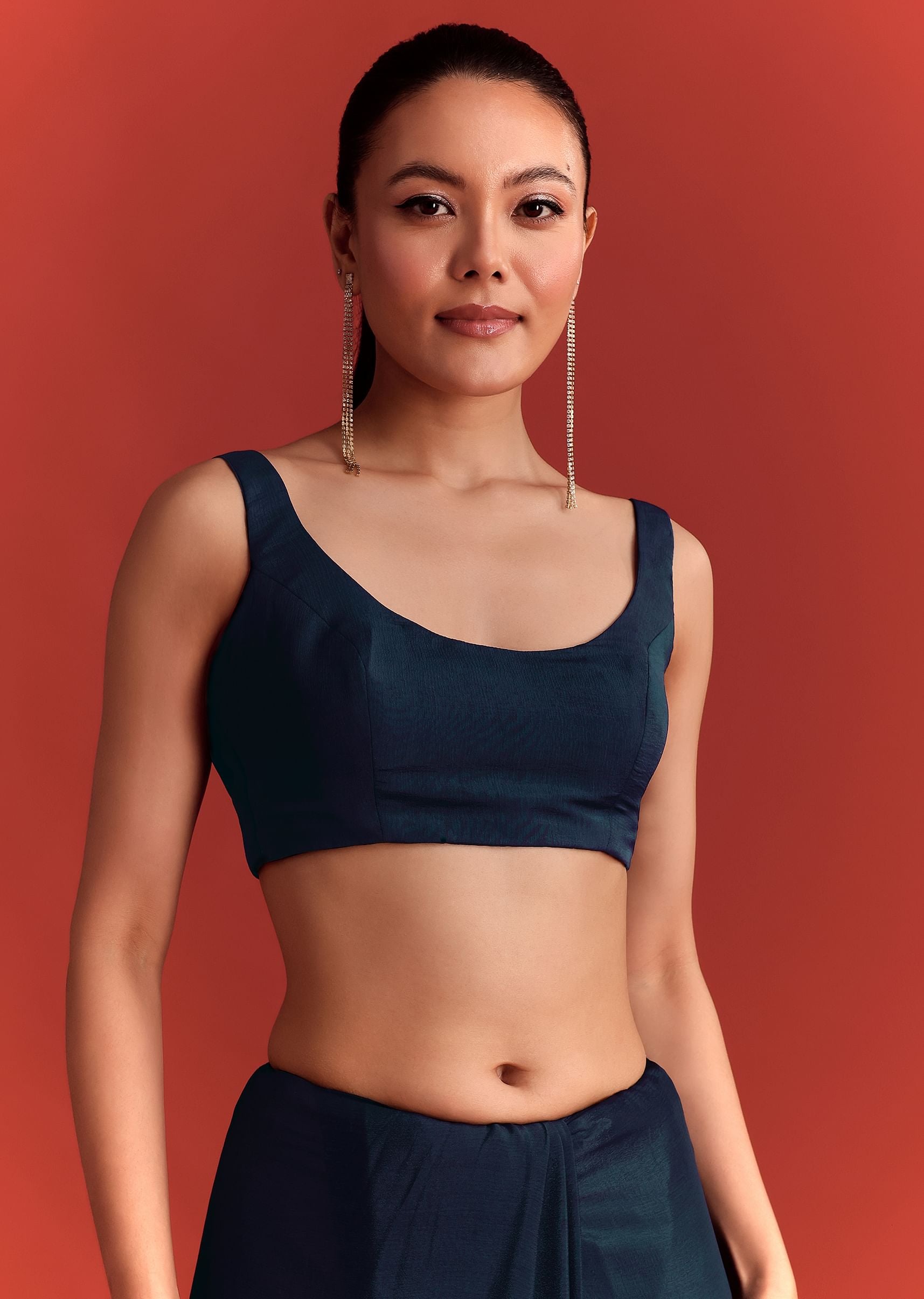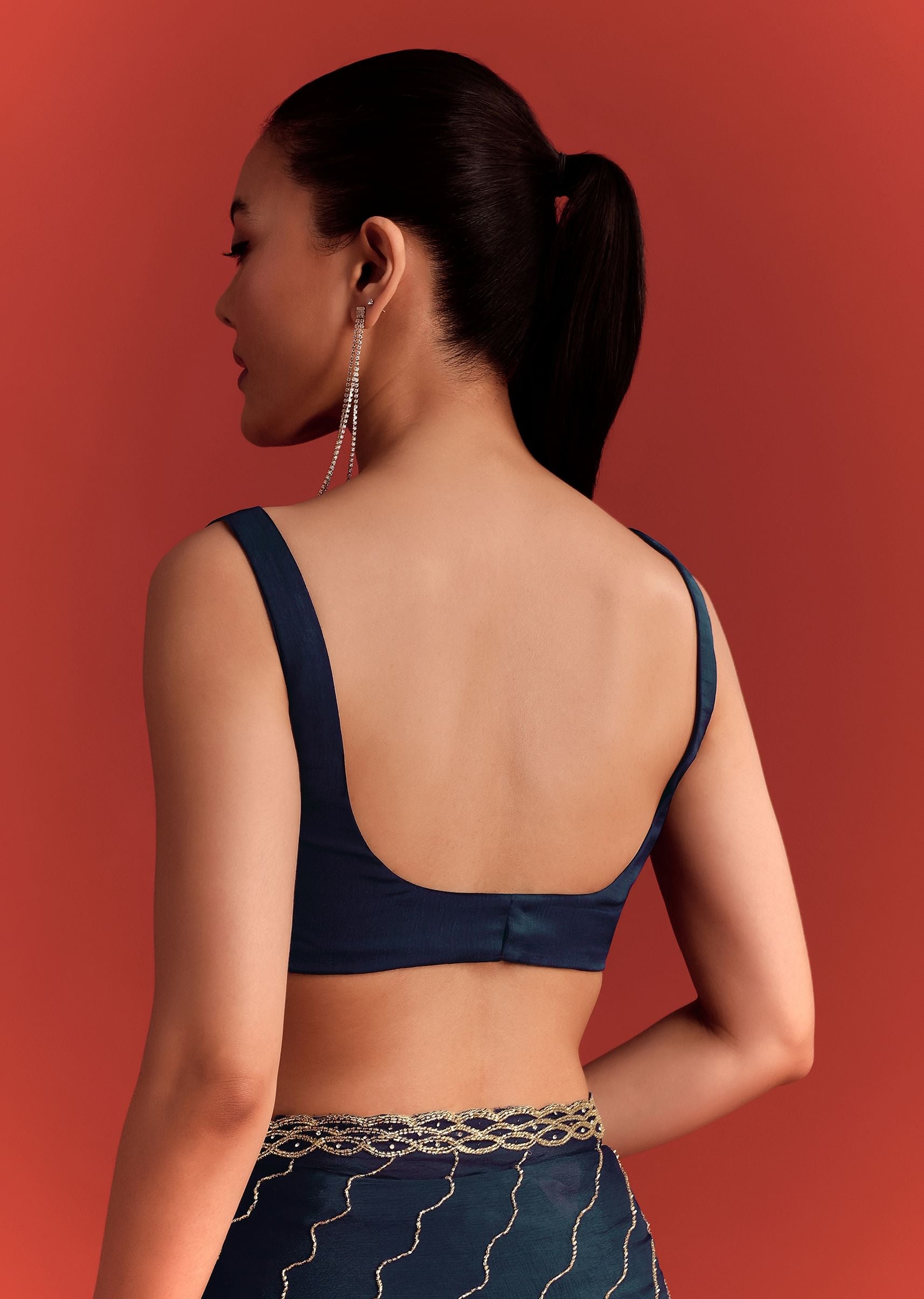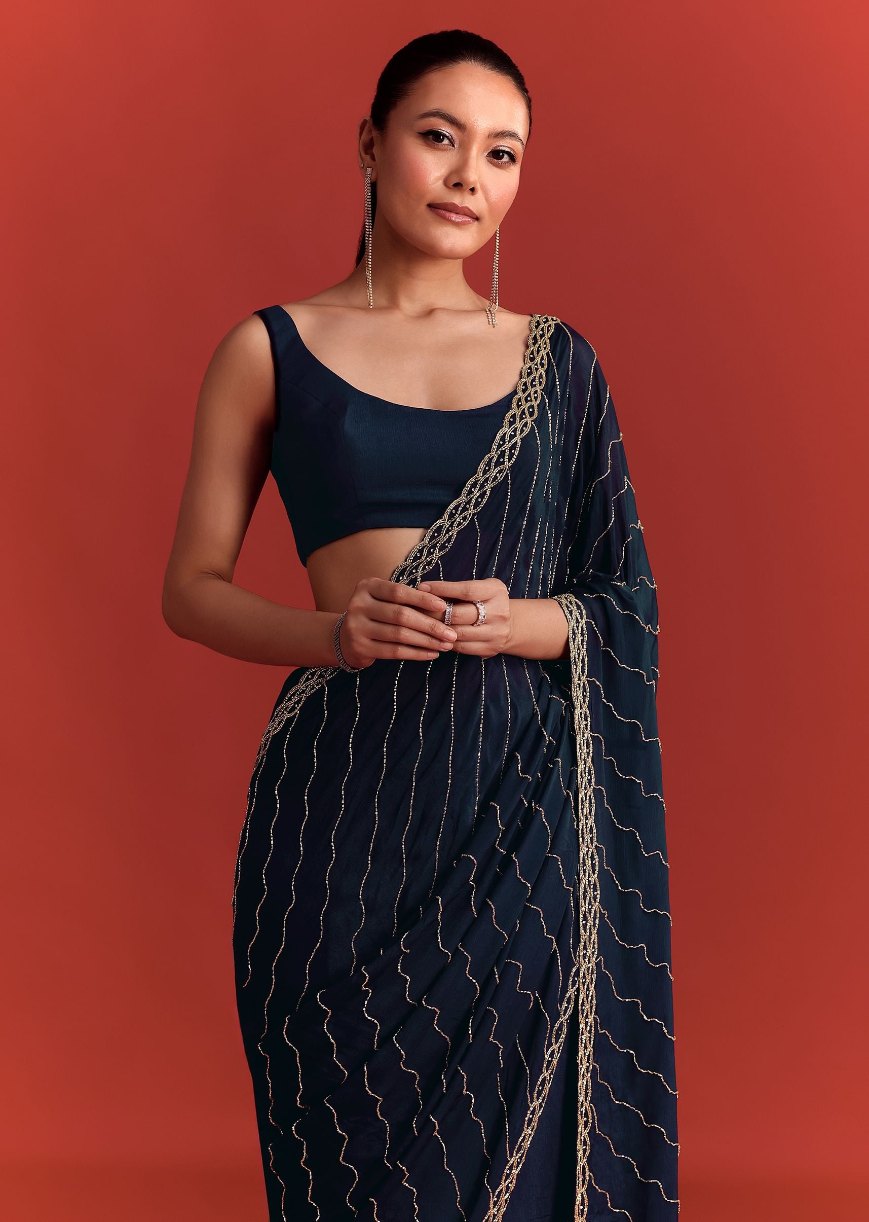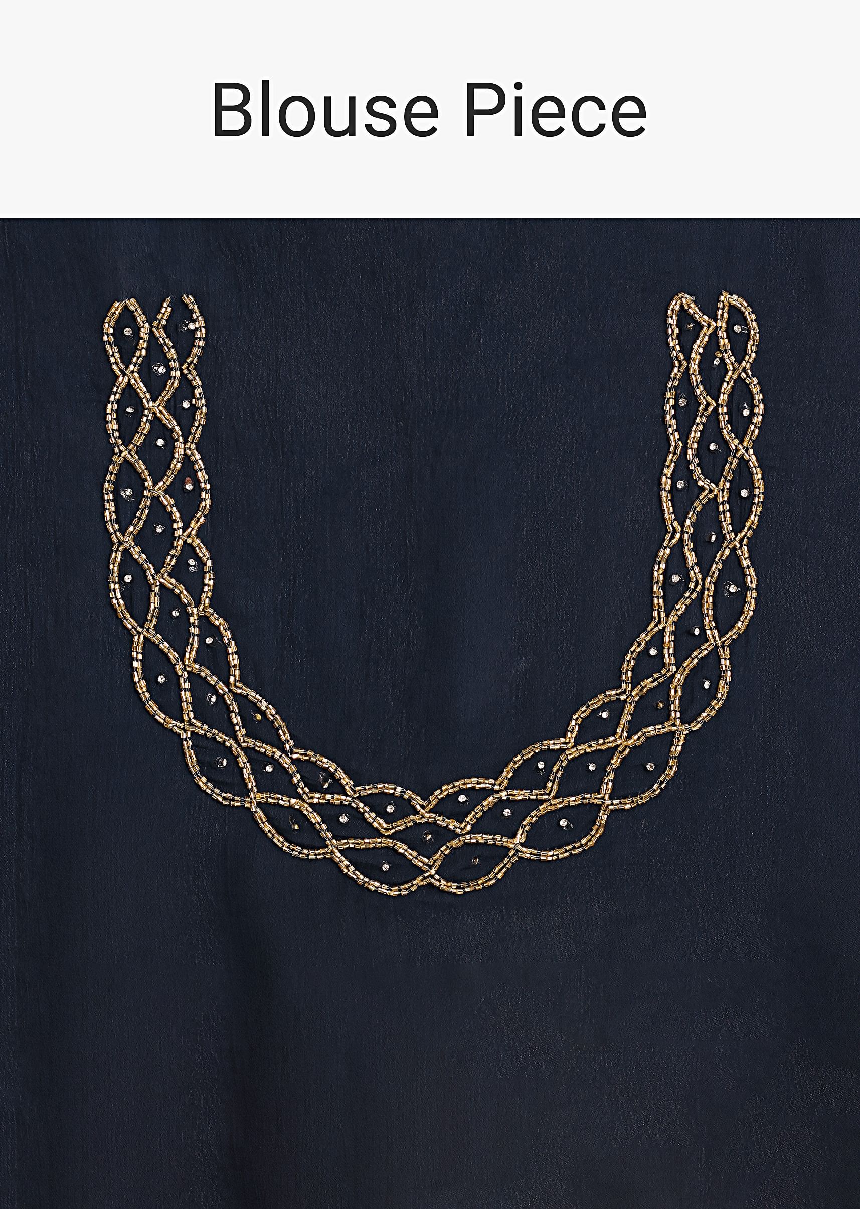 Dazzle and shine in this navy blue chinnon saree, that features heavy cutdana embellishments all over in a contrast glistening hue. A perfect choice for special celebrations, cocktail parties and glamorous events, the intricate artistry and rich textures make this outfit a versatile addition in your ethnic closet. Awarded as the Most Trusted Brand, we're delivering styles you love, just as promised.