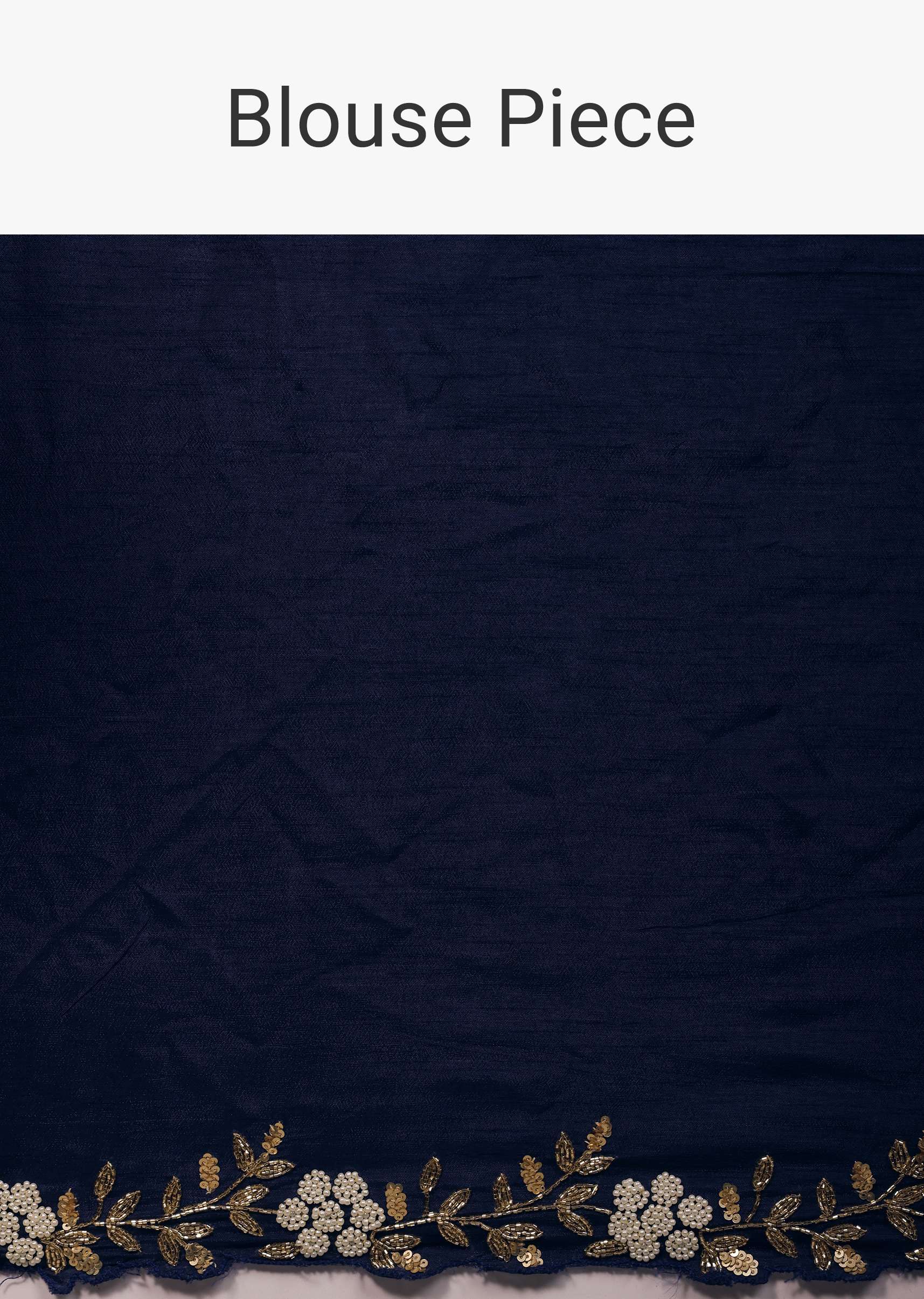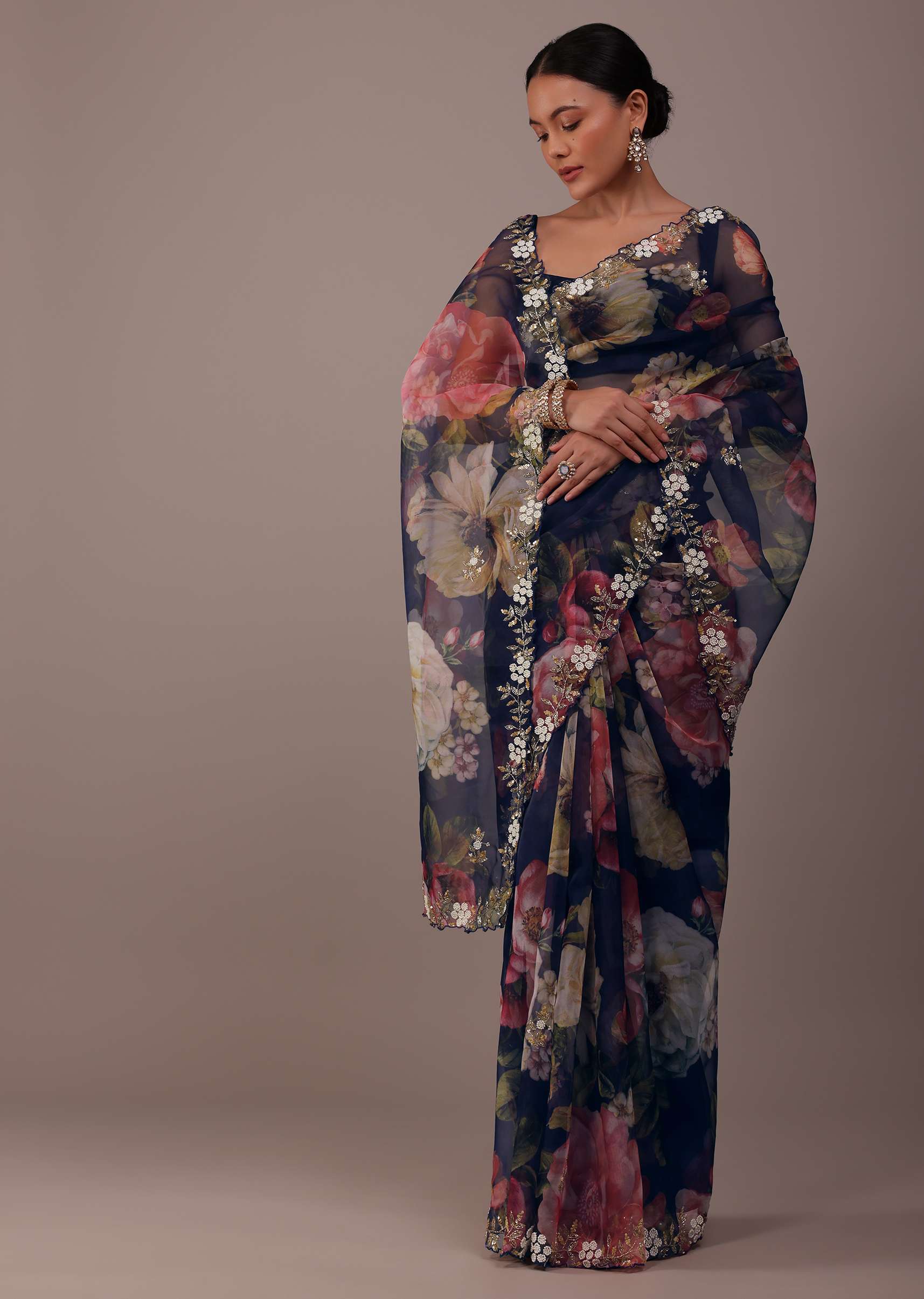 Navy blue Floral Printed Saree In Organza With Cut Dana Embroidery