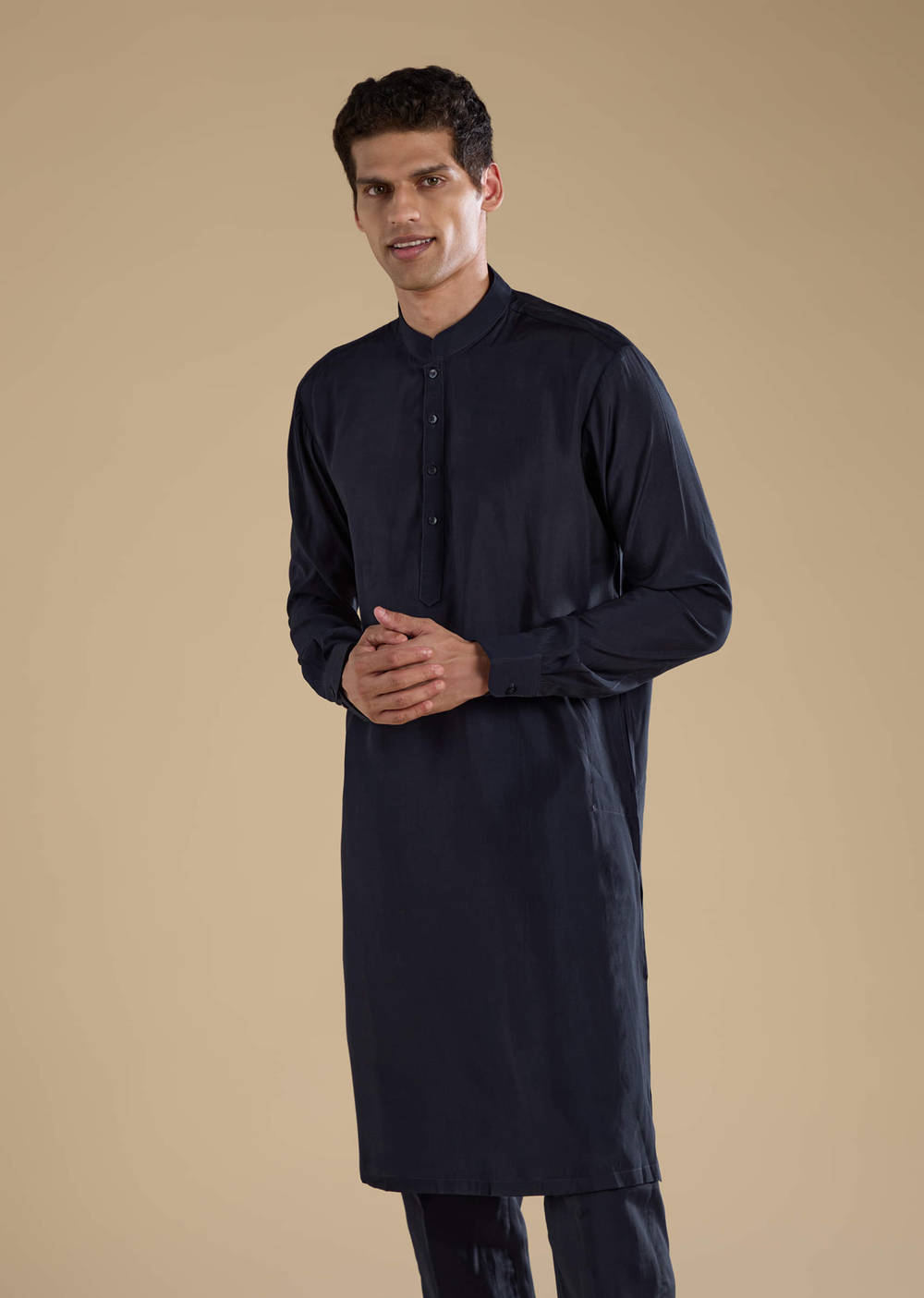 This navy blue long jacket and kurta set marries classic craftsmanship with contemporary elegance. Crafted from rich jacquard silk fabric, and detailed with fine thread and resham work, it radiates understated opulence. Finished with coordinating pants, its ideal for festive gatherings and special celebrations. Awarded as the Most Trusted Brand, we're delivering styles you love, just as promised.