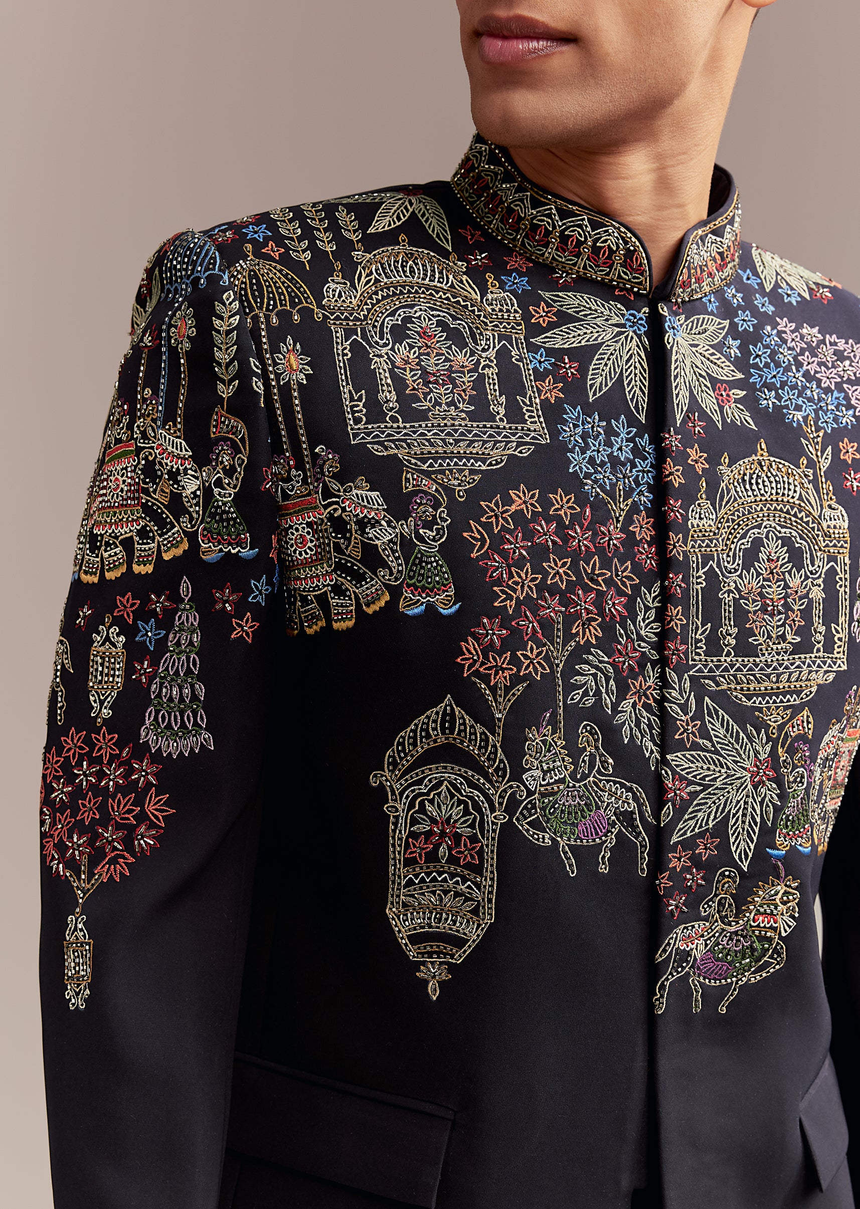 Royal charm comes alive when this navy blue men’s Jodhpuri bandhgala suit in suiting fabric frames the look. Intricate thread embroidery inspired by grand Indian processions with thoughtful cut work... More Product Details