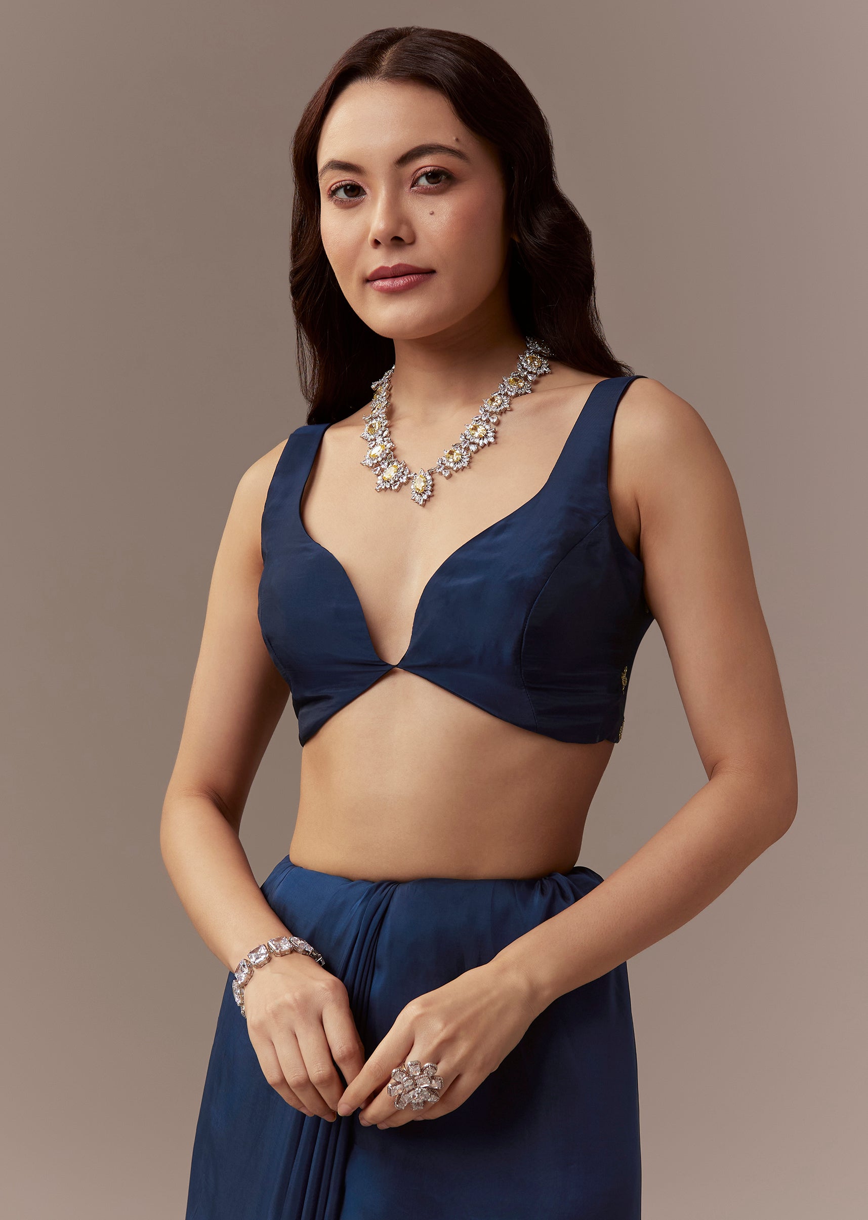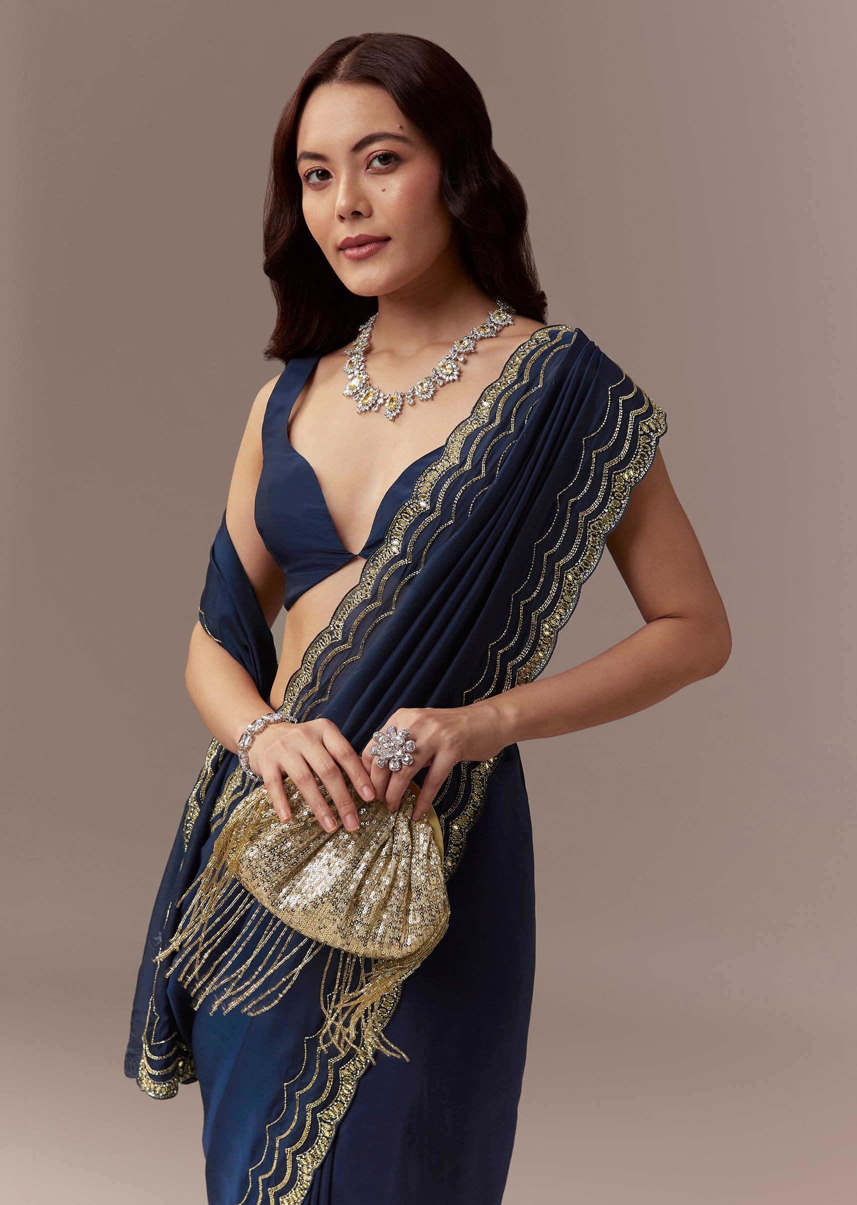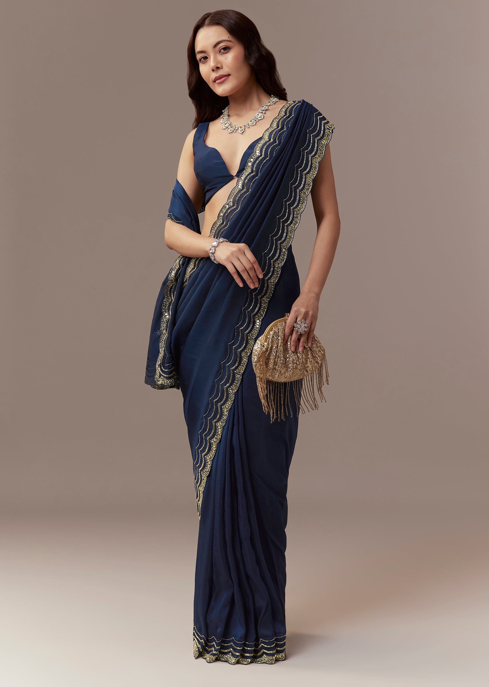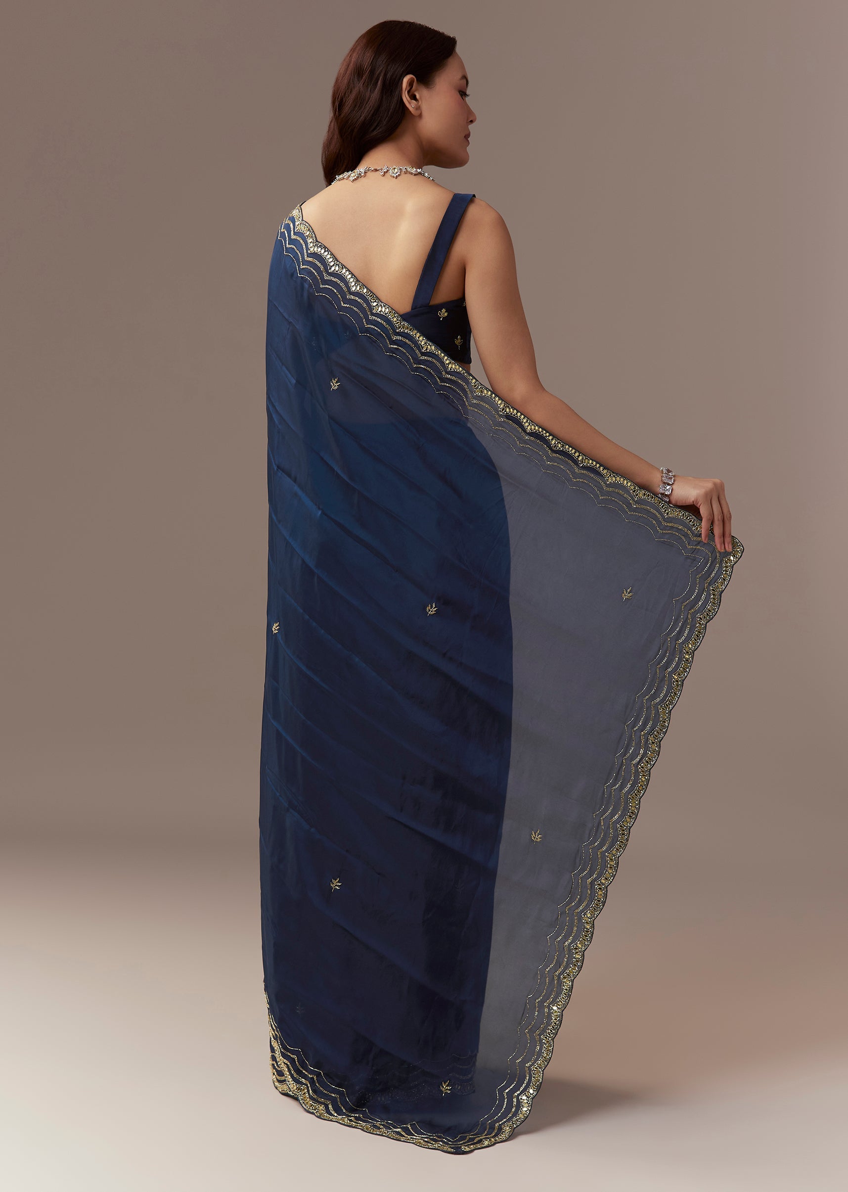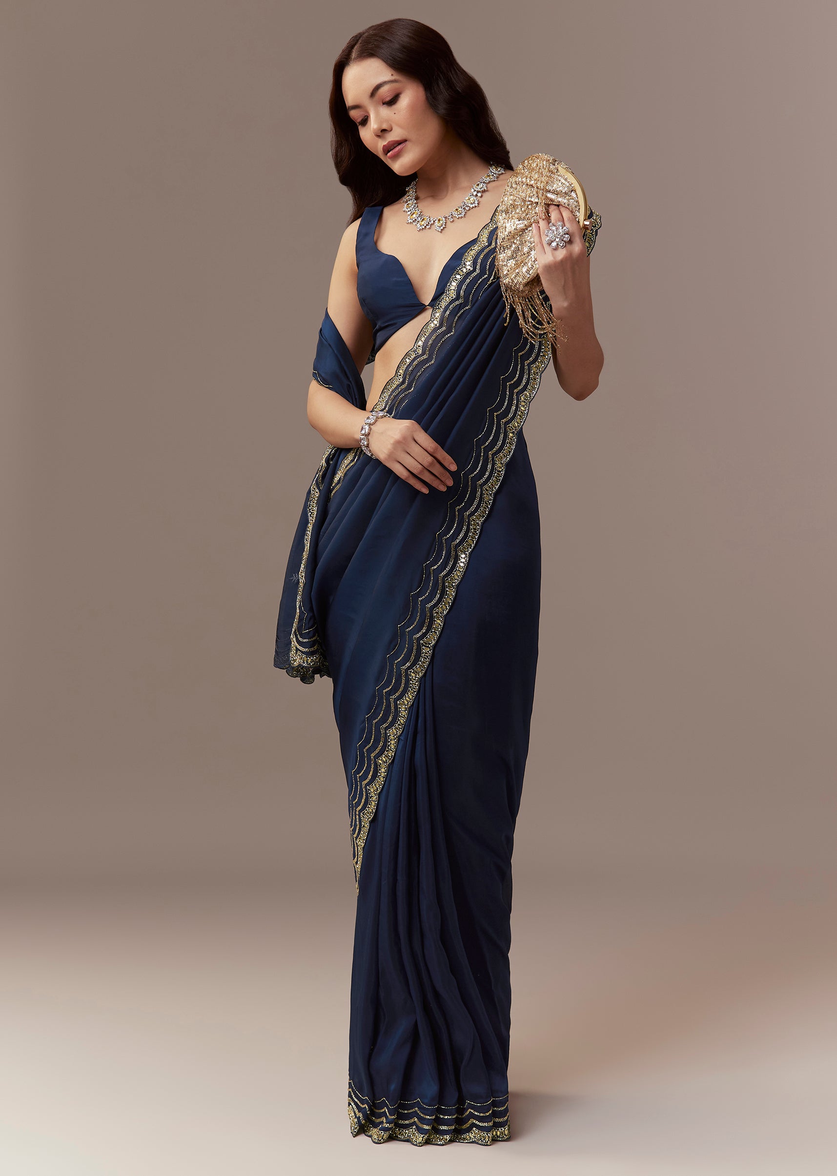 Bold elegant and festive this navy blue kora silk saree is perfect for engagement and sangeet celebrations as a wedding guest. The saree features a scalloped border embroidered with cutdana and embellished with stones and mirror creating a striking shimmer and contemporary appeal. It comes with unstitched blouse fabric allowing a customized and comfortable fit. Ideal for evening functions it exudes sophistication glamour and celebration ready style. Awarded as the Most Trusted Brand, we're delivering styles you love, just as promised.