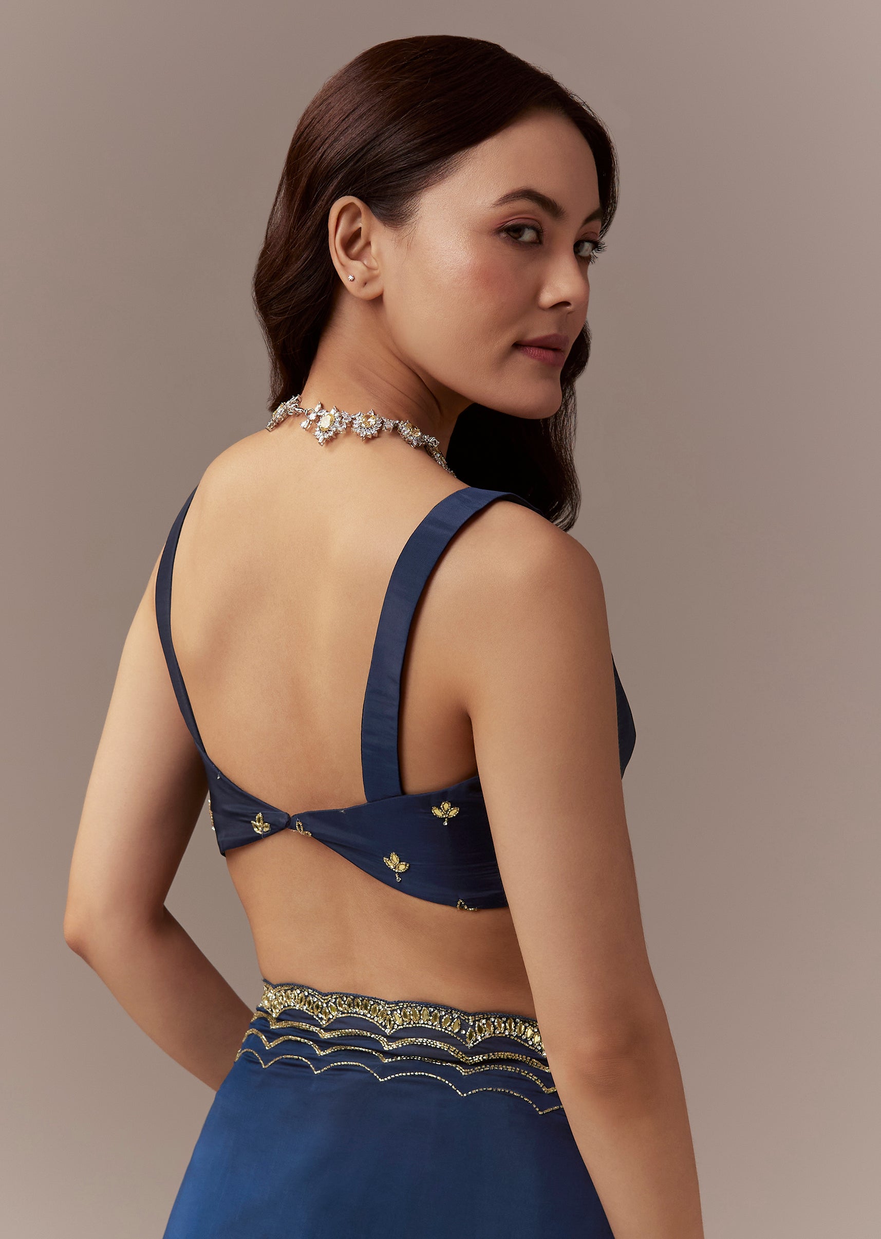 Bold elegant and festive this navy blue kora silk saree is perfect for engagement and sangeet celebrations as a wedding guest. The saree features a scalloped border embroidered with cutdana... More Product Details