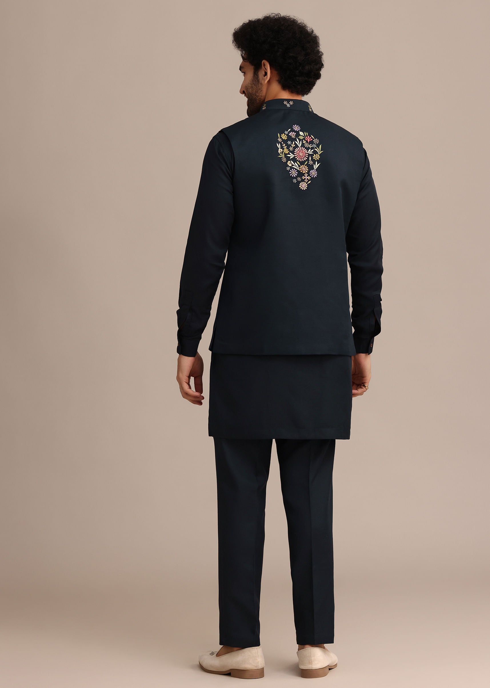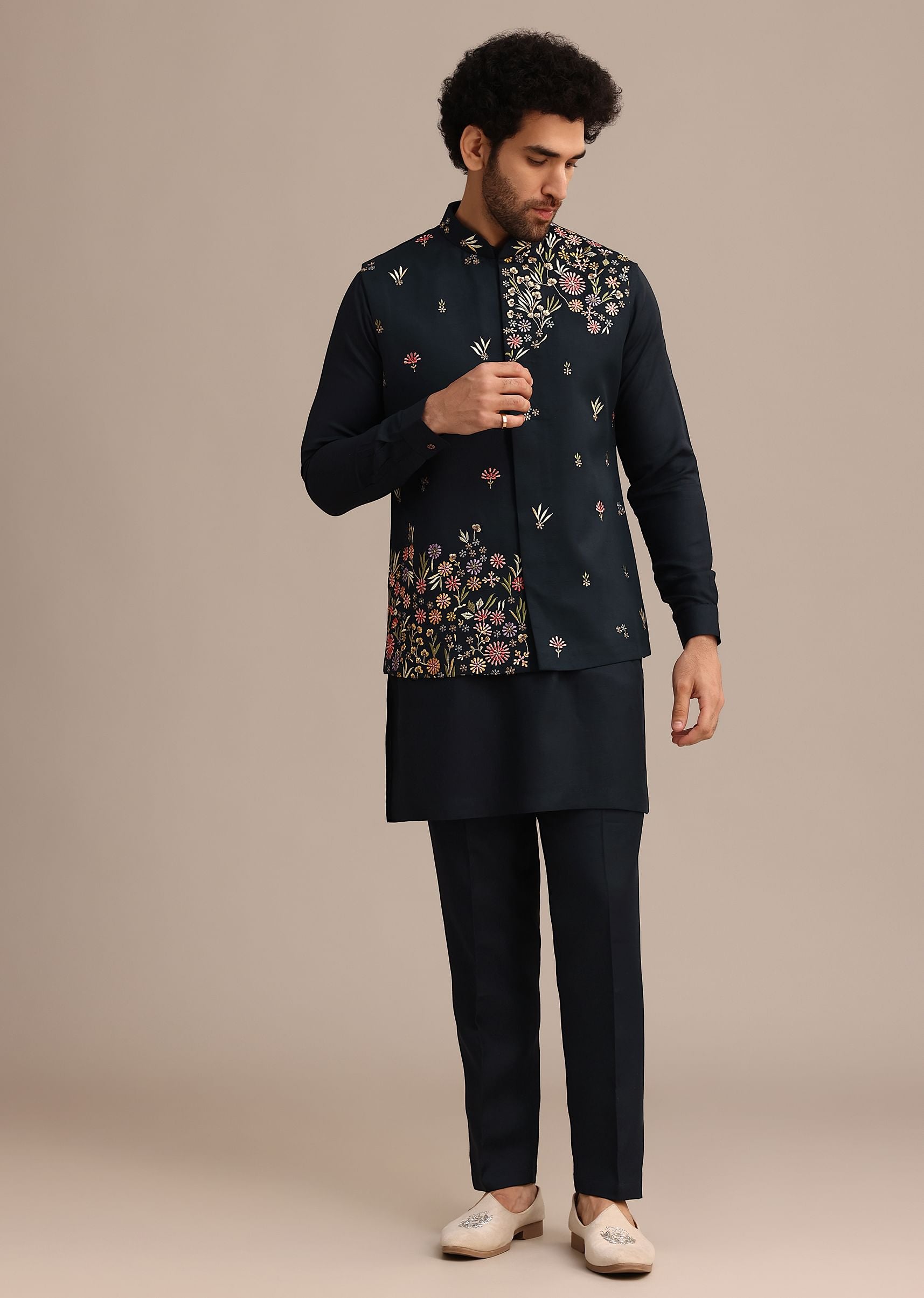 Navy Blue Kurta Jacket Set With Floral Embroidered Motifs