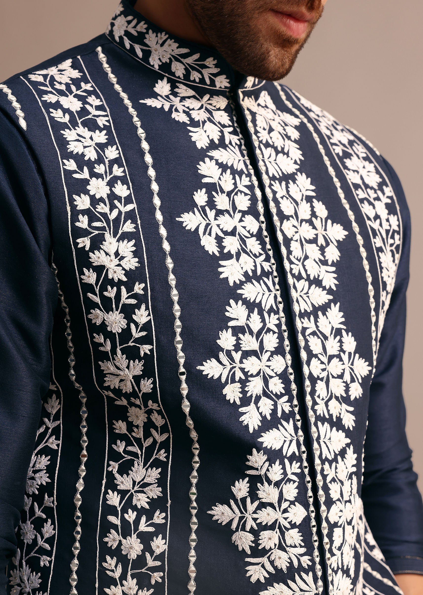 Navy Blue Kurta Jacket Set With Thread And Mirror Work