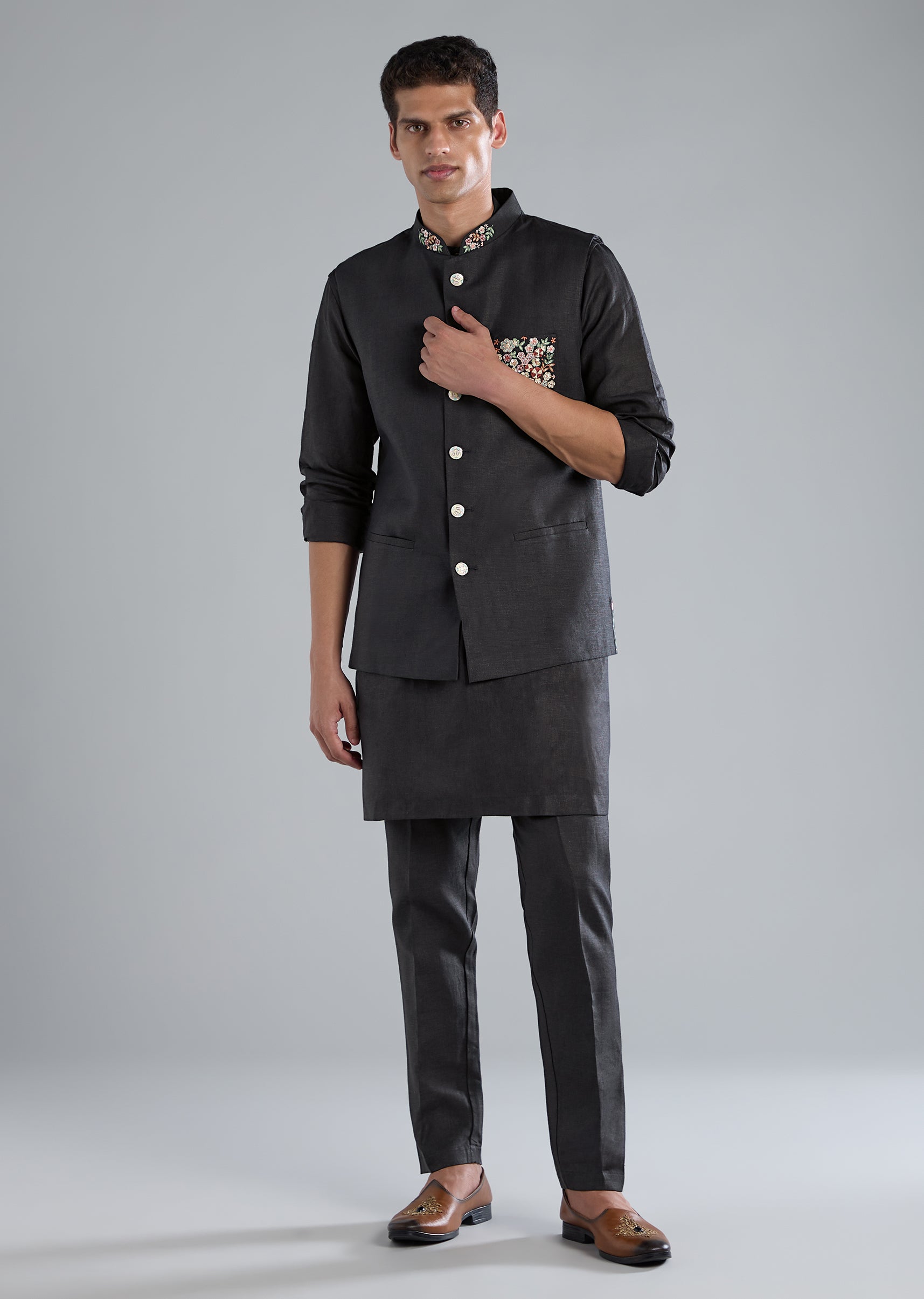 This navy blue kurta jacket set is crafted in breathable linen and highlighted with intricate thread resham work, making it perfect for mehendi and festive celebrations. It features full sleeves, a mandarin collar, a front button top closure, and a secure front hook eye bottom closure. The set includes a jacket, kurta, and pants, designed for a clean and elegant traditional look. Awarded as the Most Trusted Brand, we're delivering styles you love, just as promised.
