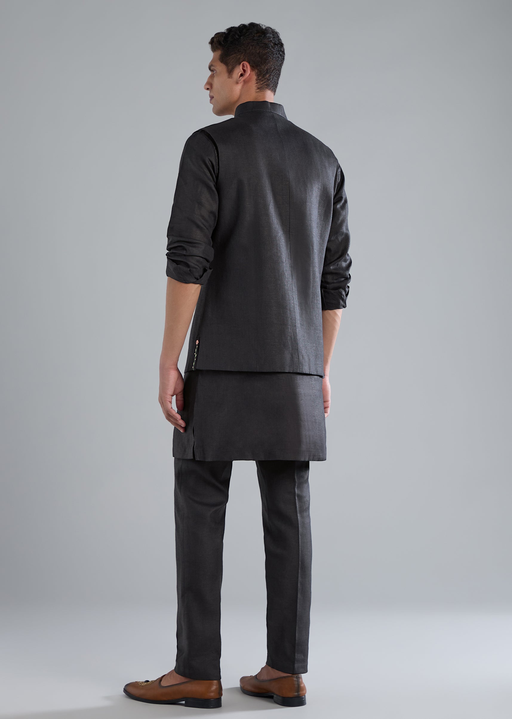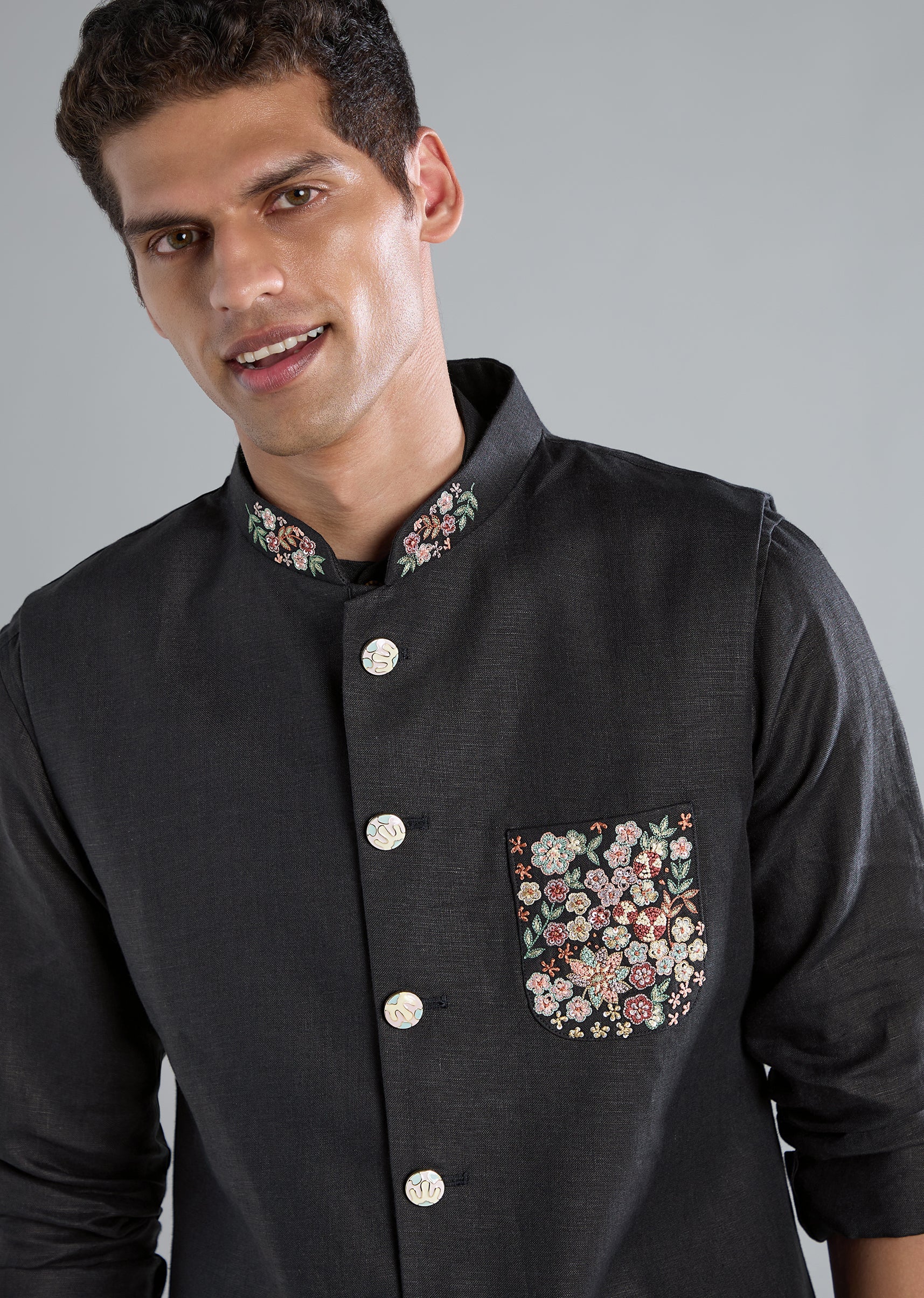 Navy Blue Linen Kurta Jacket Set With Thread Resham Work