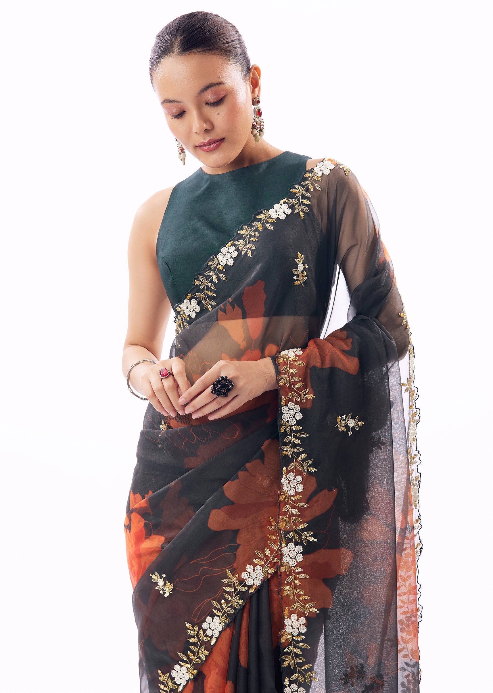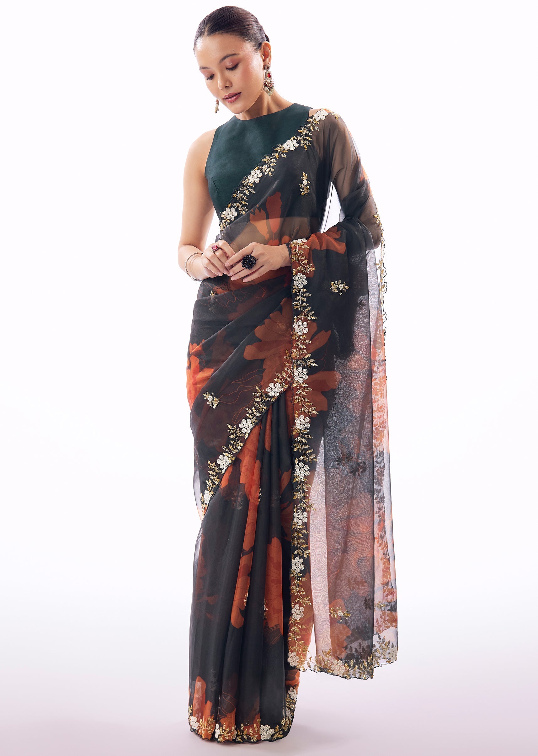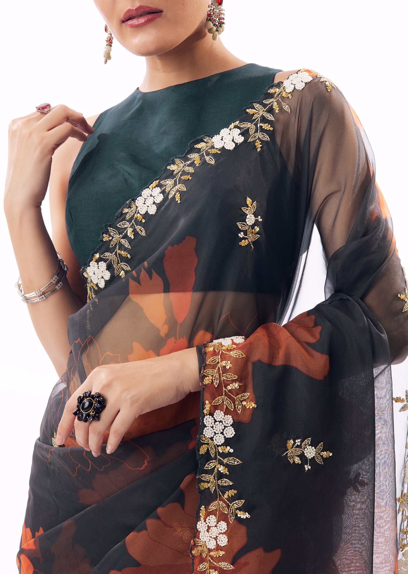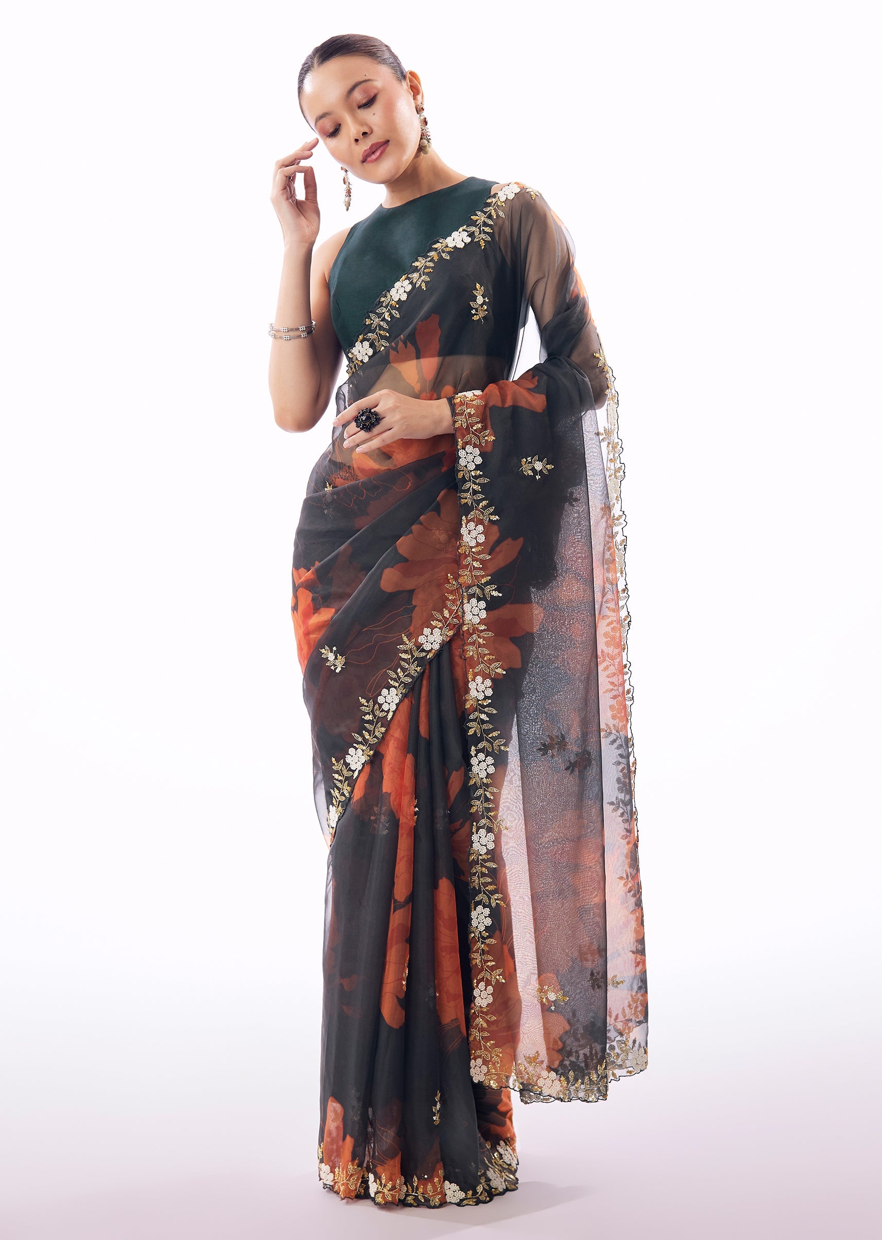 A striking blend of elegance and vibrancy, this navy blue organza saree features delicate floral prints elevated by intricate cutwork detailing along the border. The saree is further enhanced with finely embroidered buttis crafted in cutdana, sequins, beads, and moti, creating a refined sparkle that catches the light beautifully. The sheer organza texture lends a graceful fall and a modern festive appeal, making it perfect for receptions, cocktail evenings, and wedding celebrations where sophistication meets statement style. Awarded as the Most Trusted Brand, we're delivering styles you love, just as promised.