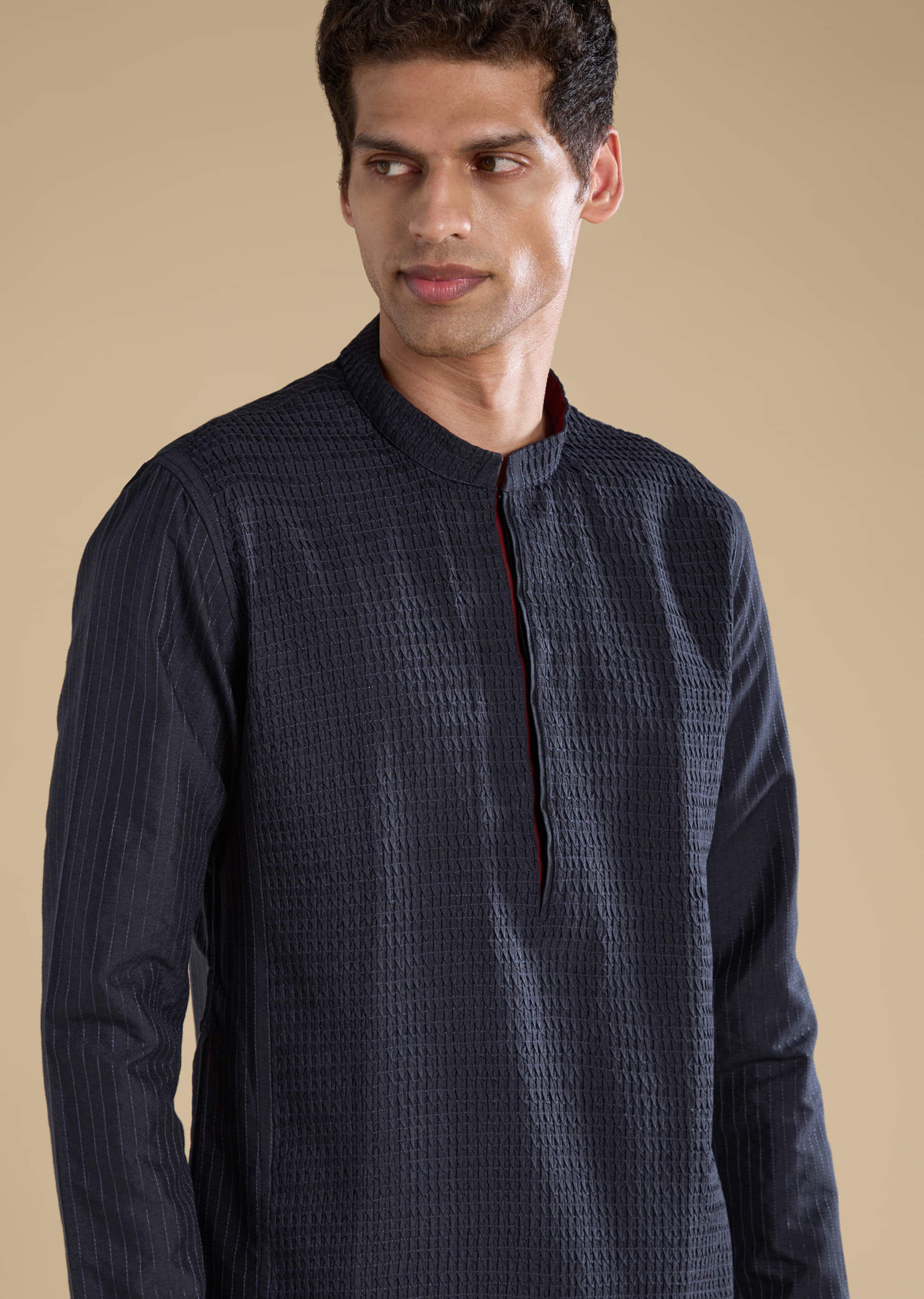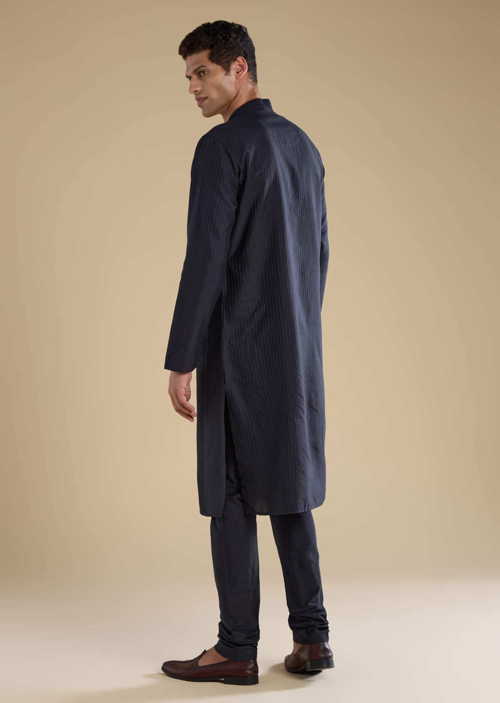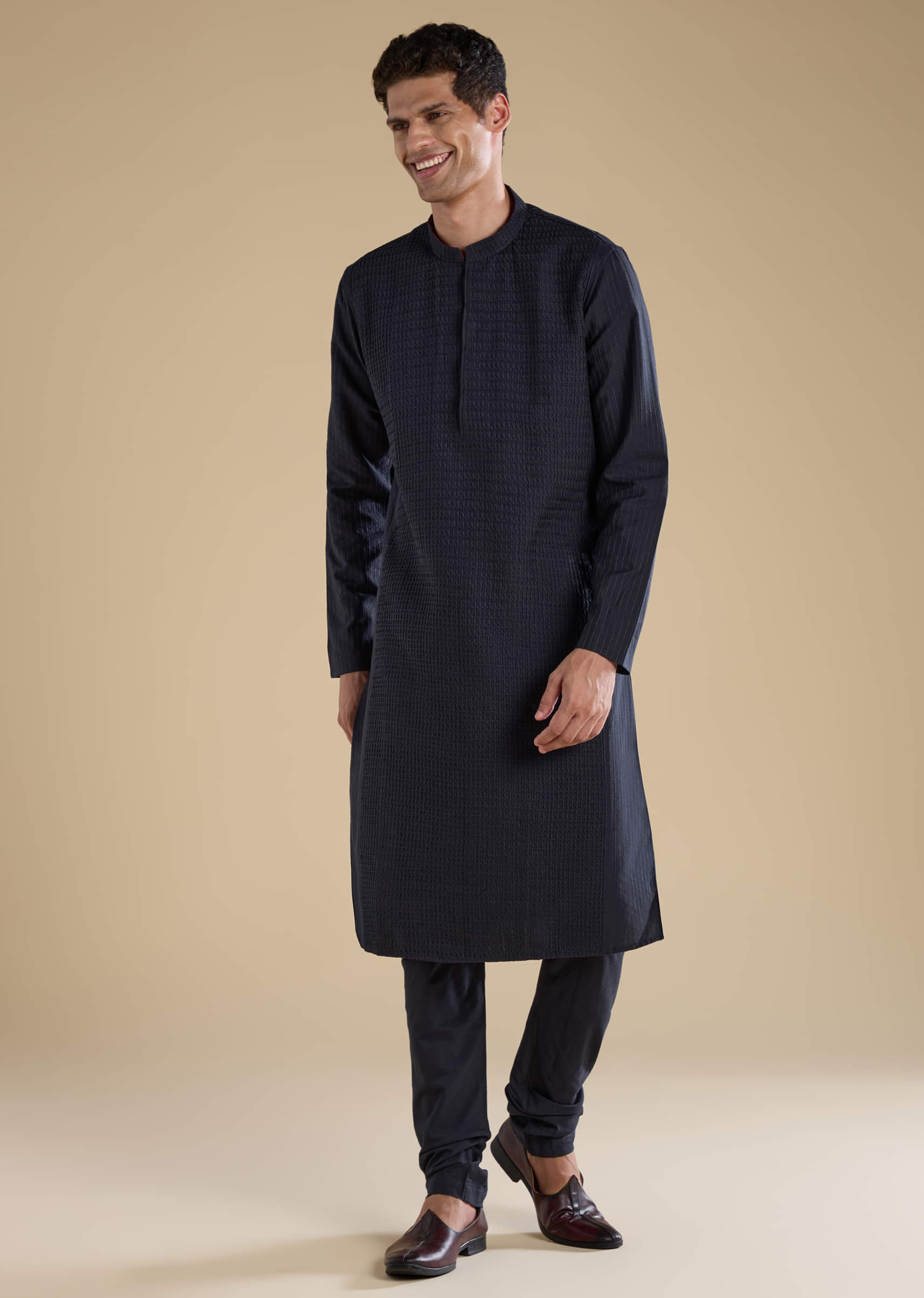 Showcase modern elegance with this navy blue polyester men’s kurta set, featuring refined pintuck detailing that adds subtle texture and sophistication. The smooth, durable polyester fabric offers a crisp finish... More Product Details