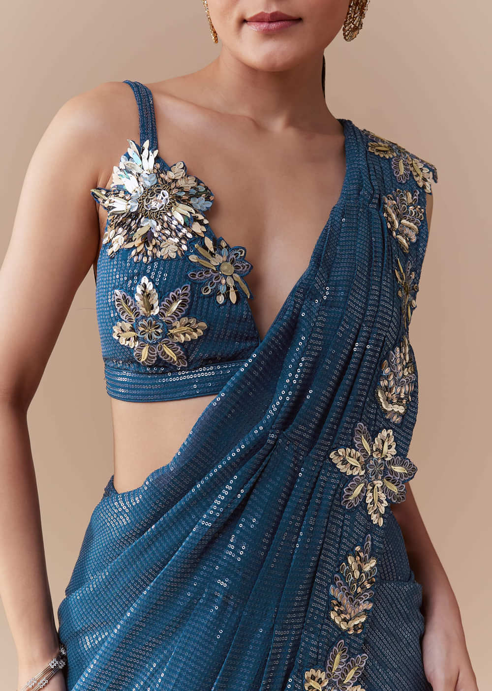 Navy Blue Ready Pleated Georgette Saree with Sequins Blouse