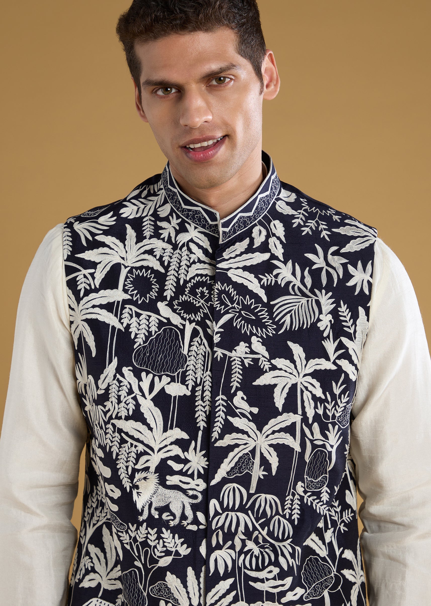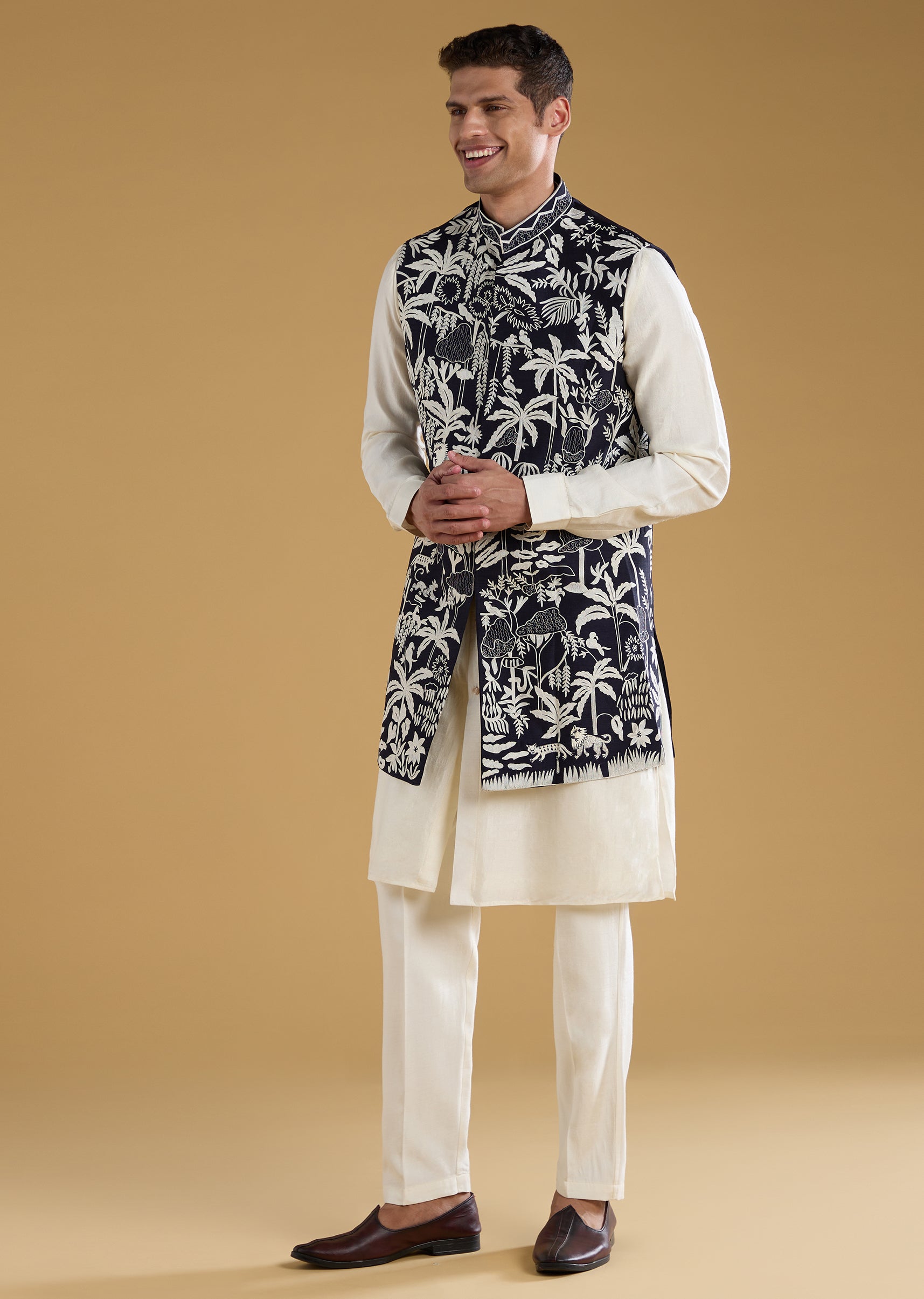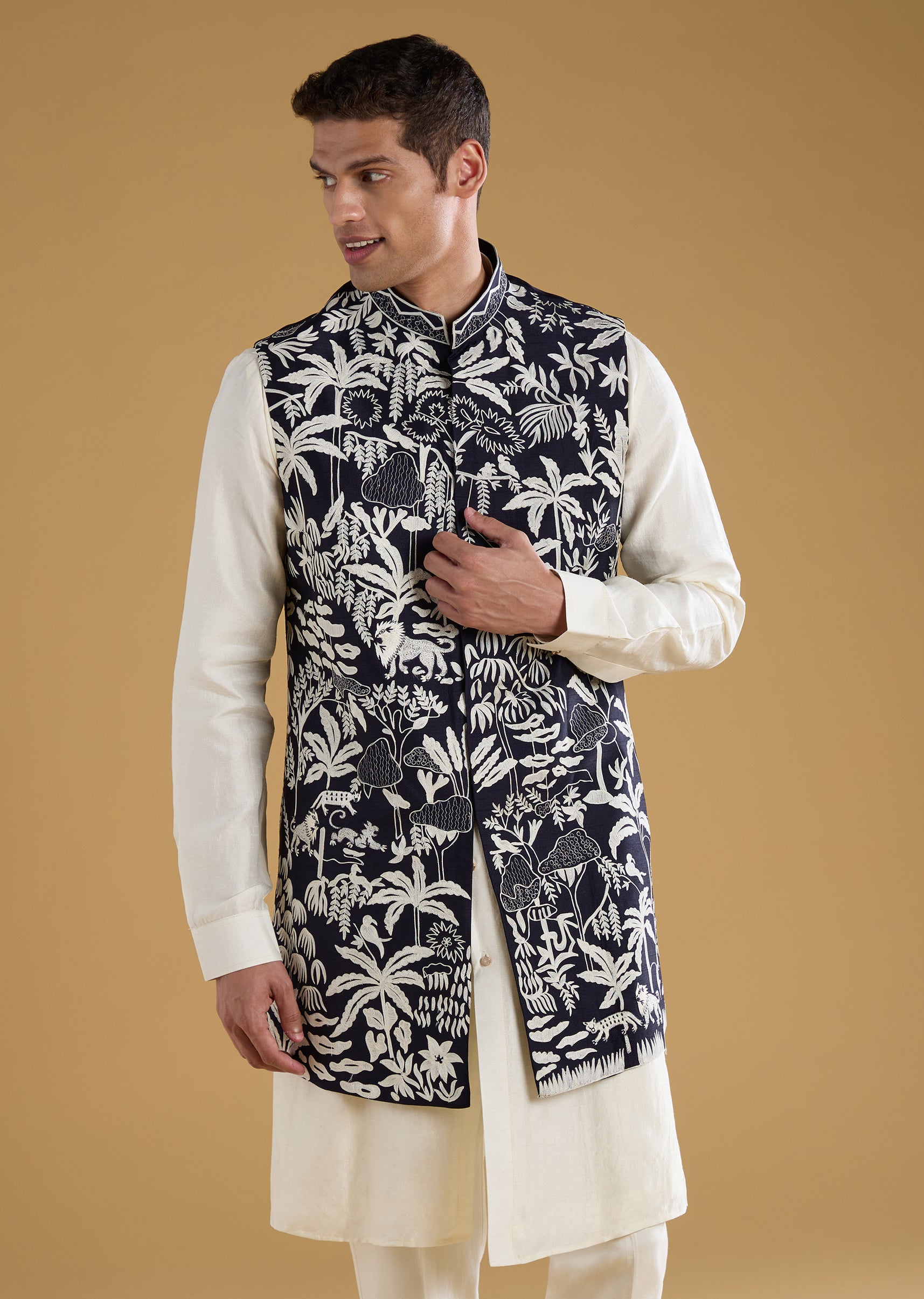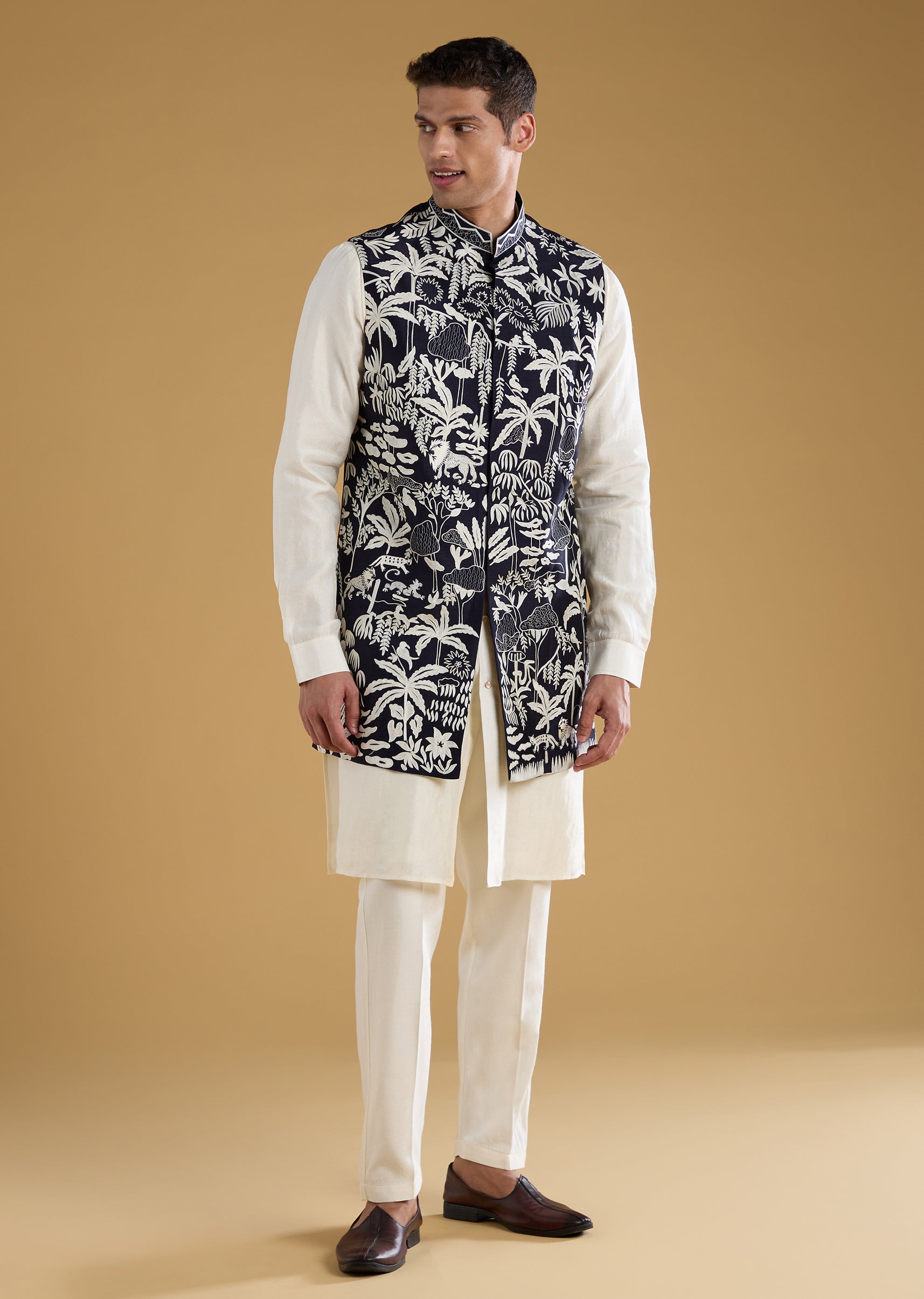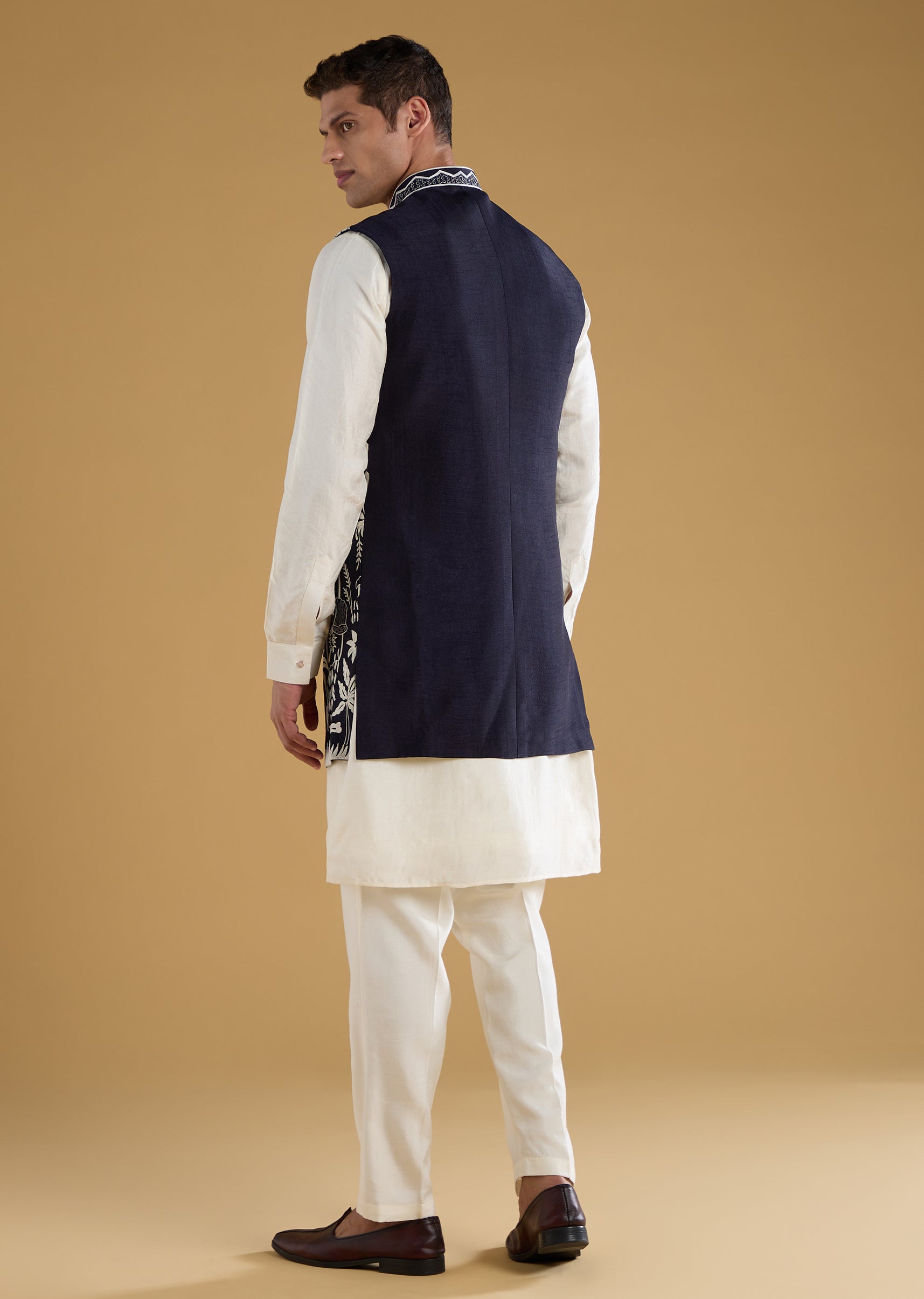Navy Blue Resham Embroidered Jacket and Kurta Set