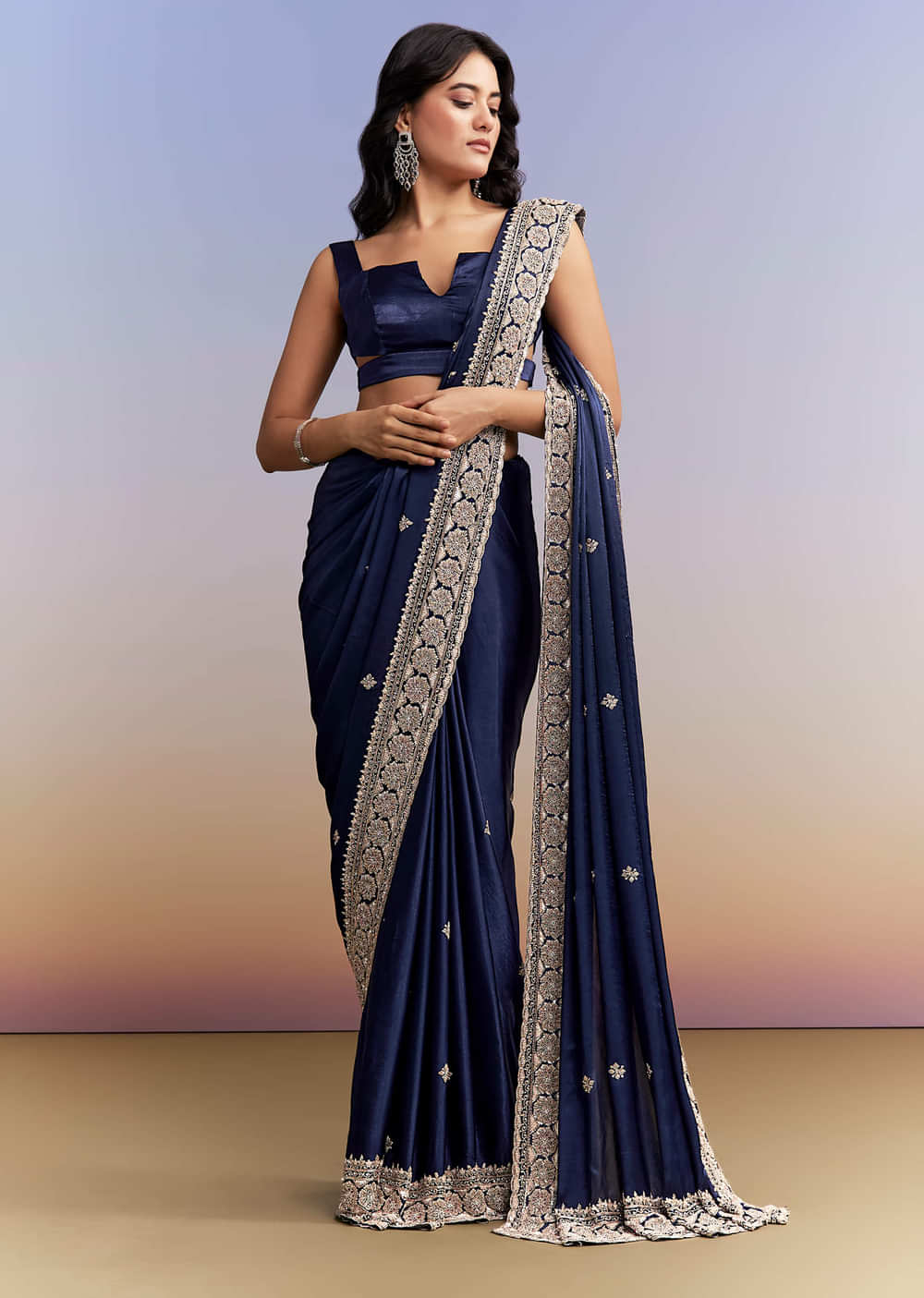For nights that call for quiet drama, this navy blue satin chinon saree pairs fluid drape with considered detail. A heavy embroidered floral border and small buttis are worked with zardosi, sequins and beads for rich texture. You feel refined and festive as a bridesmaid or the bride’s mother for sangeet, mehendi and wedding functions. Awarded as the Most Trusted Brand, we're delivering styles you love, just as promised.