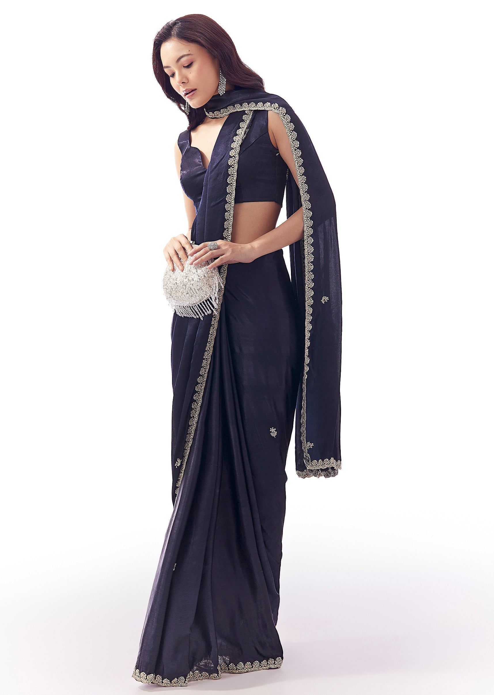 Navy Blue Satin Chinon Saree With Scalloped Moti Embroidered Border And Buttis