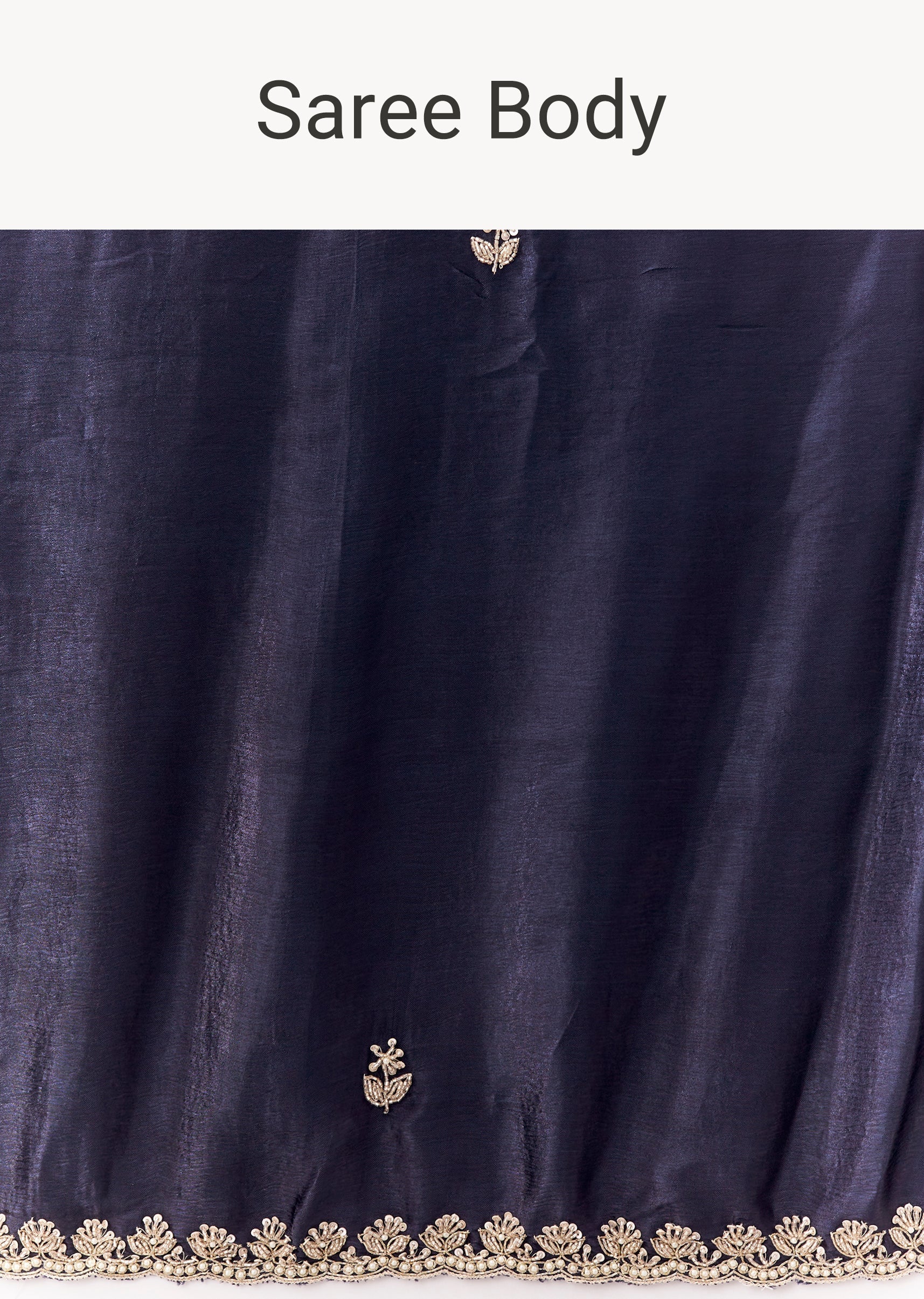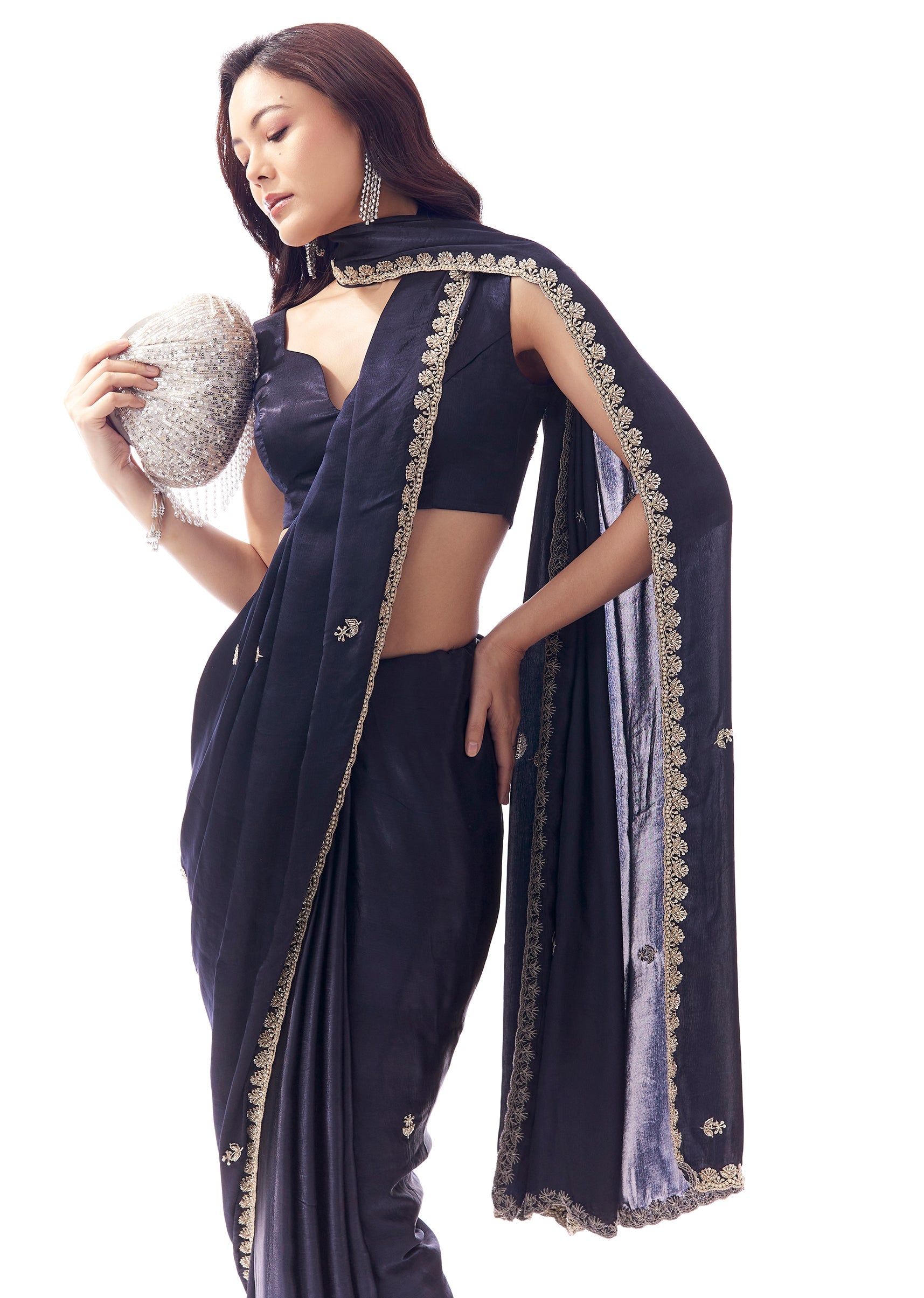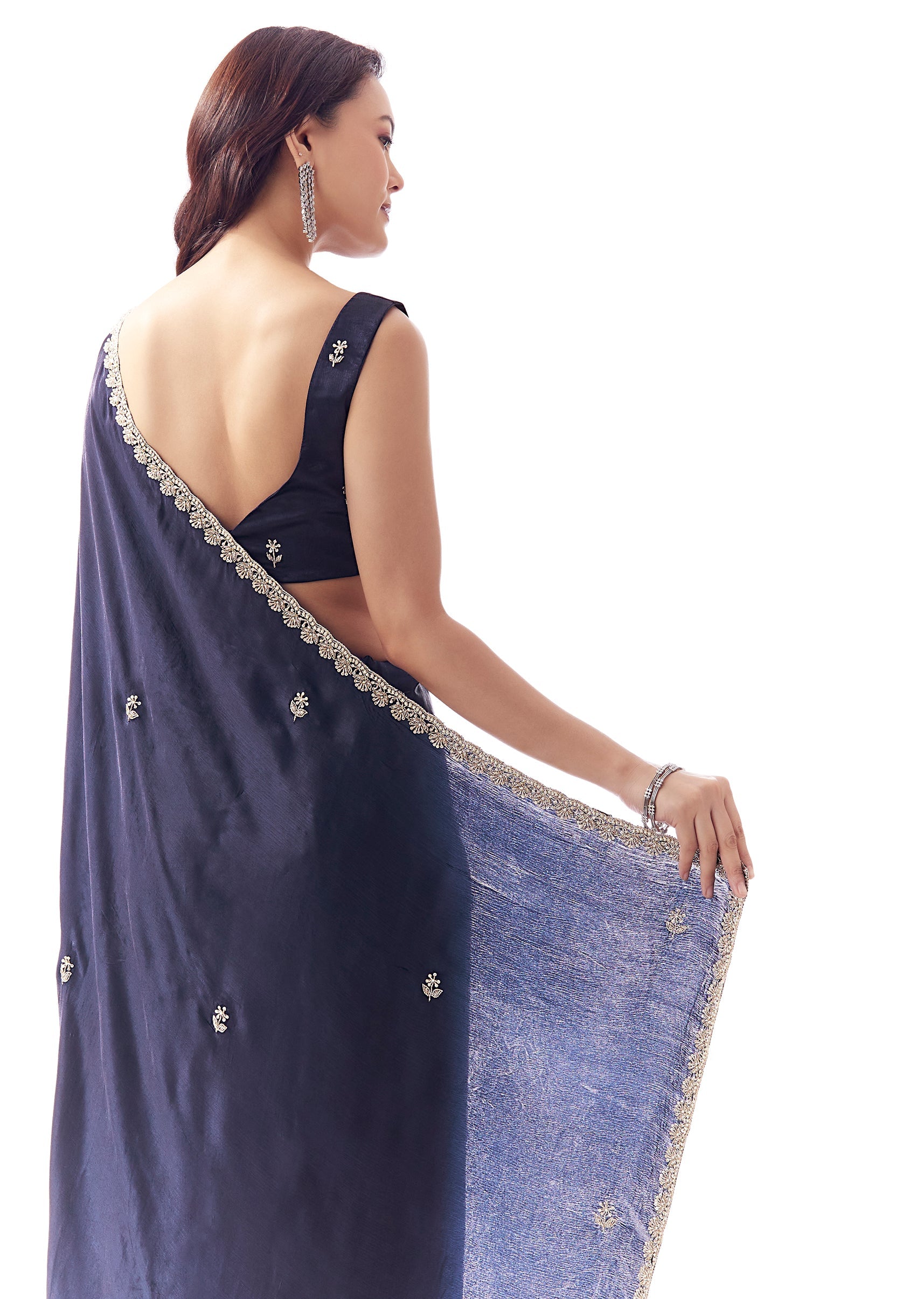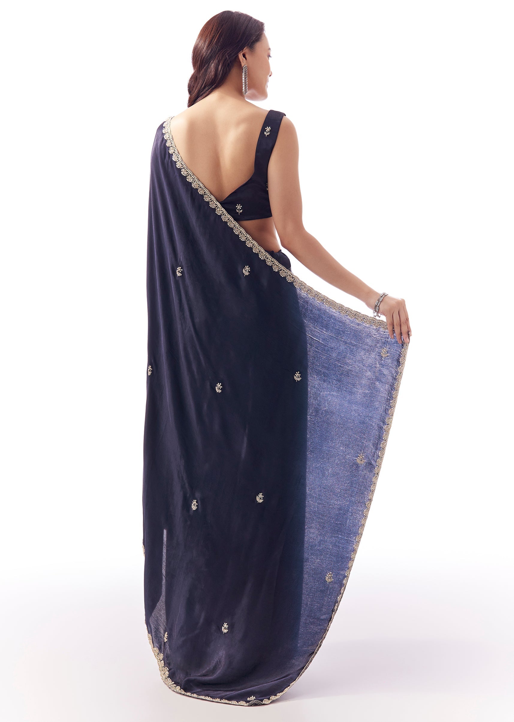 Elegant with a touch of shimmer, this navy blue satin chinon saree is crafted with a scalloped border and tiny buttis hand-embroidered using cutdana, beads and moti accents. The rich... More Product Details