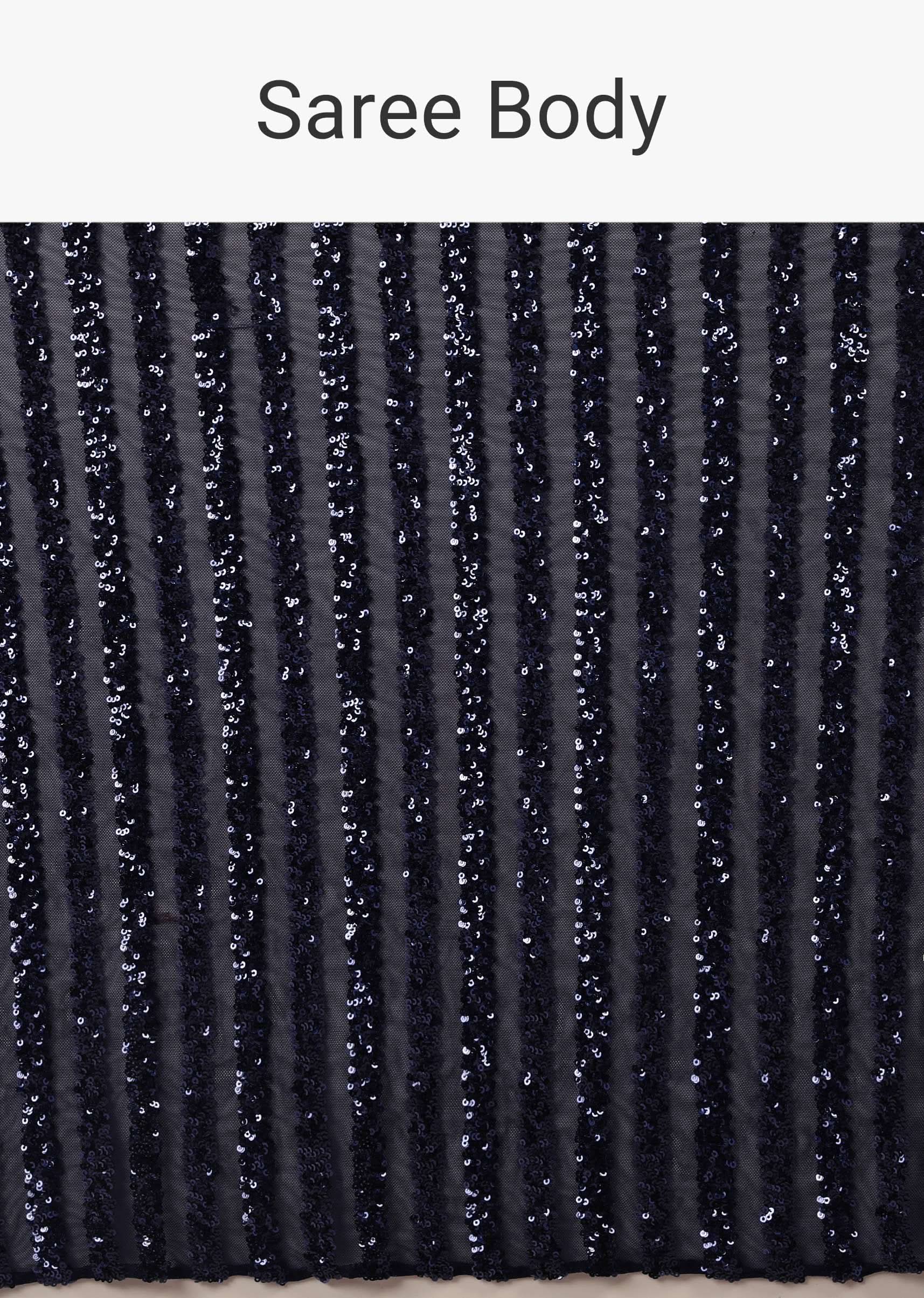 - Navy blue saree embellished in sequins in striped design.