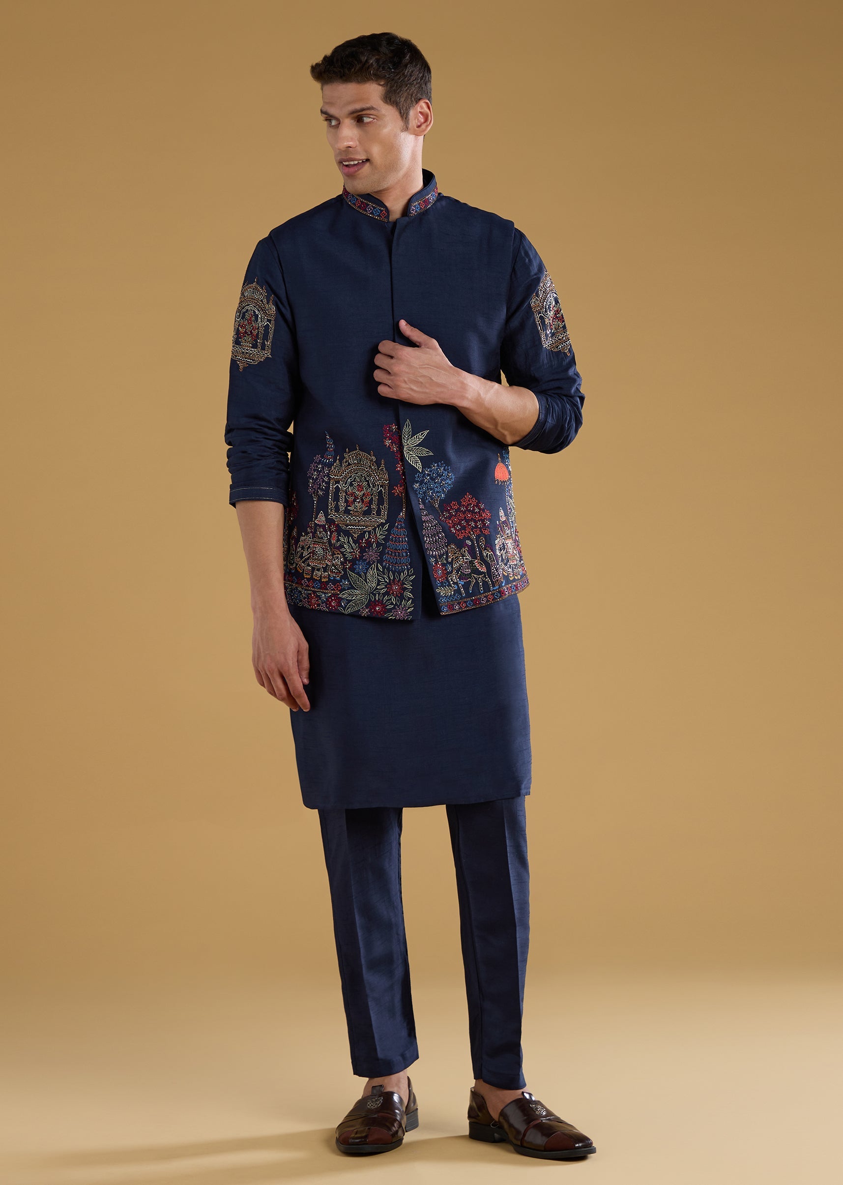 Navy Blue Silk Embellished Mens Jacket Kurta Set