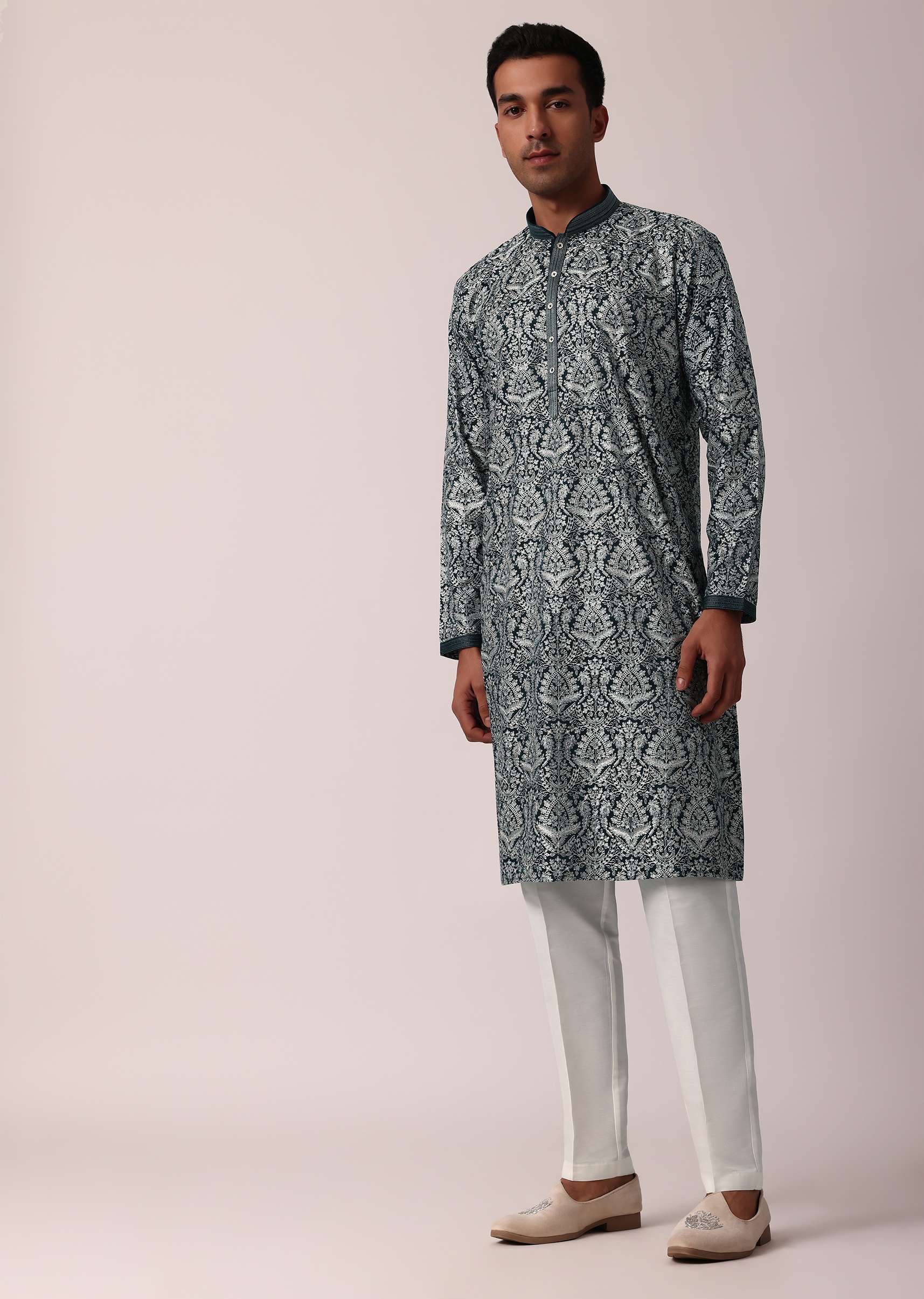 - This ensemble includes a full-sleeves kurta with a mandarin collar and coordinating bottom.