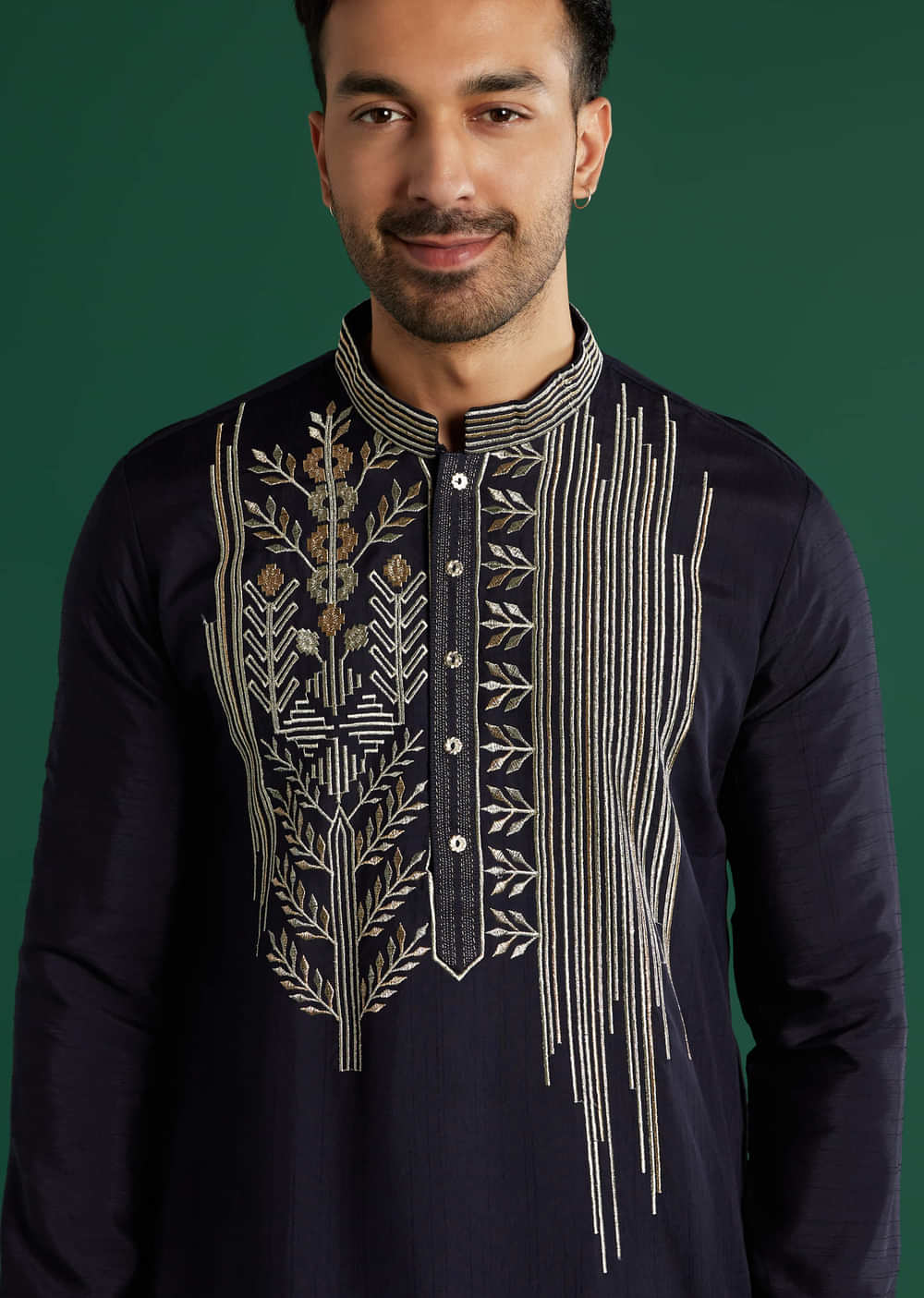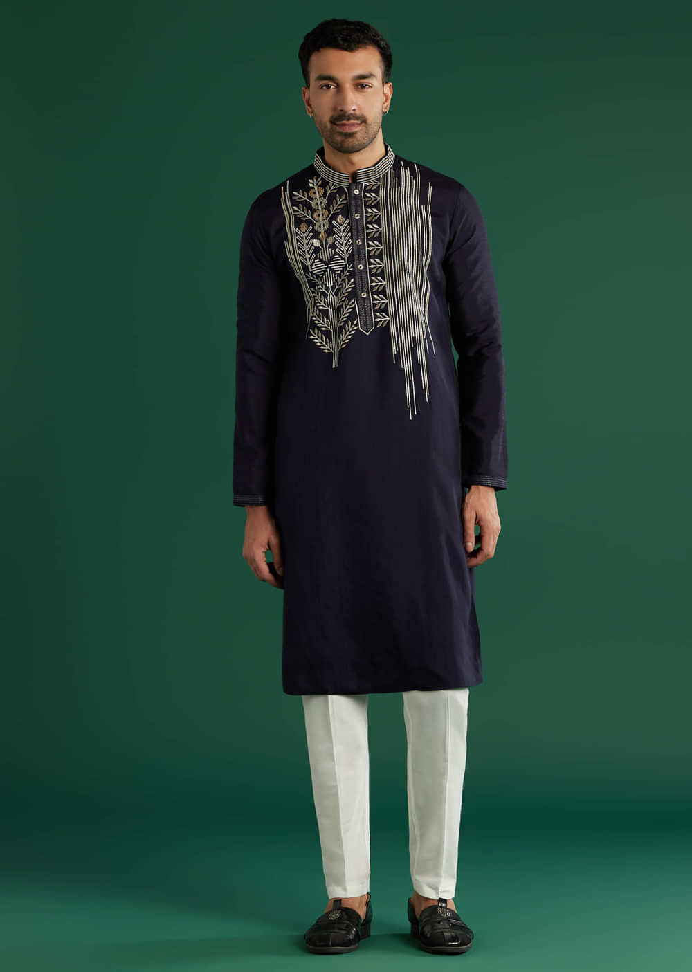 Under evening lights, this navy blue art silk men’s kurta set pairs soft silver thread embroidery with gota touches along the placket and collar. Vertical lines and floral accents add... More Product Details
