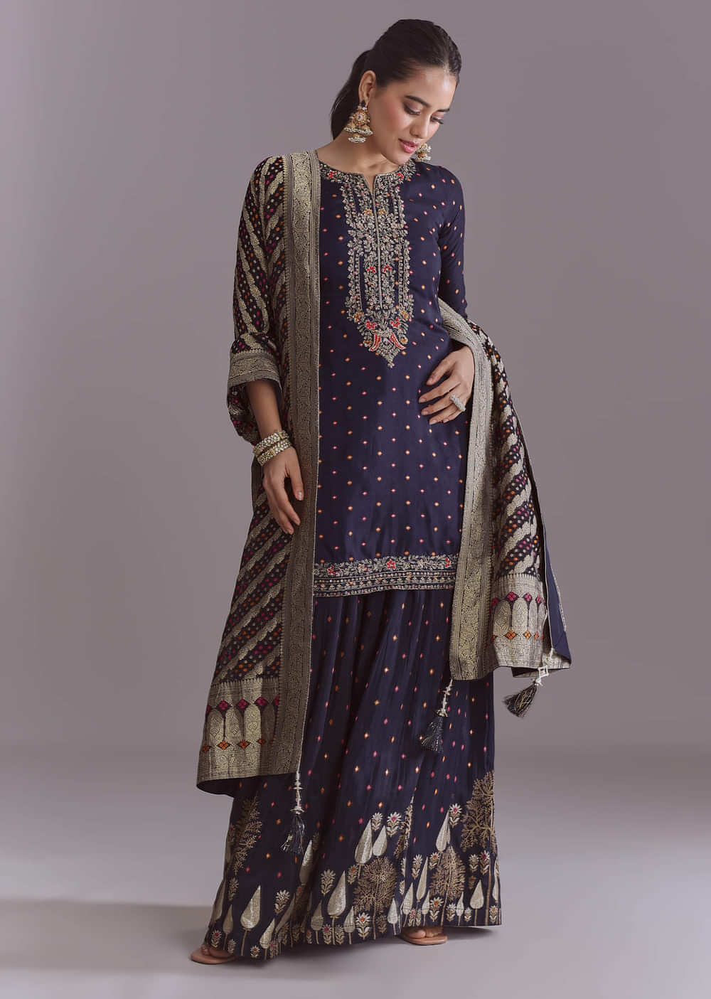 Navy Blue Silk Palazzo Suit With Embroidery And Brocade Dupatta