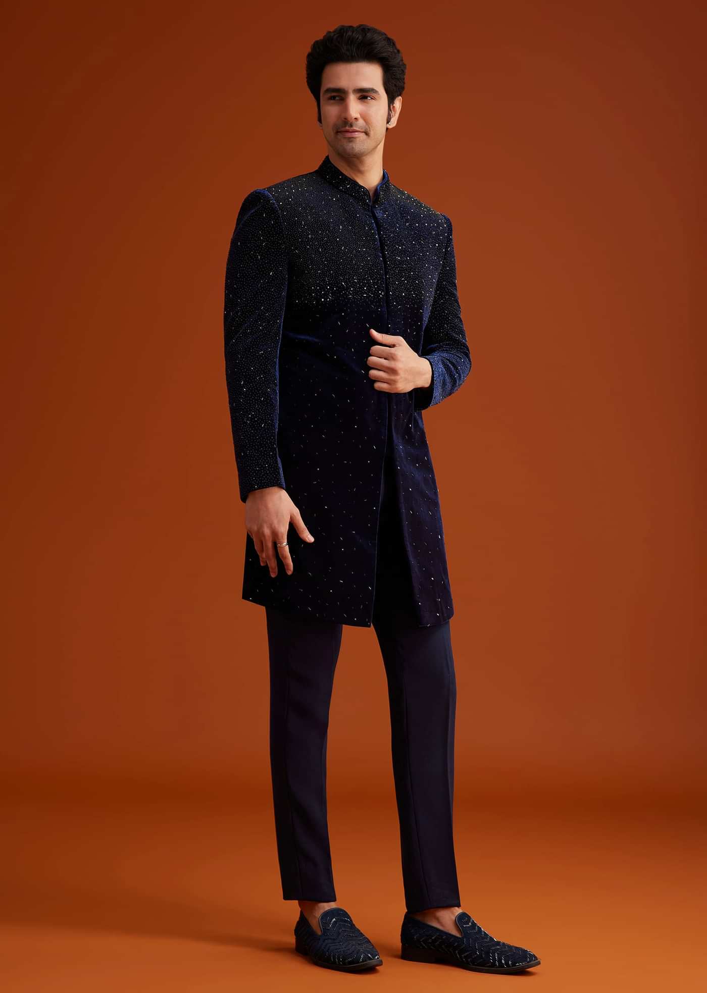 • Immerse yourself in opulence with this navy blue velvet indo-western set, delicately adorned with hand-embellished sequins and threadwork.