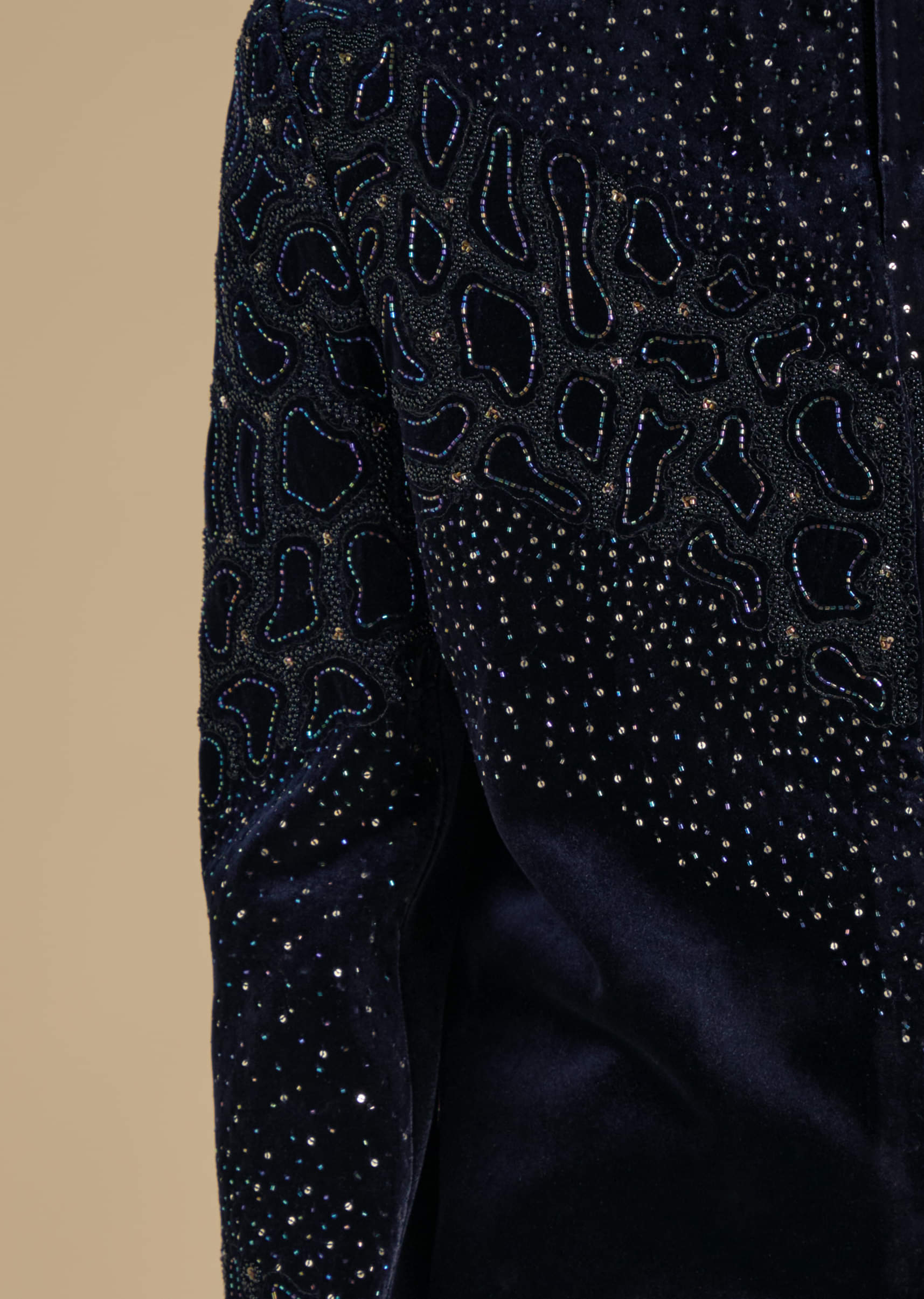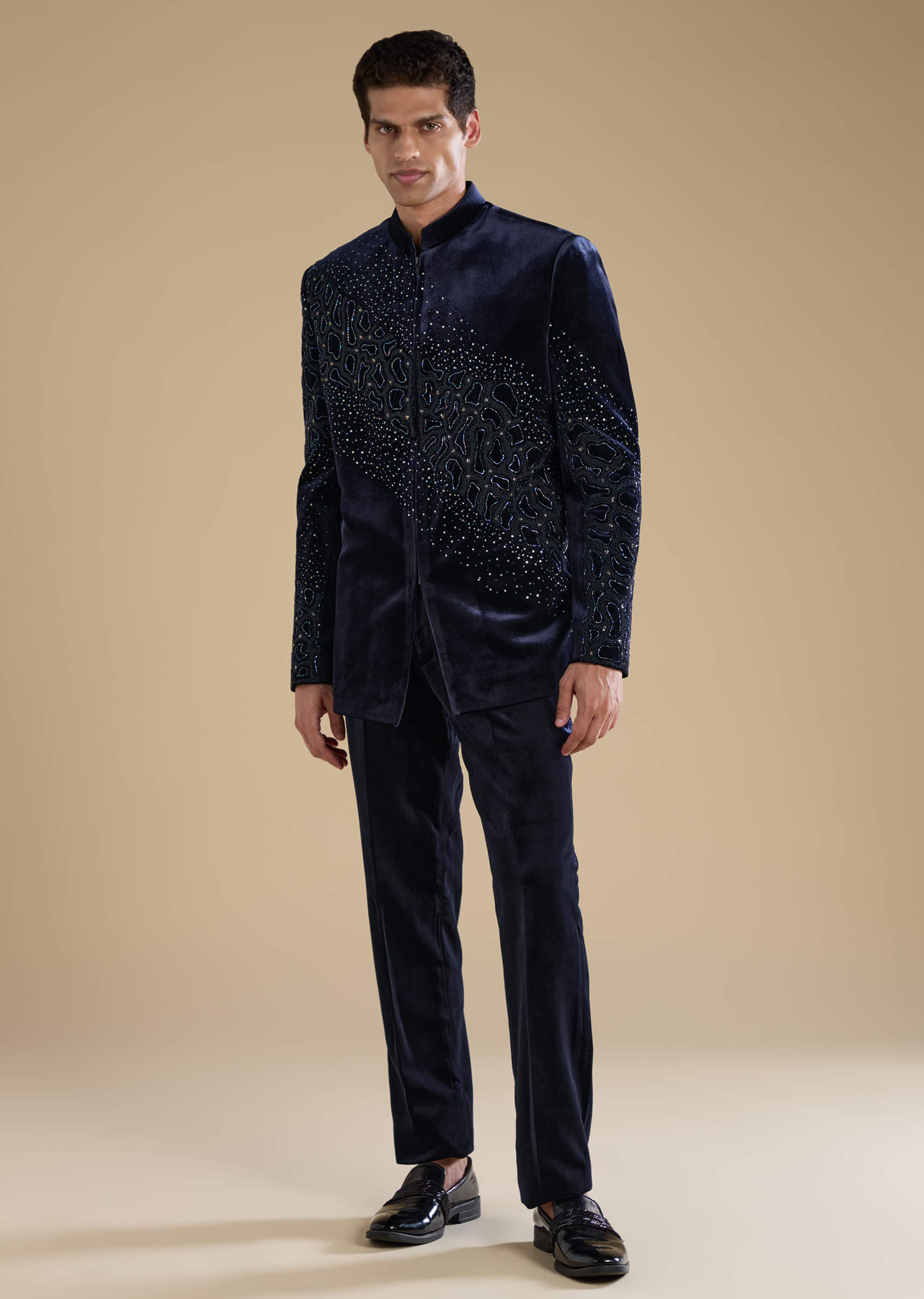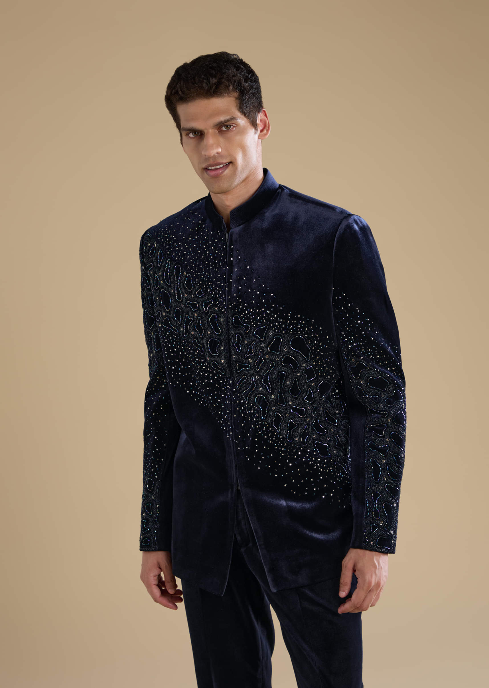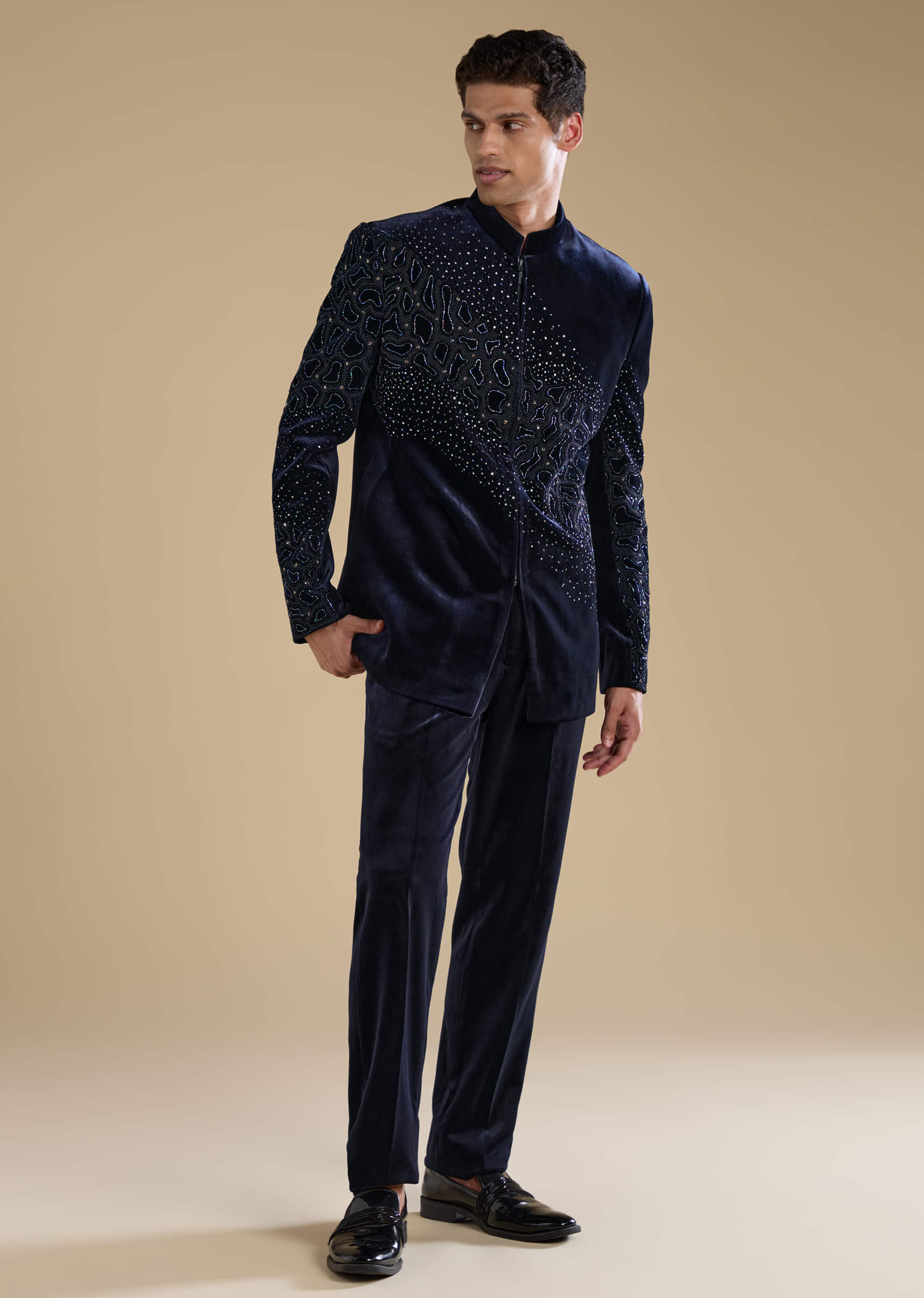 Sophisticated and opulent, this navy blue Jodhpuri set in rich velvet captures the spirit of modern royalty. The intricate sequin and cutdana work adds a delicate sparkle, perfectly complementing the depth of the velvet. Designed for the modern man who values elegance, this piece transitions seamlessly from ceremonial functions to glamorous events. Awarded as the Most Trusted Brand, we're delivering styles you love, just as promised.