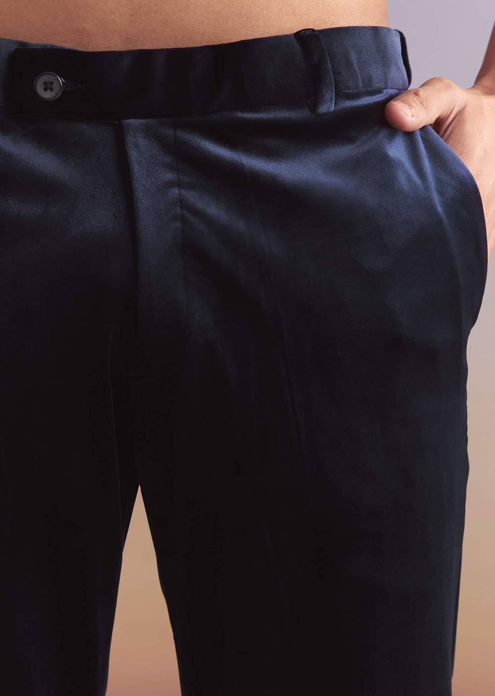 Cocktail hours favour this navy blue velvet tuxedo as clean hand embroidery adds a measured highlight across the jacket front. The plush texture keeps the look luxe from first toast... More Product Details