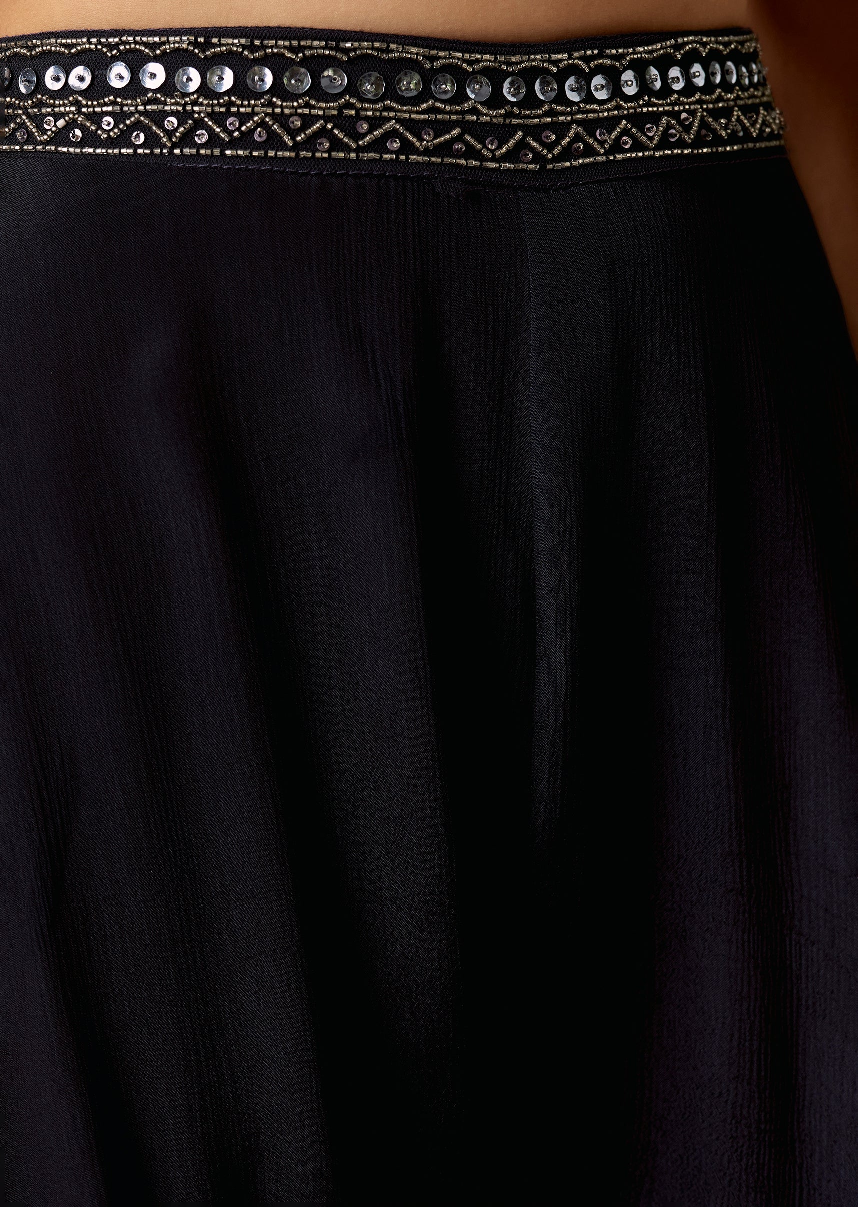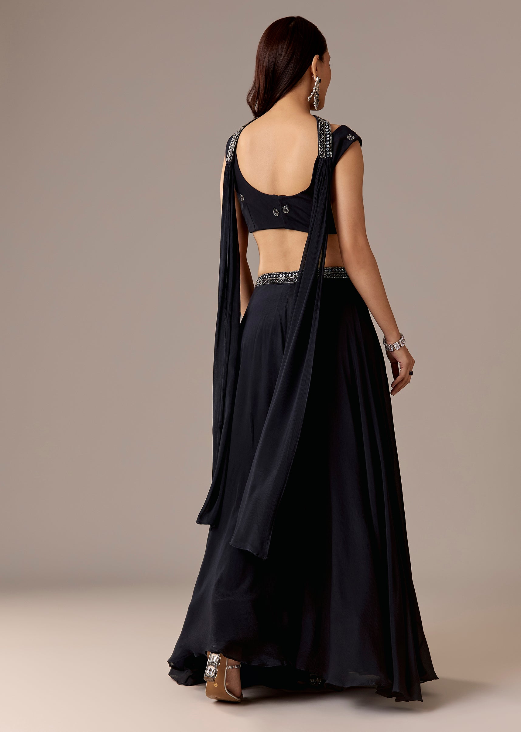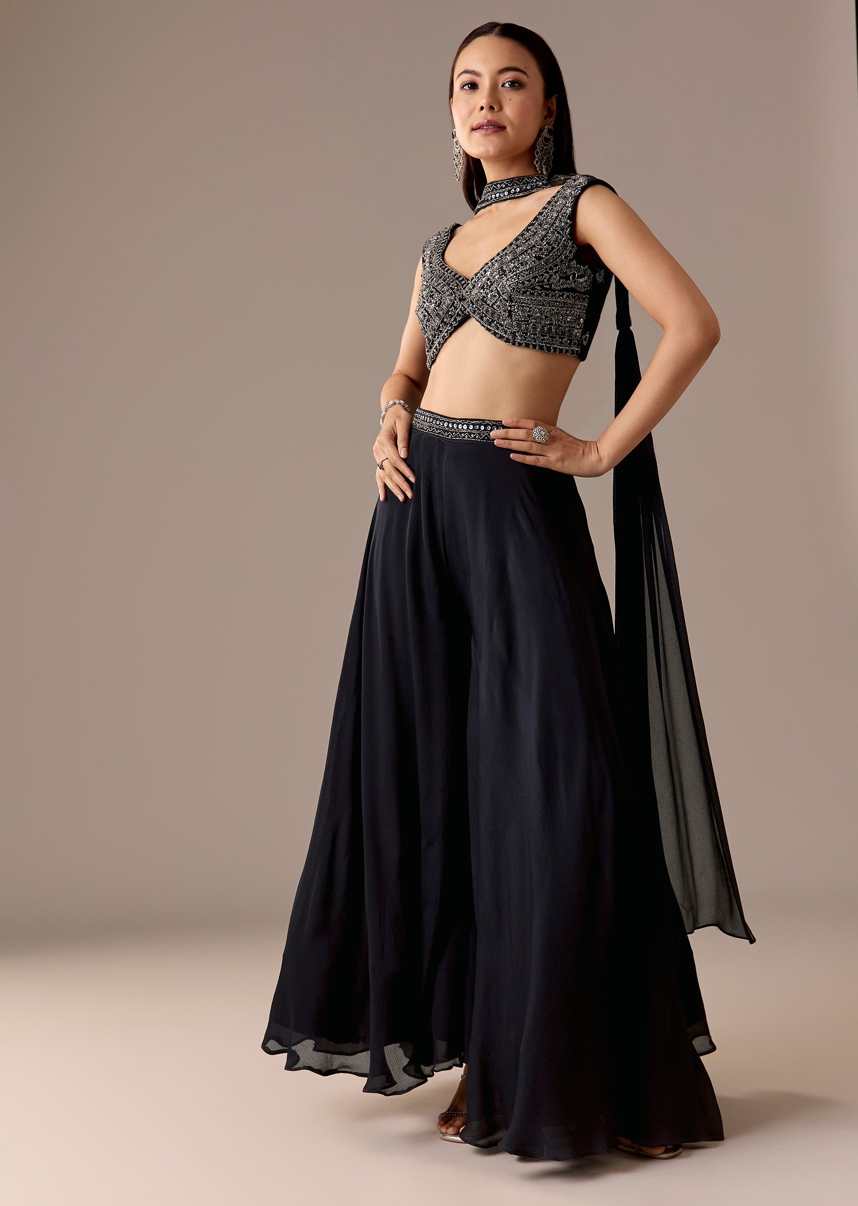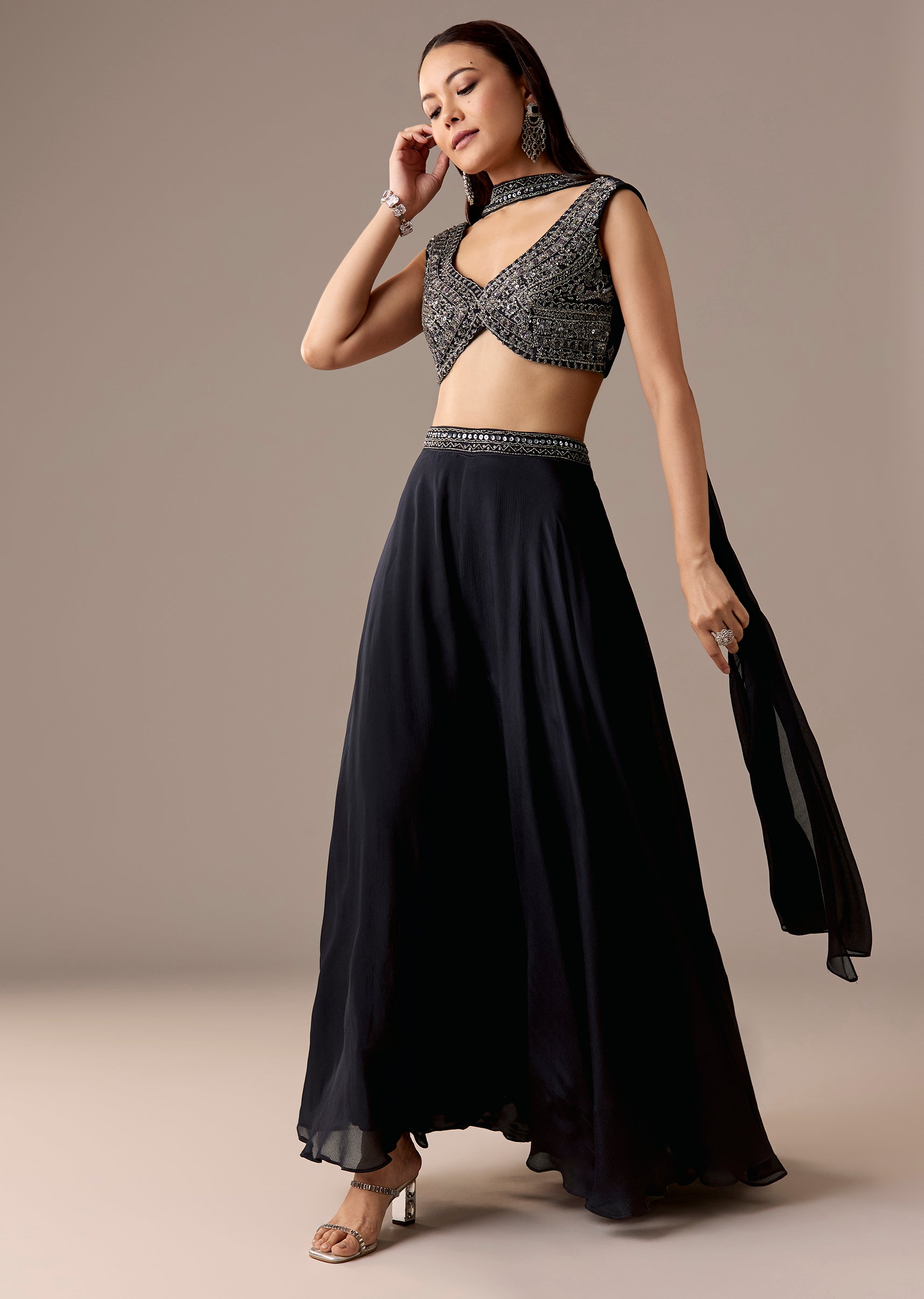 A contemporary navy set featuring a sleeveless V-neck crop top with cut-dana, beads, and sequins work, paired with mid-waist palazzos and a matching dupatta. Comfortable yet festive—great for engagement, sangeet, and reception.Awarded as the Most Trusted Brand, we're delivering styles you love, just as promised.