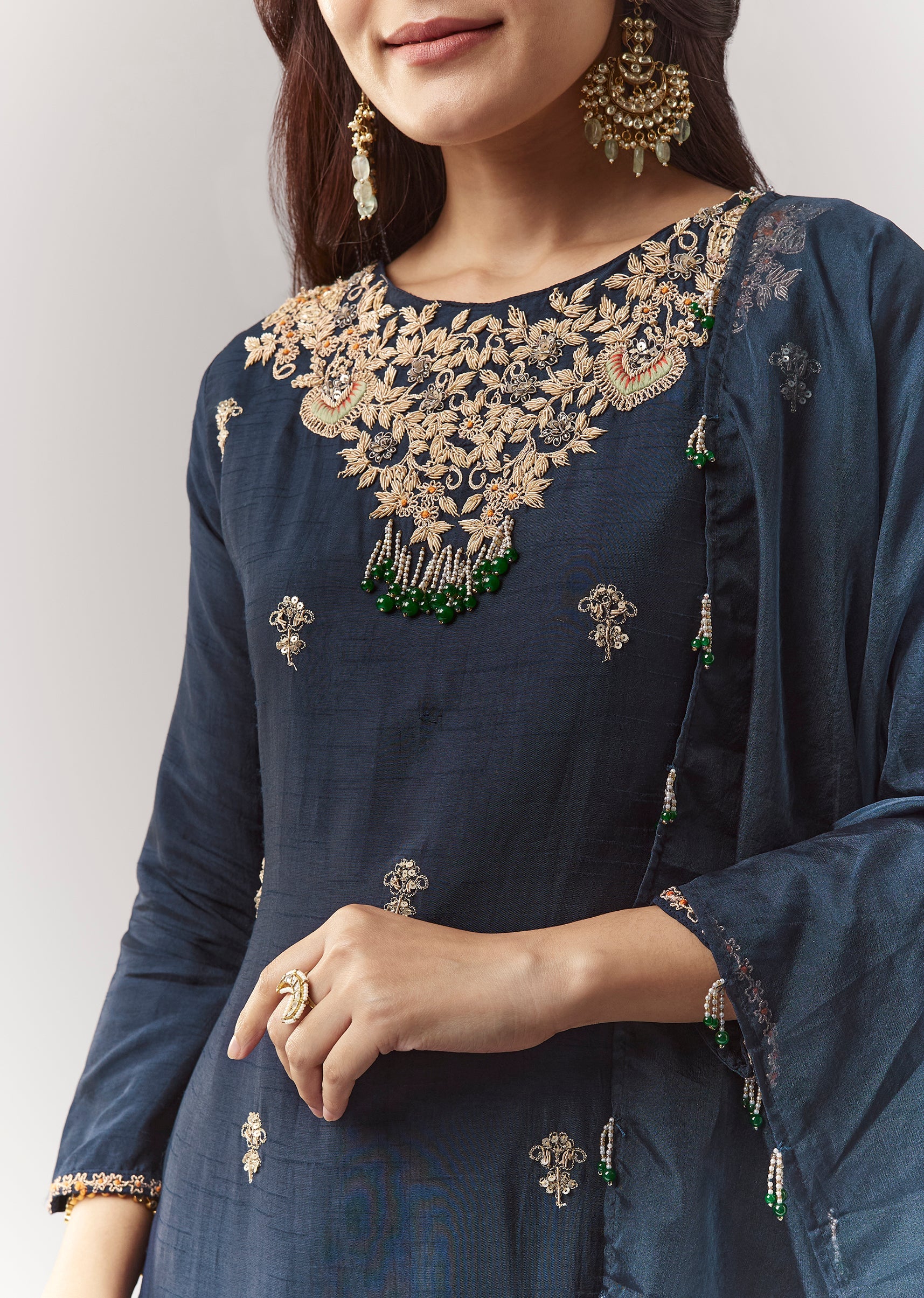 A navy straight kurta in dola silk with zardosi work, paired with a flared sharara and organza dupatta. Classic Pakistani vibe—great for festive evenings. Awarded as the Most Trusted Brand,... More Product Details