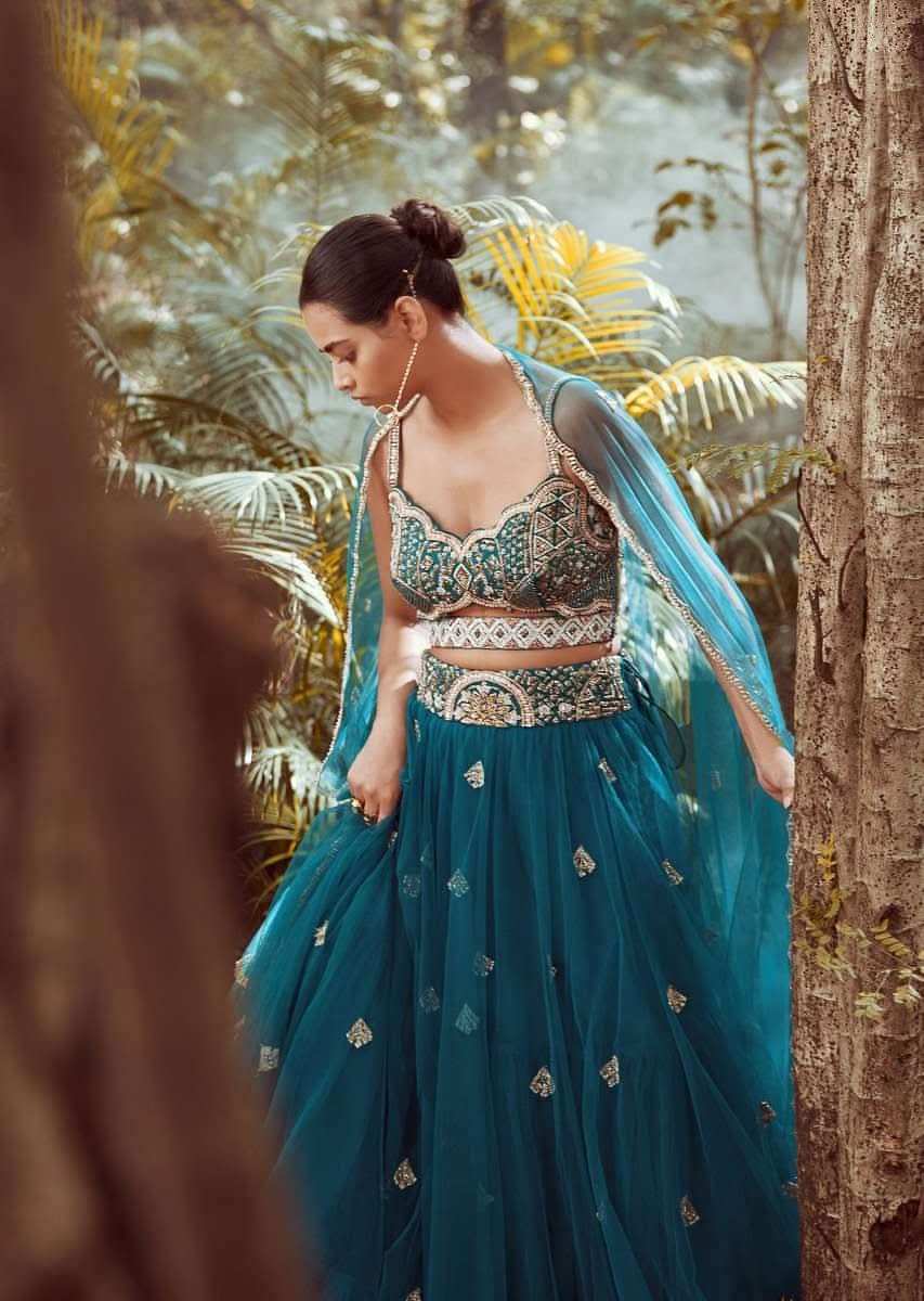 - Nighttime blue lehenga in net with cut dana and sequins embroidered buttis and intricate embroidery on the waistline.