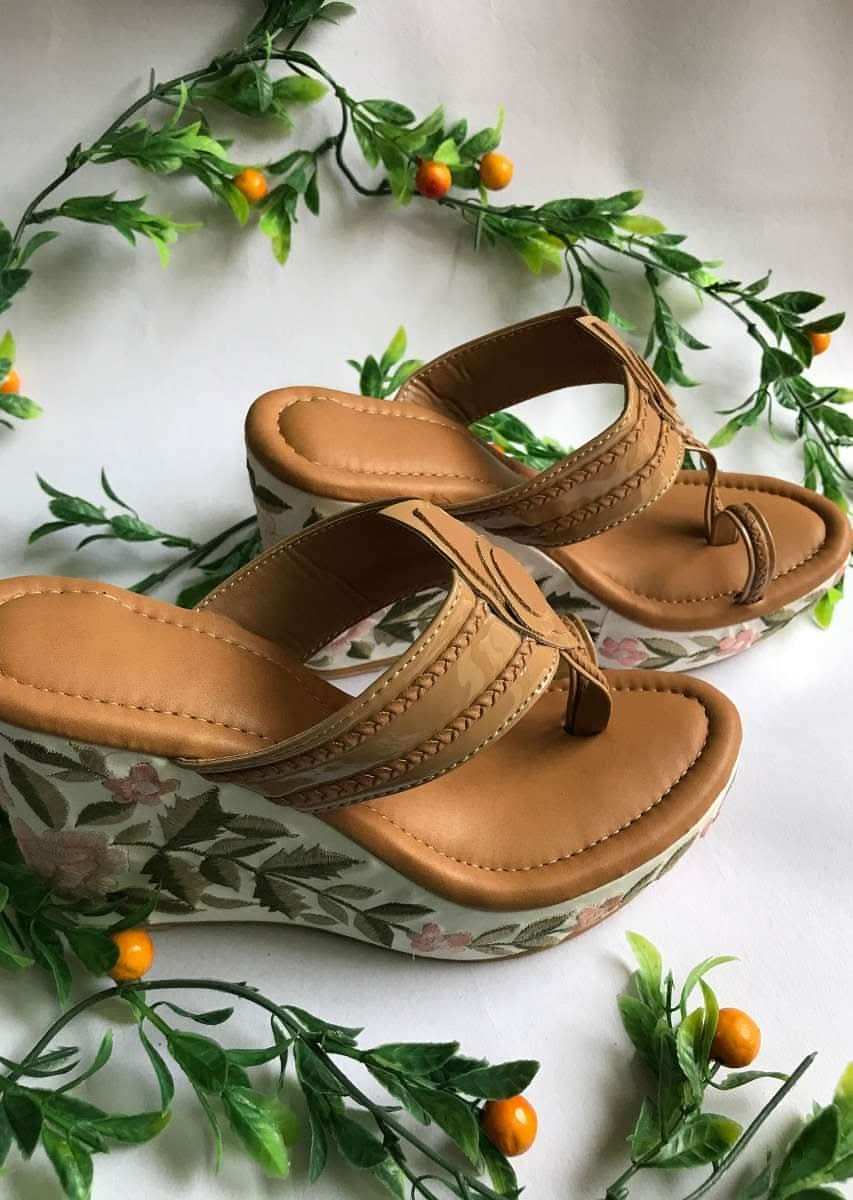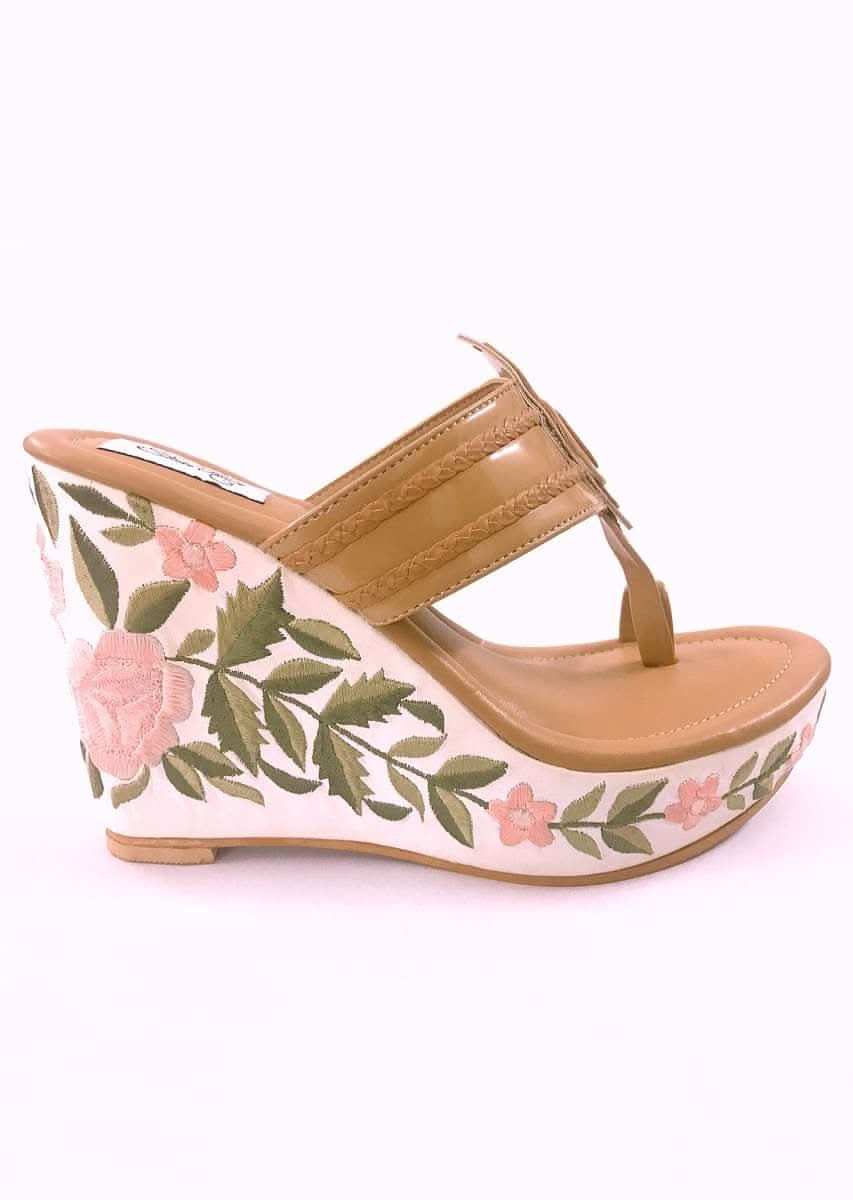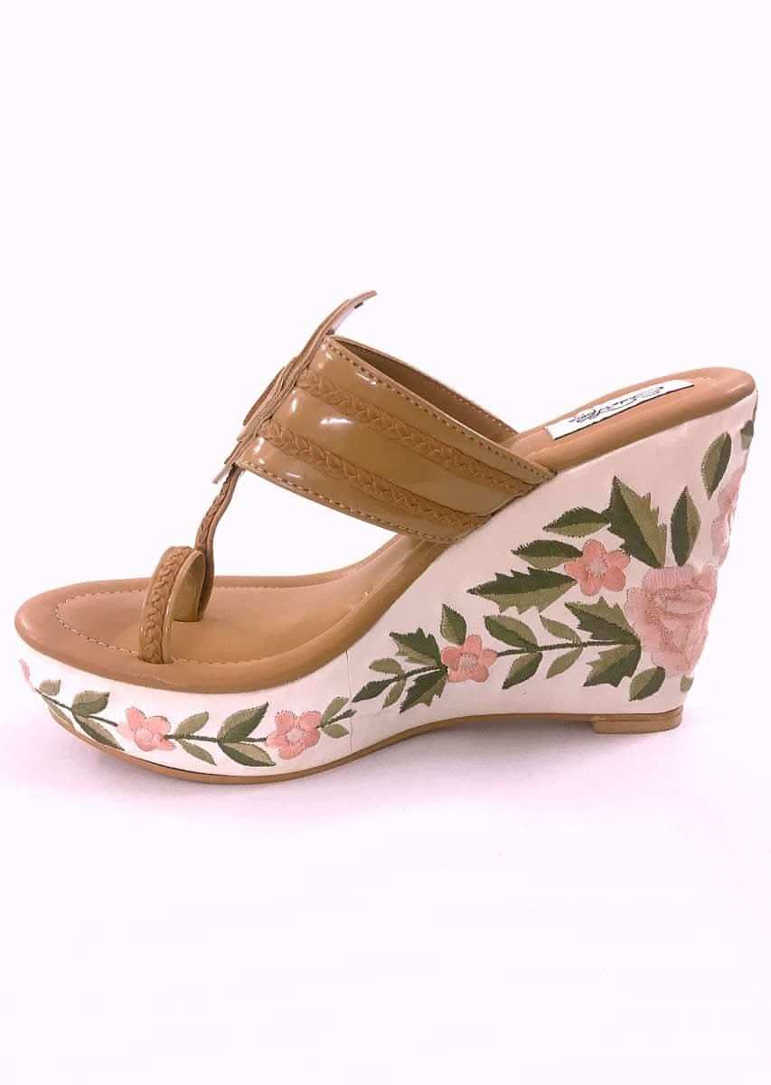 Nude Designer Kolhapuris With Resham Embroidered Floral Design On The Wedge Heel By Soul House
