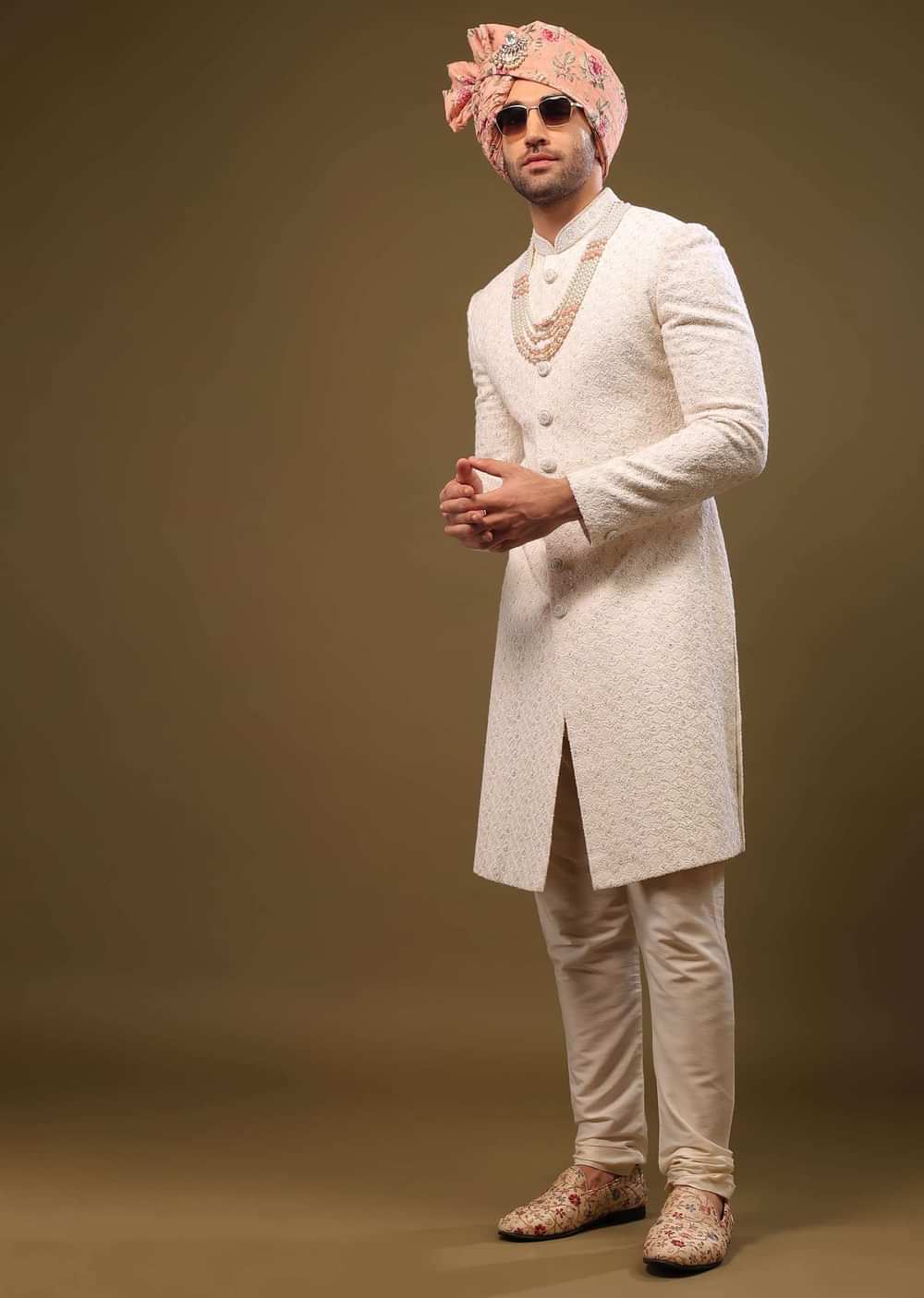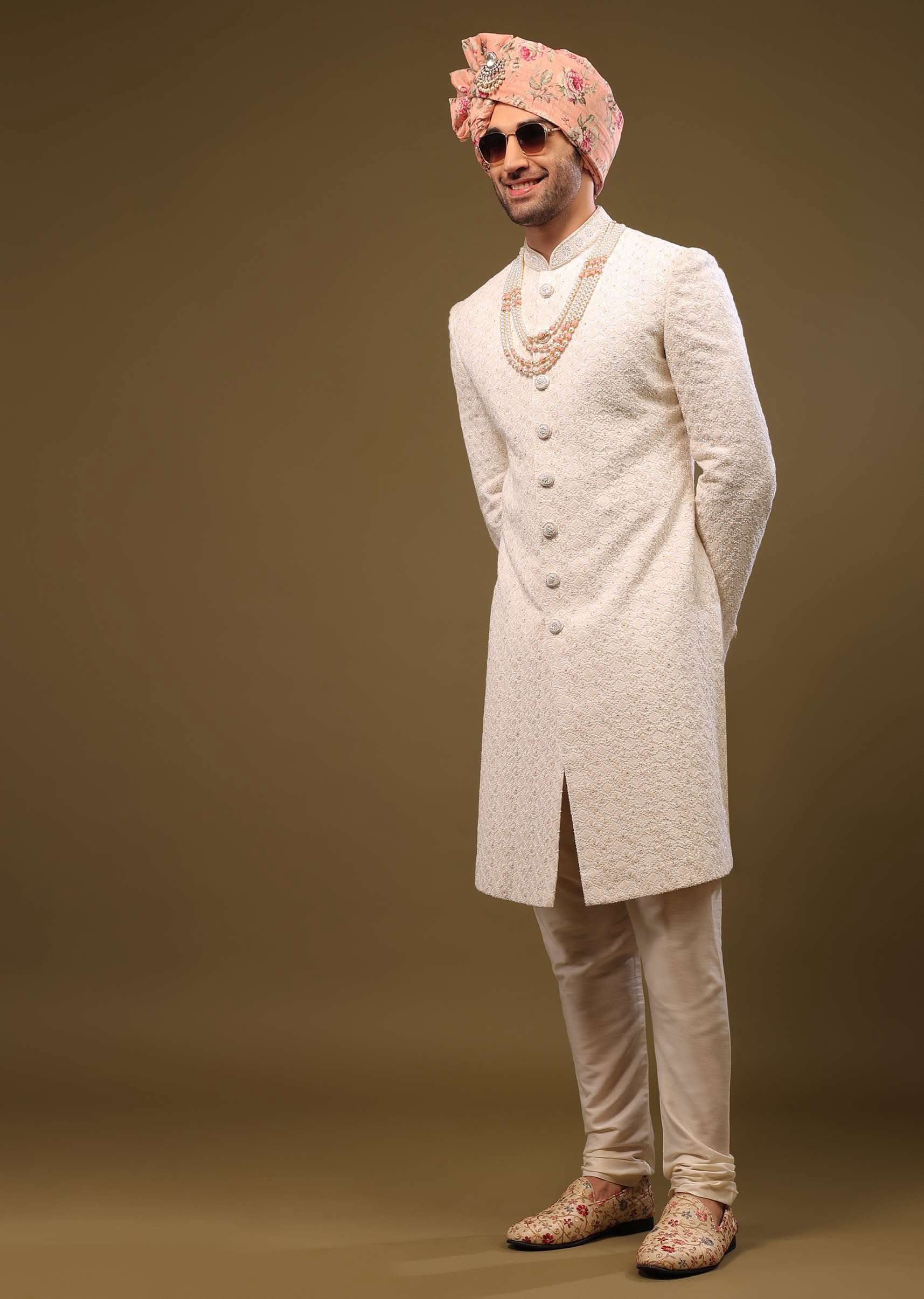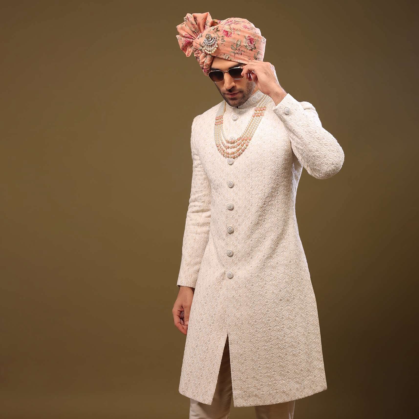 - A magnificent whisper-white lucknowi sherwani set crafted in a hand-embroidered zari and cut-dana work in a beautiful design.