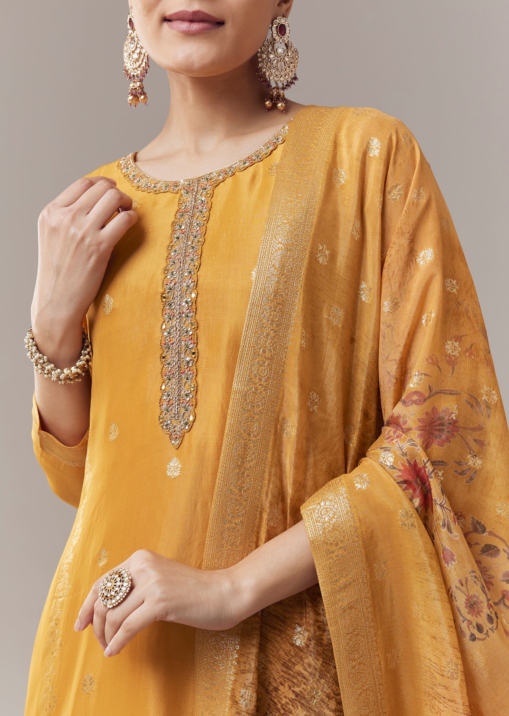 Ochre Yellow Kurta Set With Banarasi Organza Weave And Dupatta