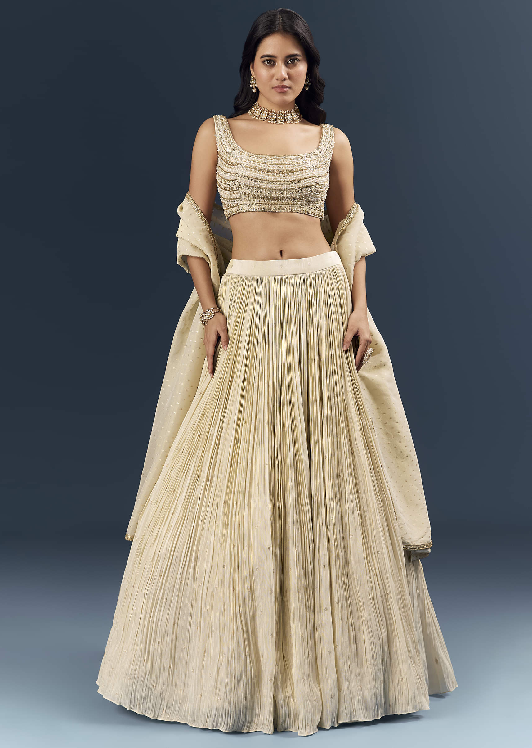 Minimal in palette and rich in texture, this off-white banarasi silk bridesmaid lehenga creates a calm, high-end mood. Intricate embroidery layers zardosi contouring with subtle sequin and bead highlights, finished... More Product Details