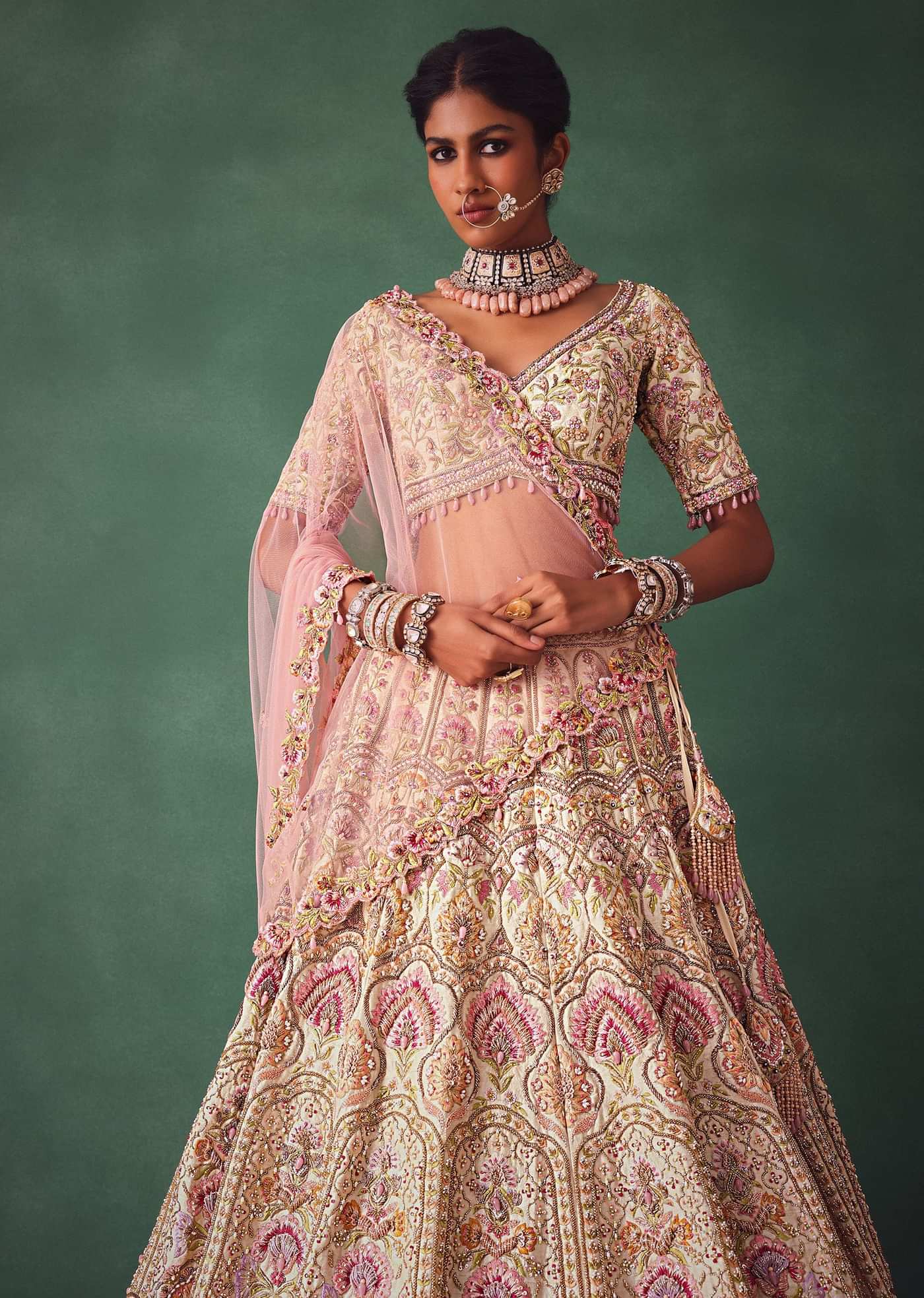Step into a world of sheer elegance with this offwhite bridal lehenga blouse and dupatta set adorned with enchanting multicolor thread work embroidery. Made from luxurious raw silk and delicate... More Product Details