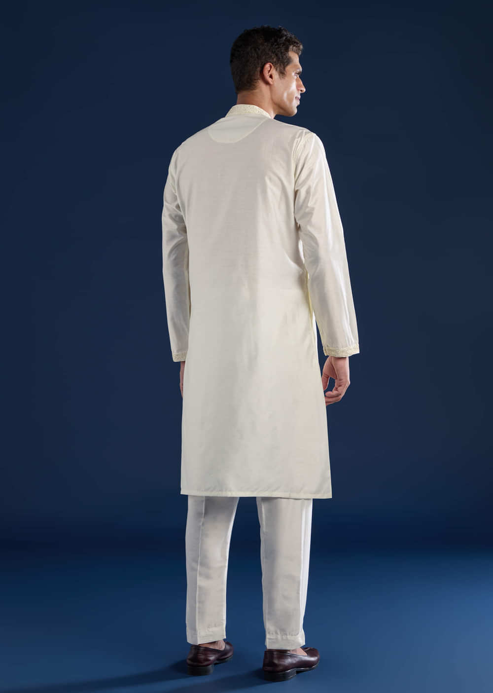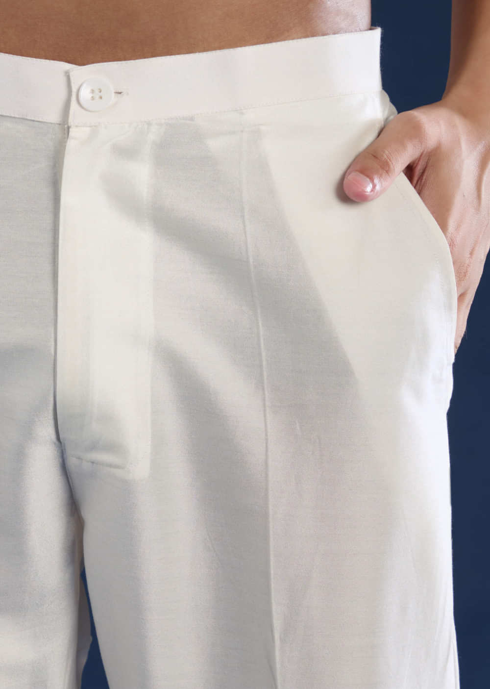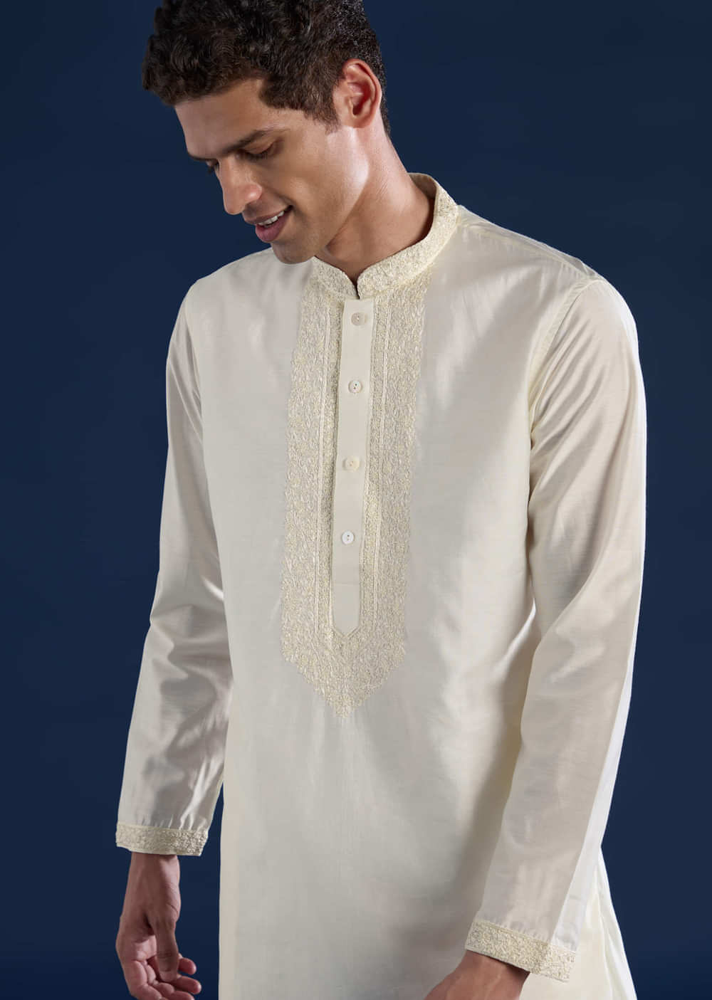 Off White Chanderi Kashmiri Work Mens Kurta and Pant Set
