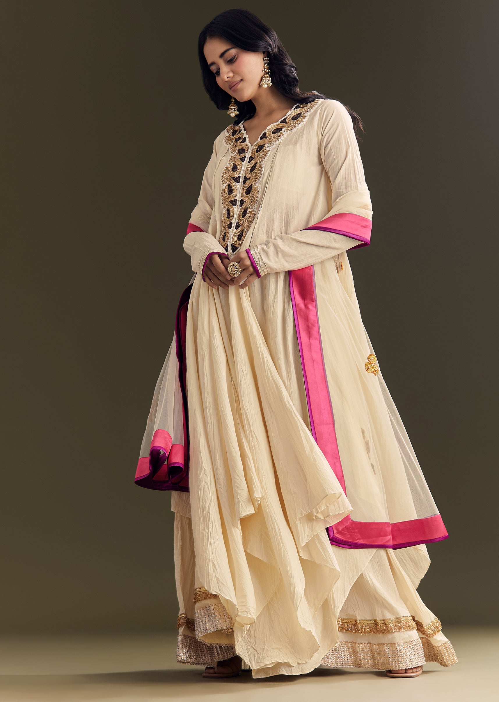 Off White Cora Cotton Asymmetrical Kurta Palazzo With Net Dupatta