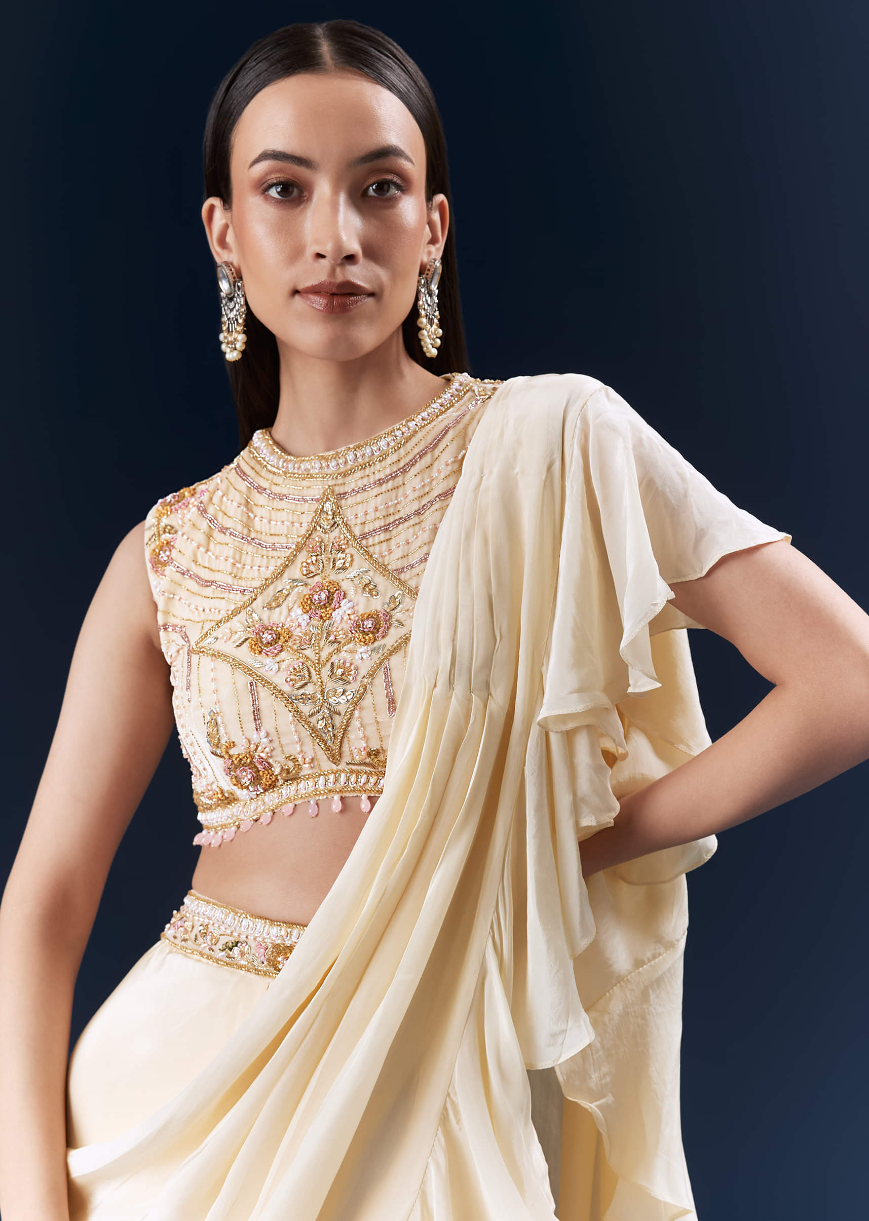 Fit Tips:The blouse should feel held and contoured, while the pre-pleated saree locks at the waist and the pallu falls cleanly.