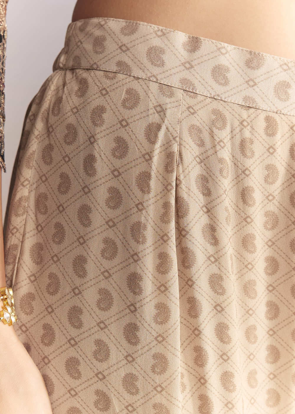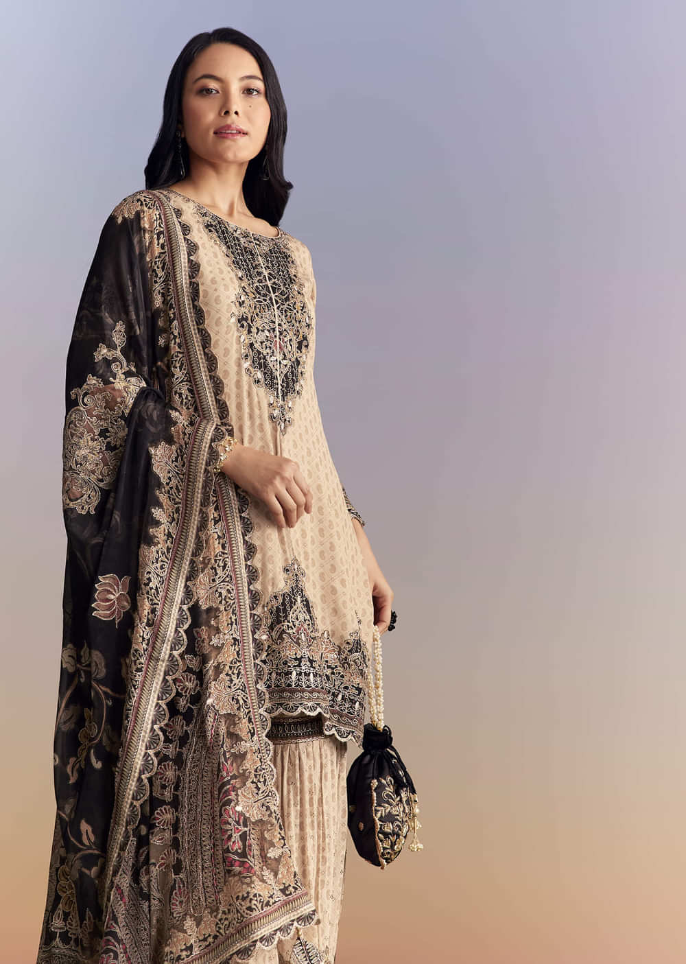 The kurta should feel secure at the bodice, while the sharara sits at mid-waist with a fluid flare for easy movement.