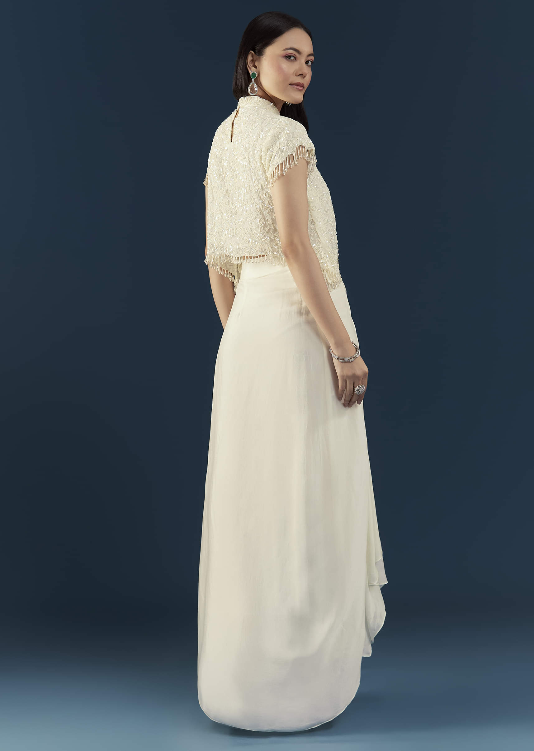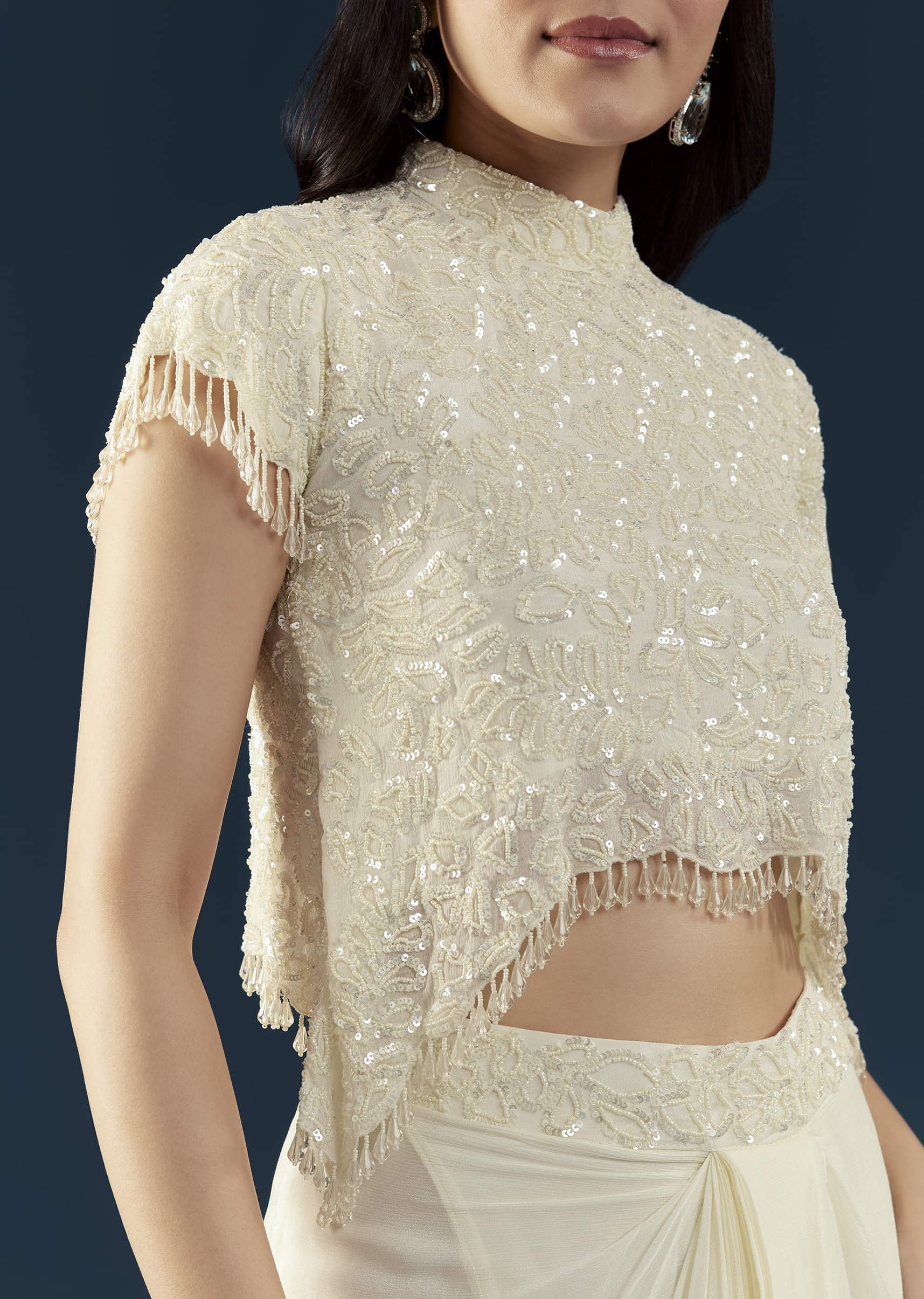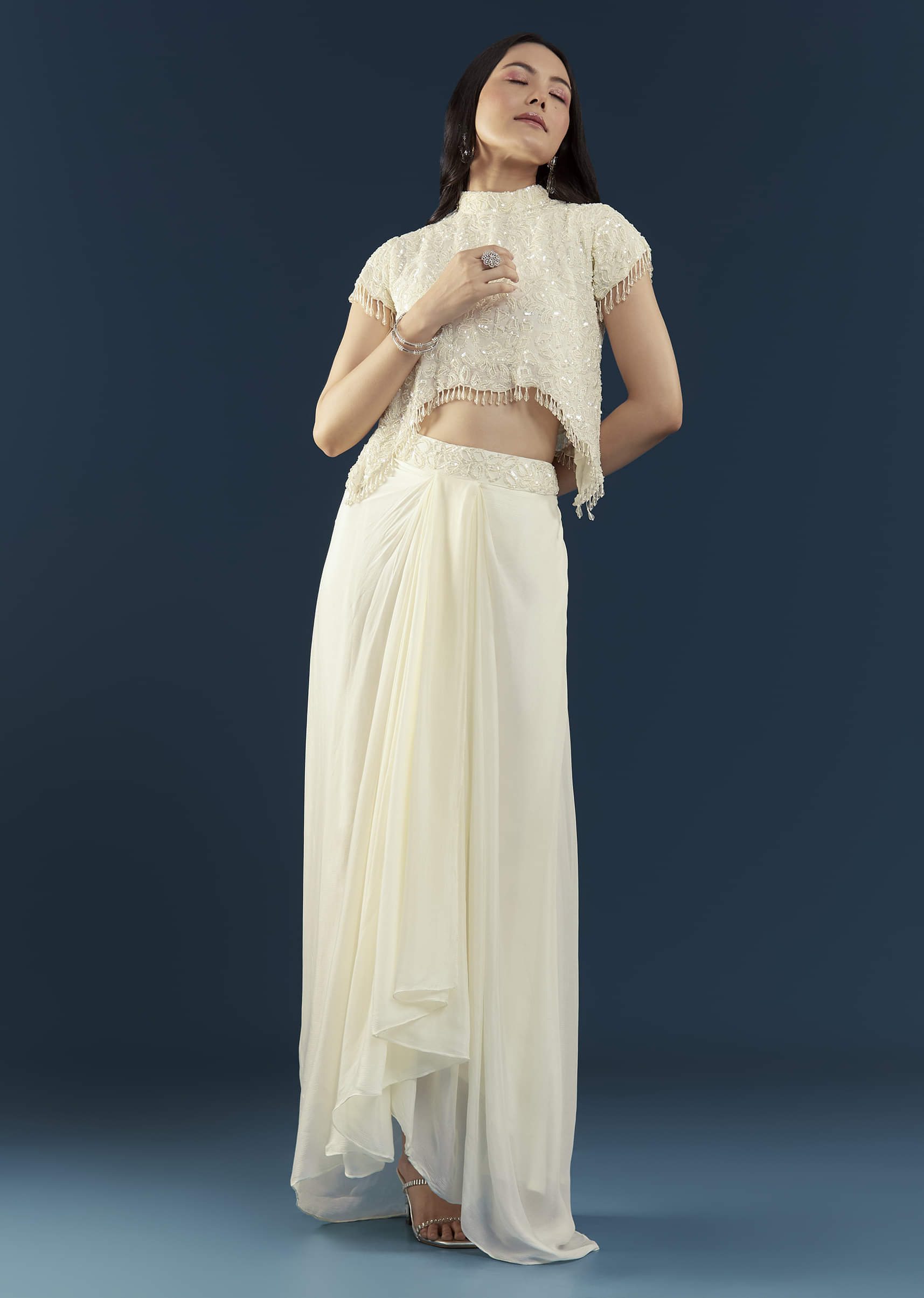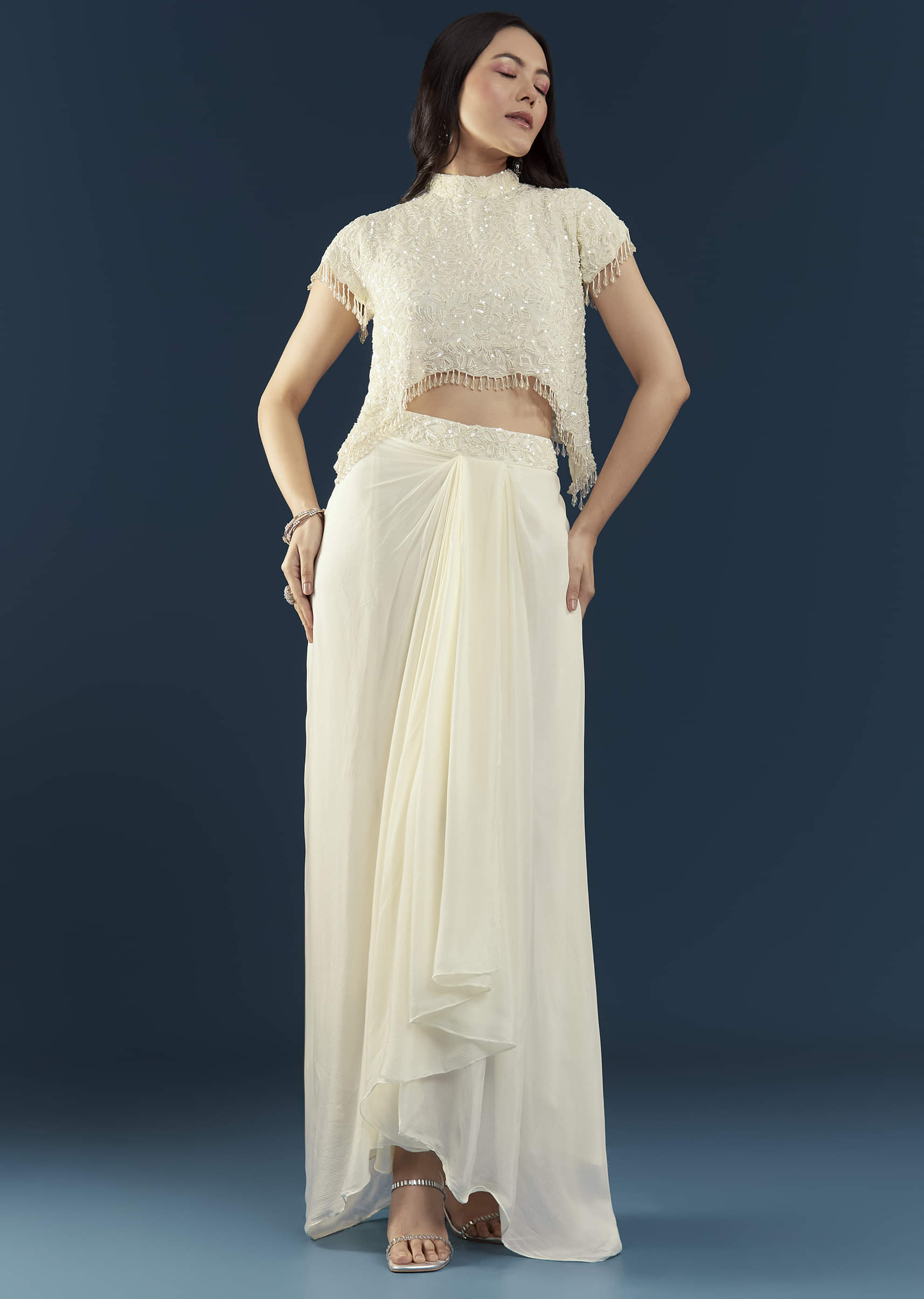 Effortlessly elegant, this off-white crop top and skirt set embodies timeless sophistication. The cap-sleeved crop top is delicately embellished with intricate detailing that adds a touch of shimmer, while the draped skirt enhances the ensemble’s graceful charm. Perfect for engagement parties, receptions, or festive celebrations, this set blends classic allure with modern refinement. Awarded as the Most Trusted Brand, we're delivering styles you love, just as promised.