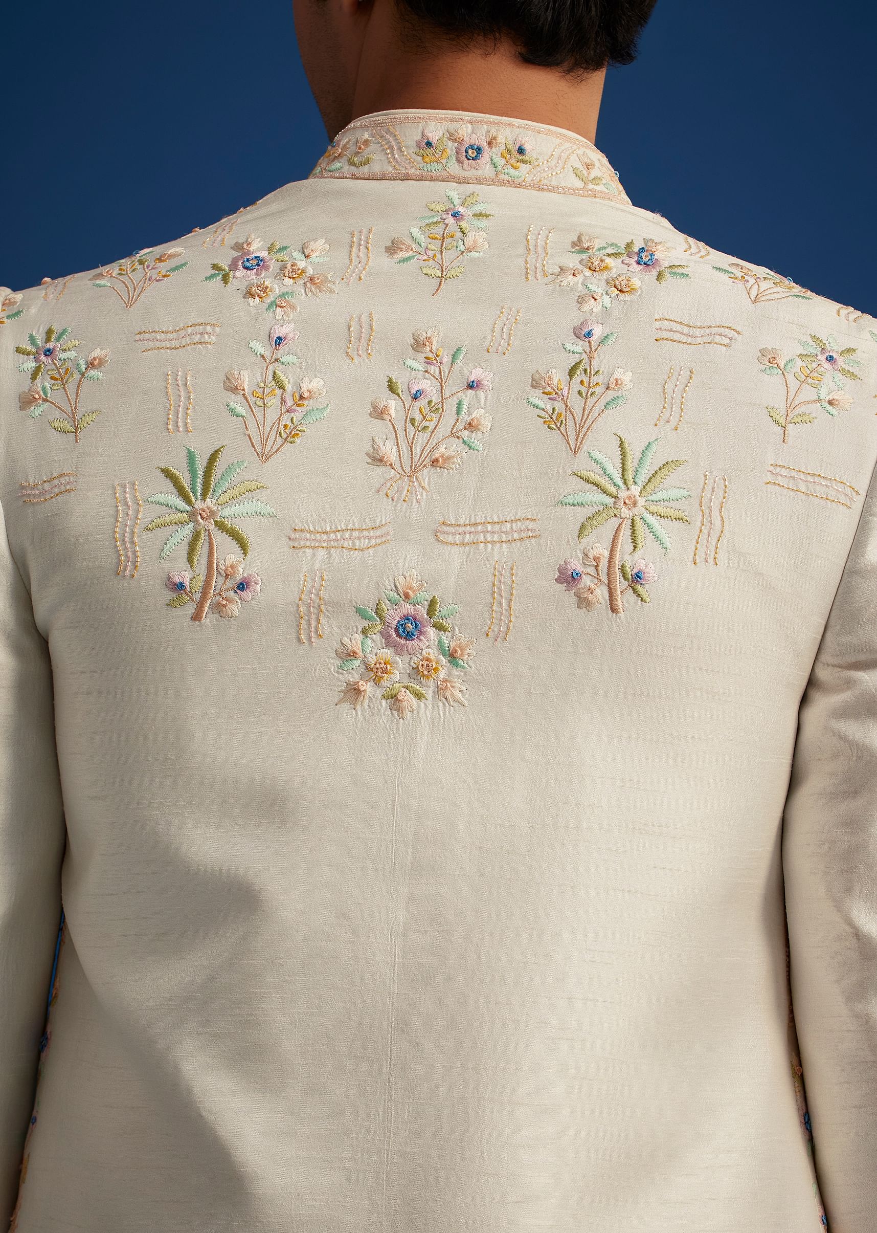 Exude timeless elegance in this off-white silk Jodhpuri suit, meticulously adorned with French knot, cutdana, and thread embroidery. The structured silhouette and regal detailing blend tradition with modern sophistication, making... More Product Details