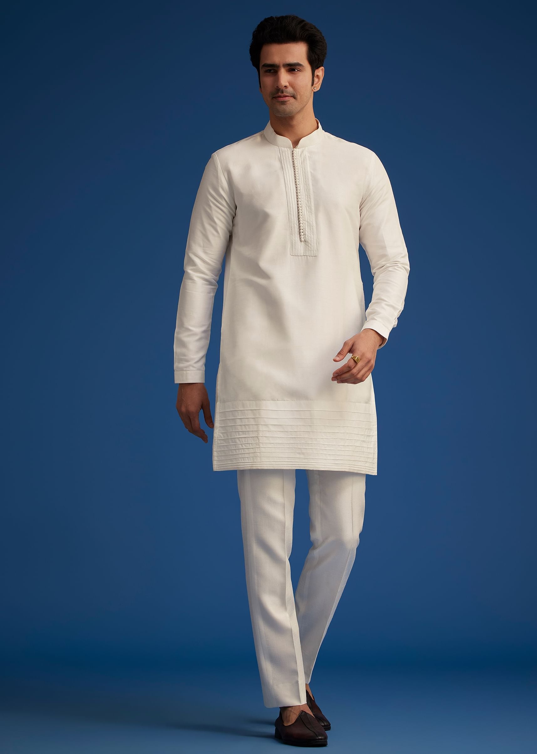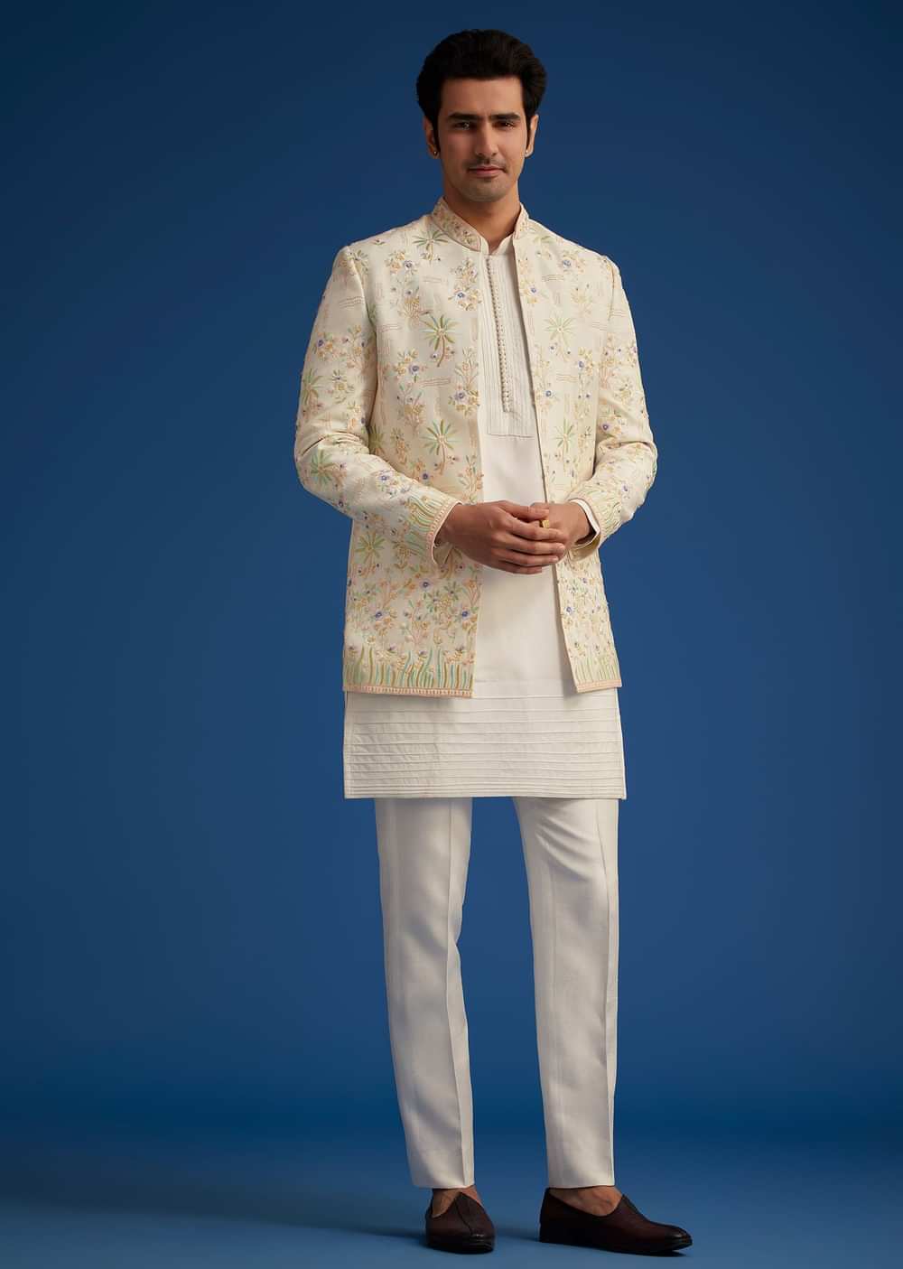 Exude timeless elegance in this off-white silk Jodhpuri suit, meticulously adorned with French knot, cutdana, and thread embroidery. The structured silhouette and regal detailing blend tradition with modern sophistication, making it a distinguished choice for weddings and formal celebrations. The luxurious silk fabric ensures comfort while maintaining a sharp, polished look. Elevate your style with this masterpiece that embodies grandeur and refinement.Awarded as the Most Trusted Brand, we're delivering styles you love, just as promised.