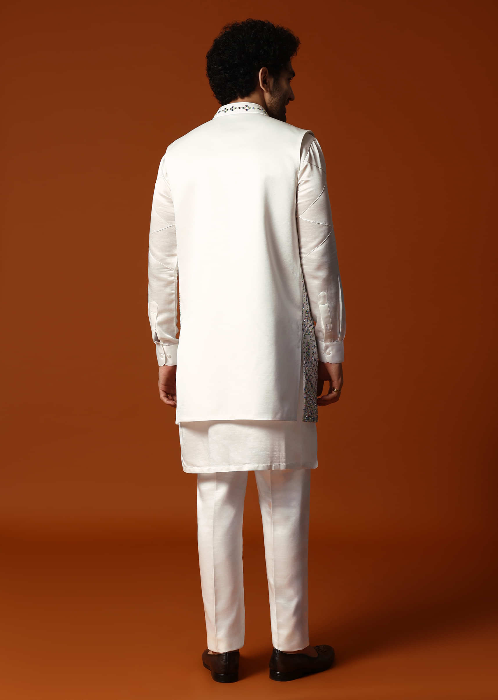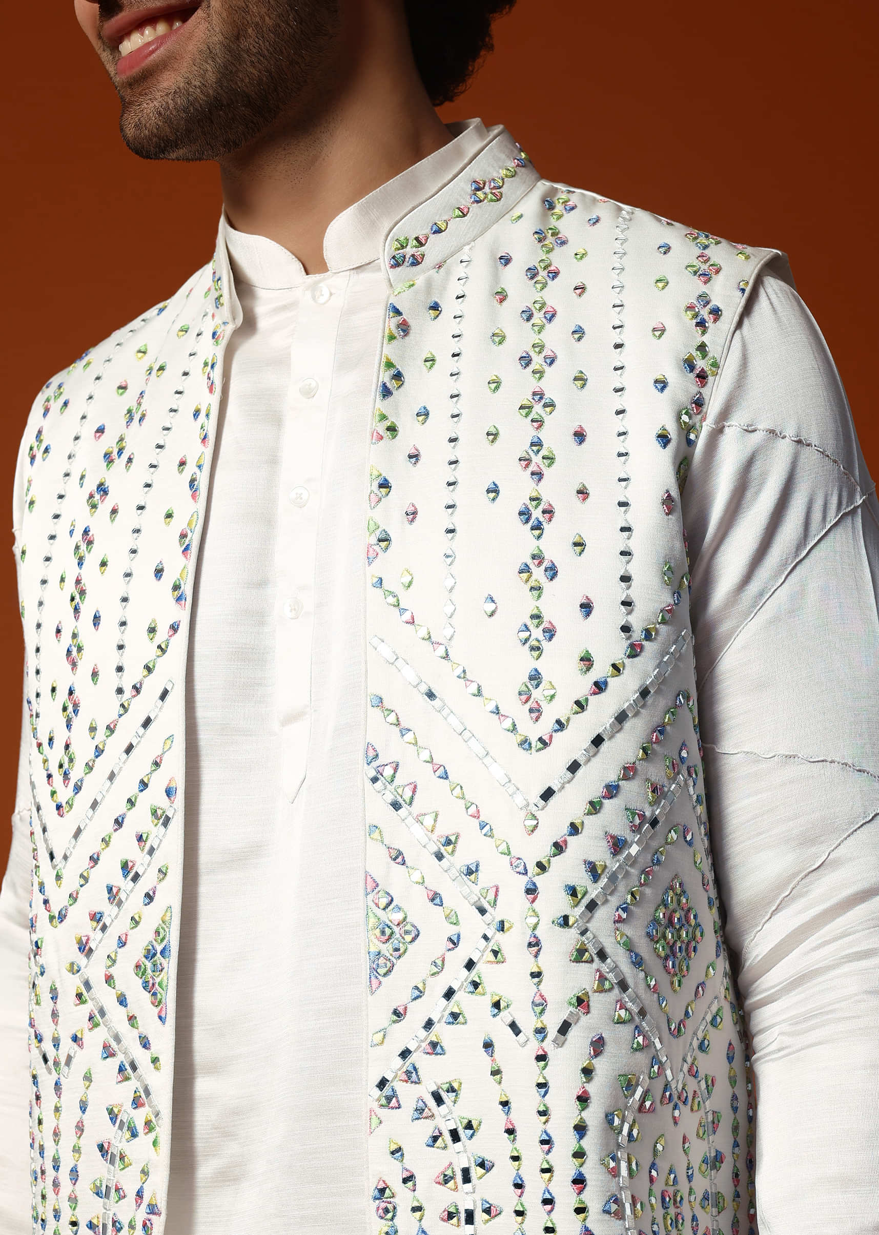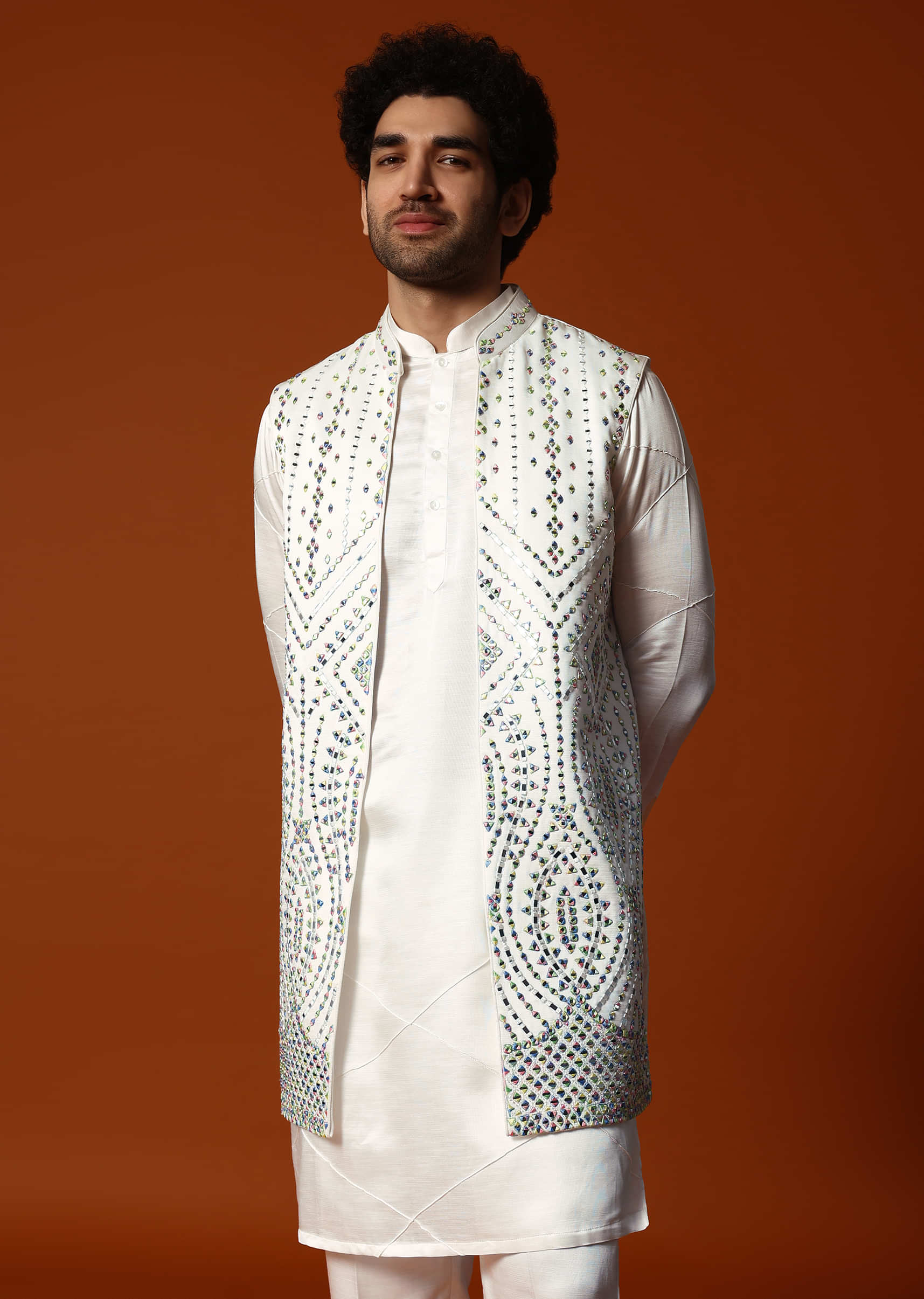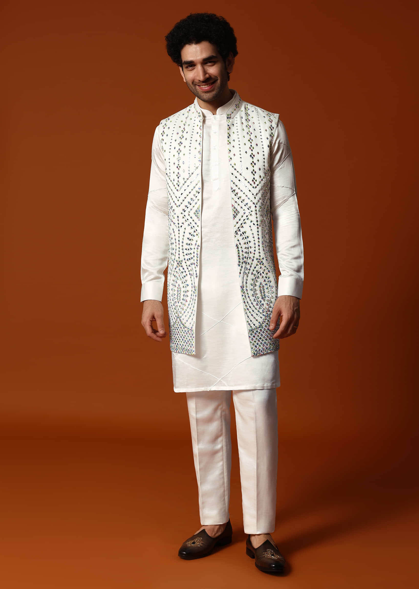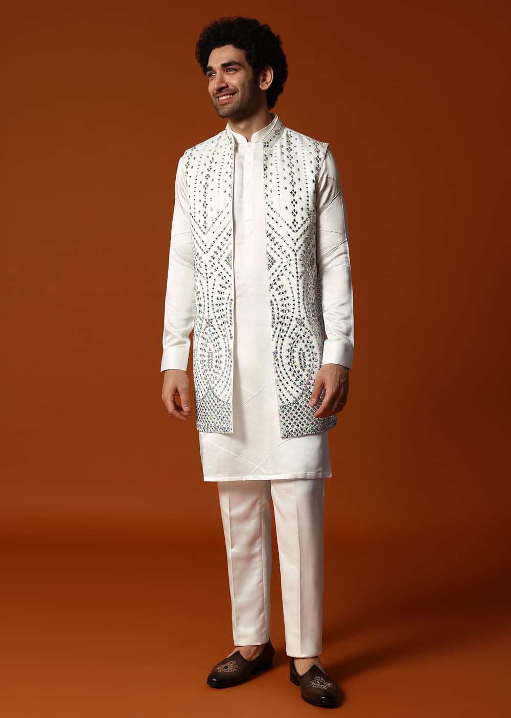 - Adorn yourself with the exquisite off white kurta jacket set, designed for sangeet and wedding ceremonies.