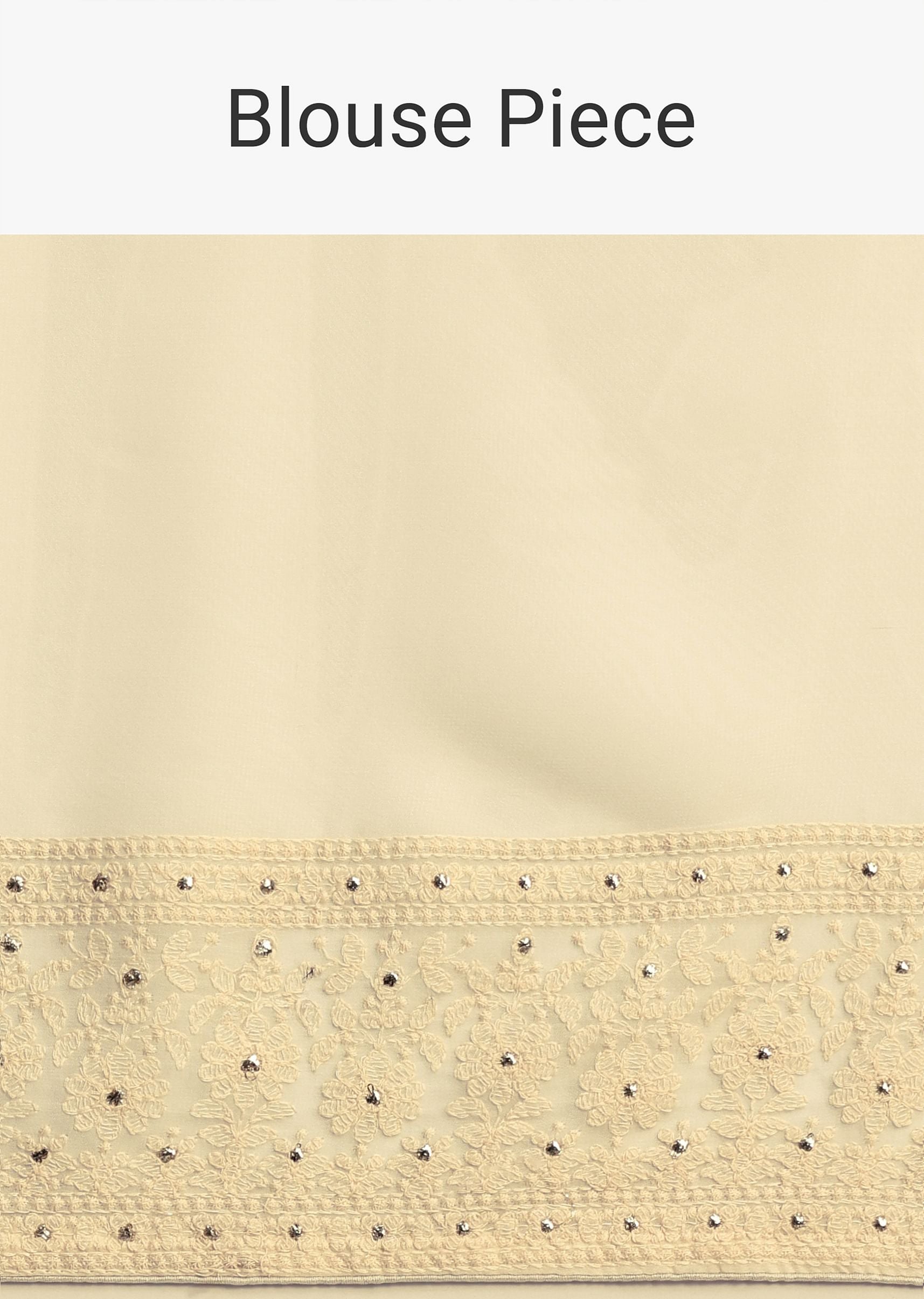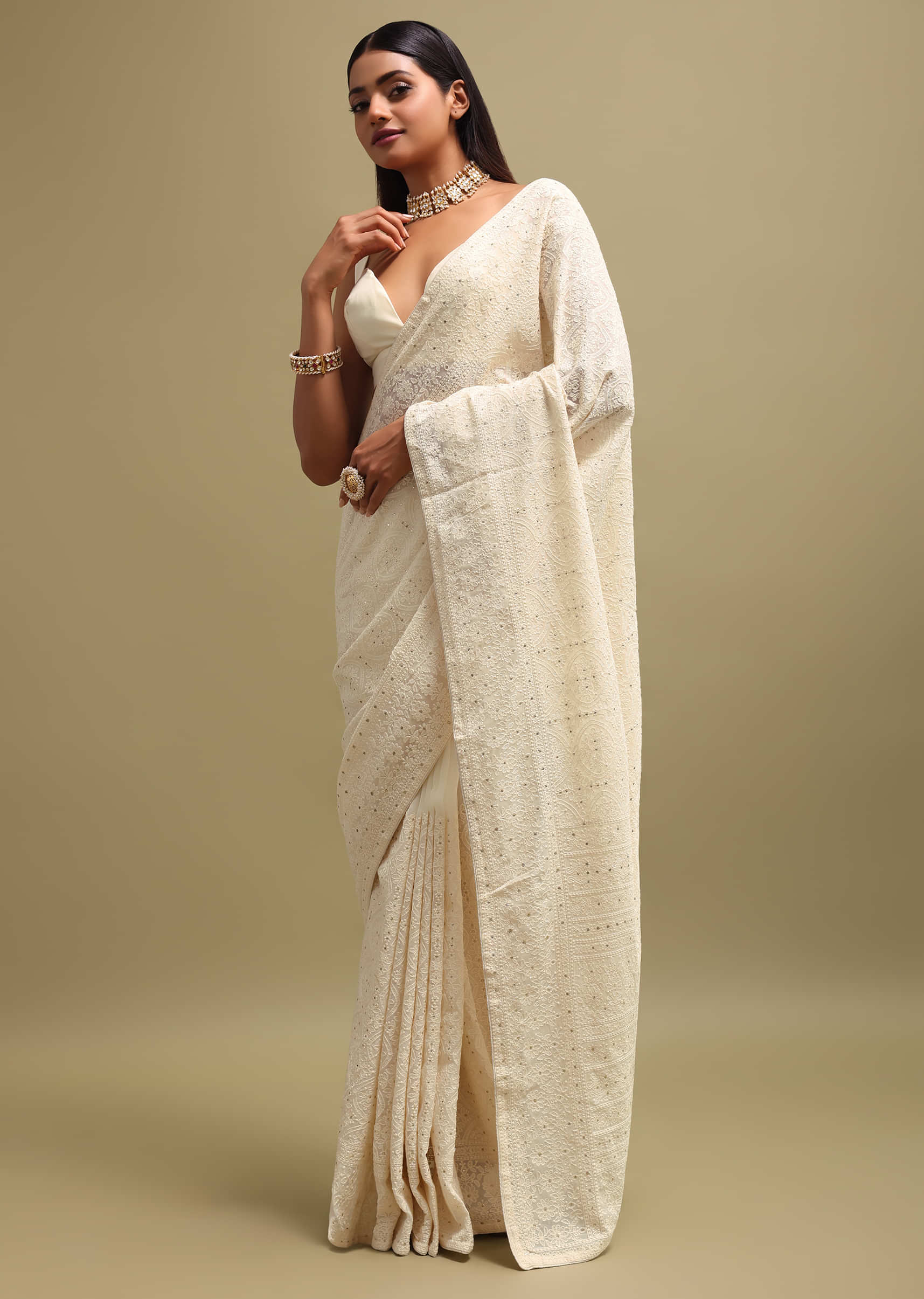 Off White Georgette Chikankari Saree With Unstitched Blouse