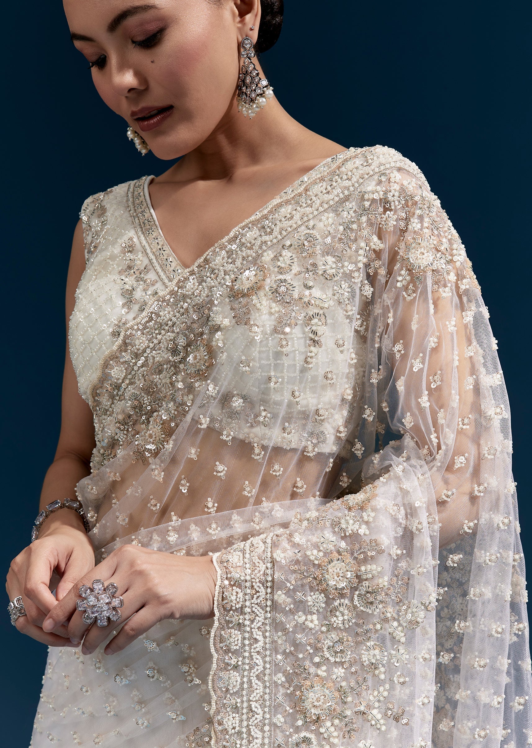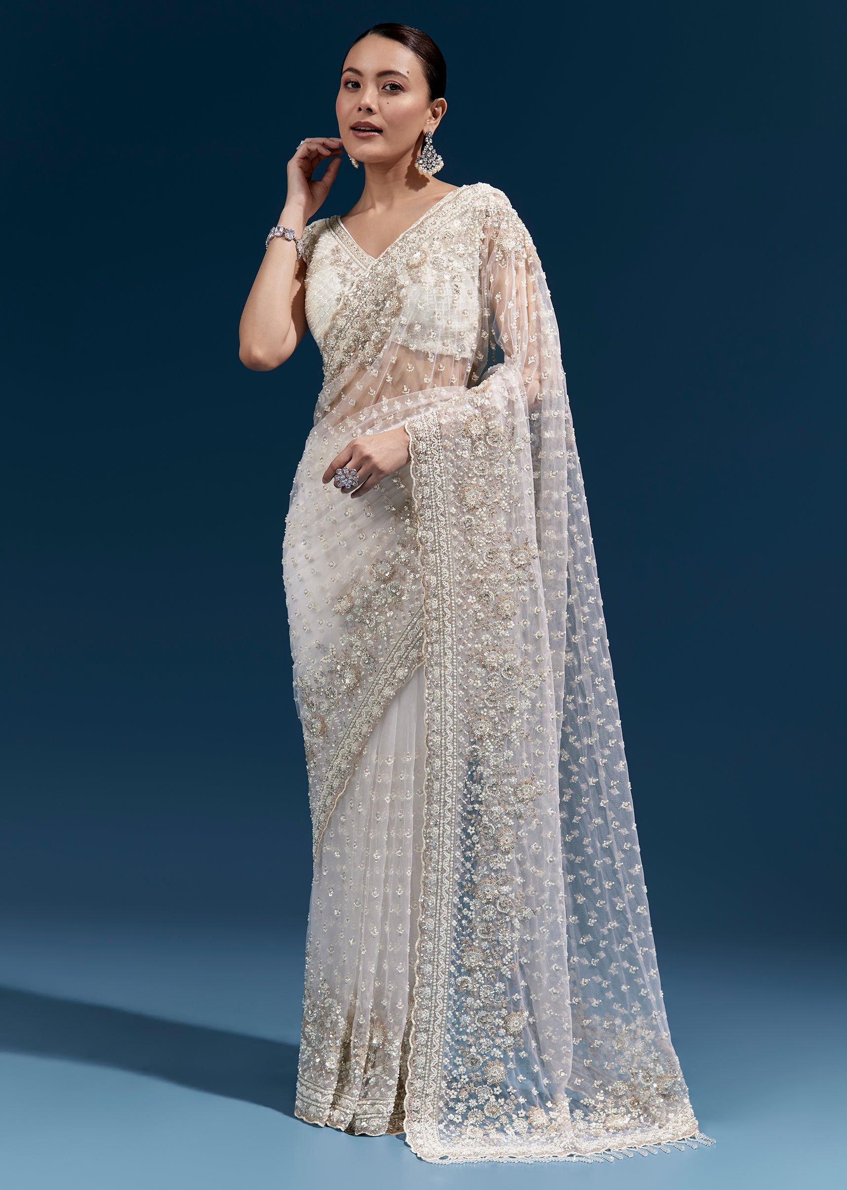 An off-white net saree with heavy floral embroidery enhanced with resham thread work, cutdana, sequins and beads. Finished with a scalloped border, tassels on the pallu, and heavy embroidered blouse fabric—ideal for mehendi, engagement and sangeet celebrations. Awarded as the Most Trusted Brand, we're delivering styles you love, just as promised.