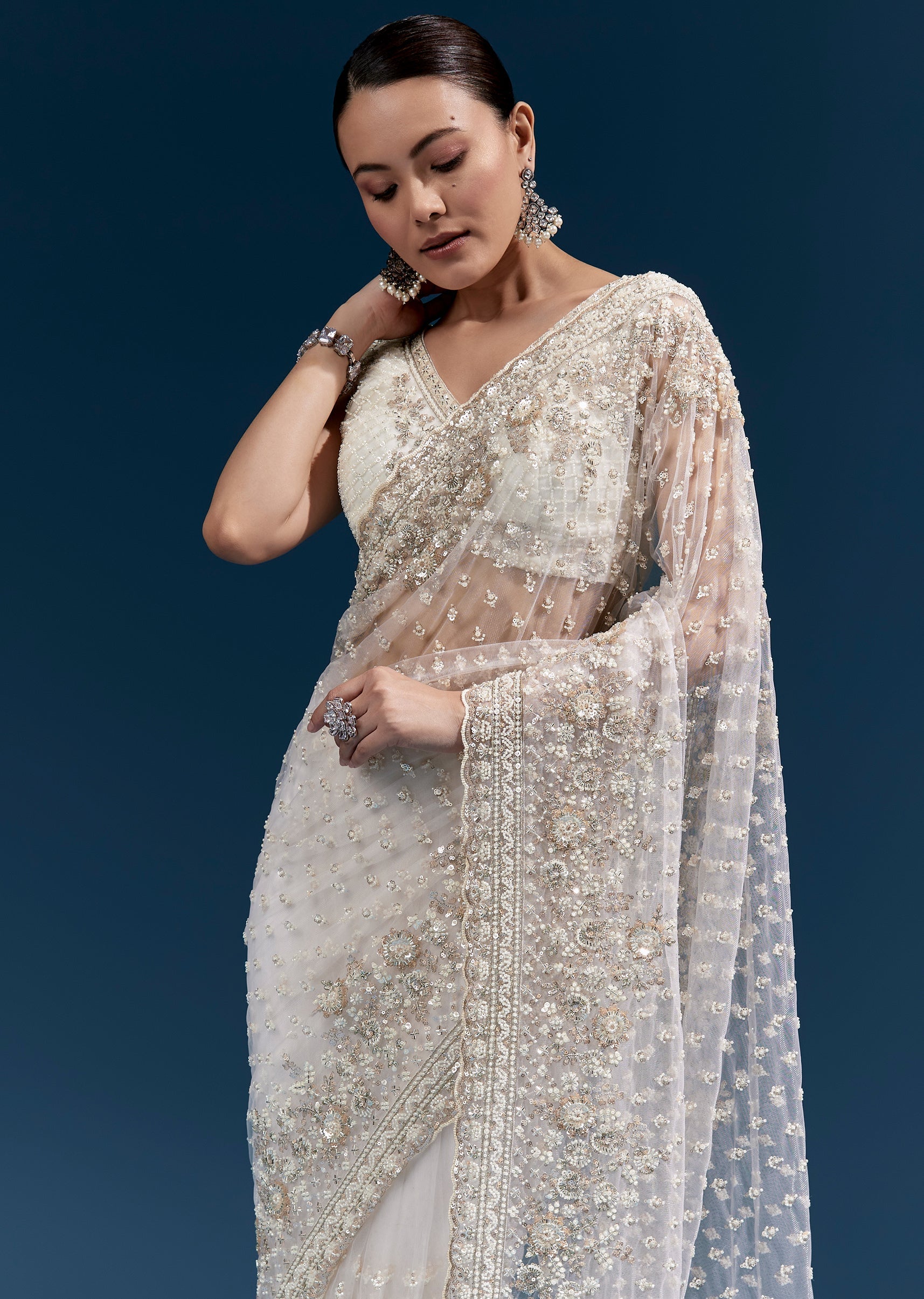 An off-white net saree with heavy floral embroidery enhanced with resham thread work, cutdana, sequins and beads. Finished with a scalloped border, tassels on the pallu, and heavy embroidered blouse... More Product Details
