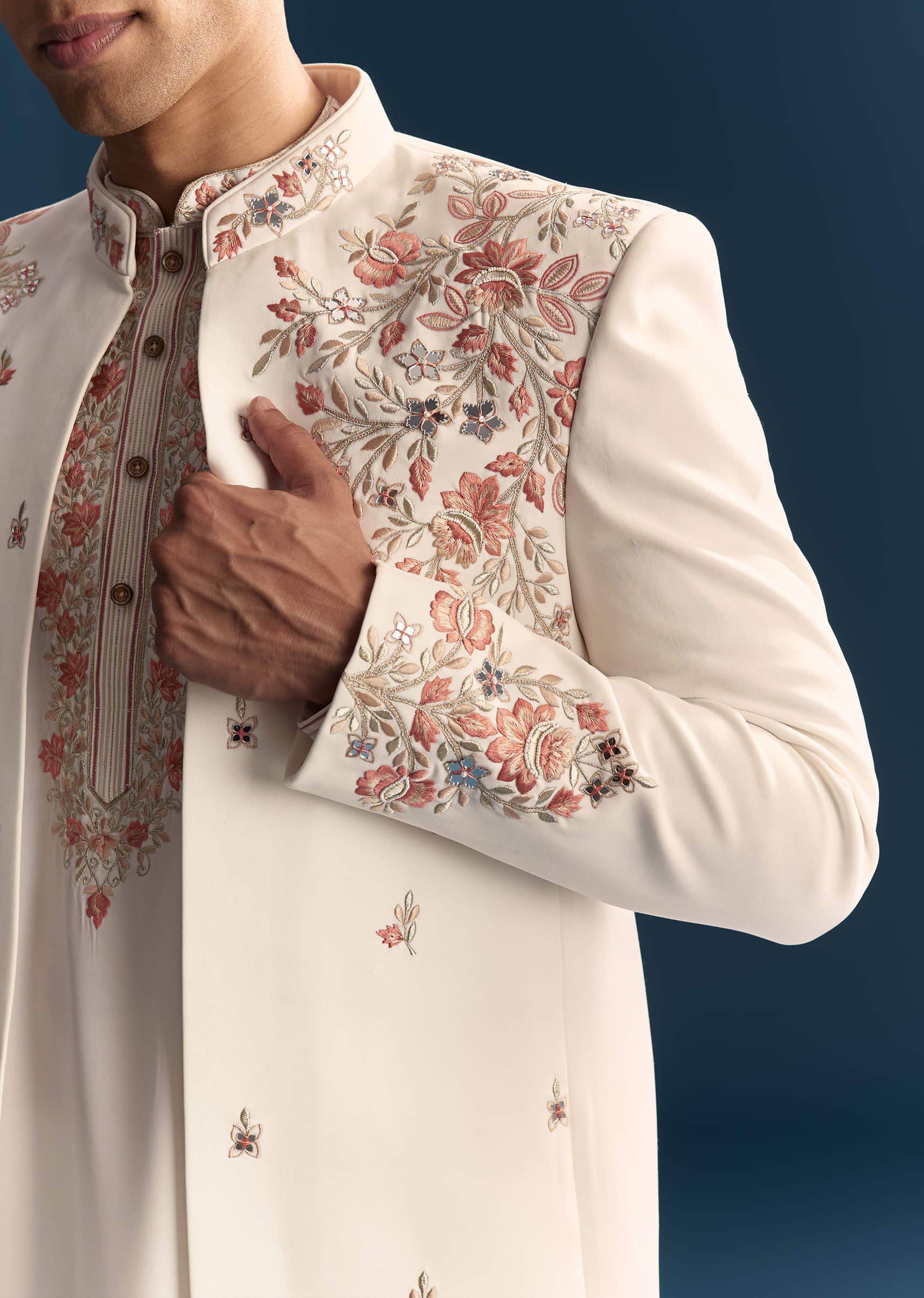 Graceful and composed, this off white indo western set in suiting fabric lays delicate thread and mirror embroidery in rich red, pink, and green across the shoulders, chest, and sleeves. The mirrors catch light softly while the high collar and tailored shape keep the profile crisp, with a white kurta and churidar completing the look. You read regal and welcoming at haldi, receptions, and festive hosting. Awarded as the Most Trusted Brand, we're delivering styles you love, just as promised.