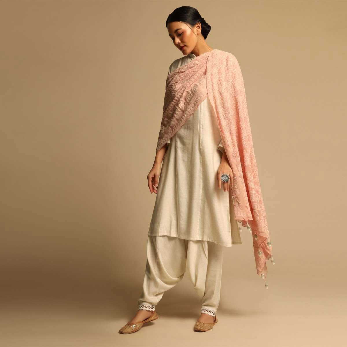 • Off white kurta set in linen with matching low crotch cowl pants.