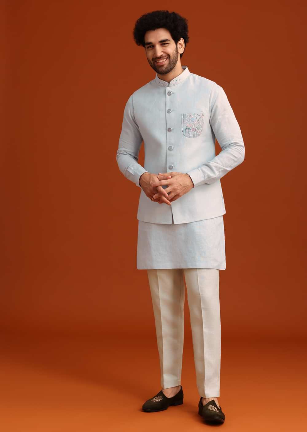 - It is styled with a mandarin collar and full sleeve design on rich linen base, making it perfect for festive ceremonies.